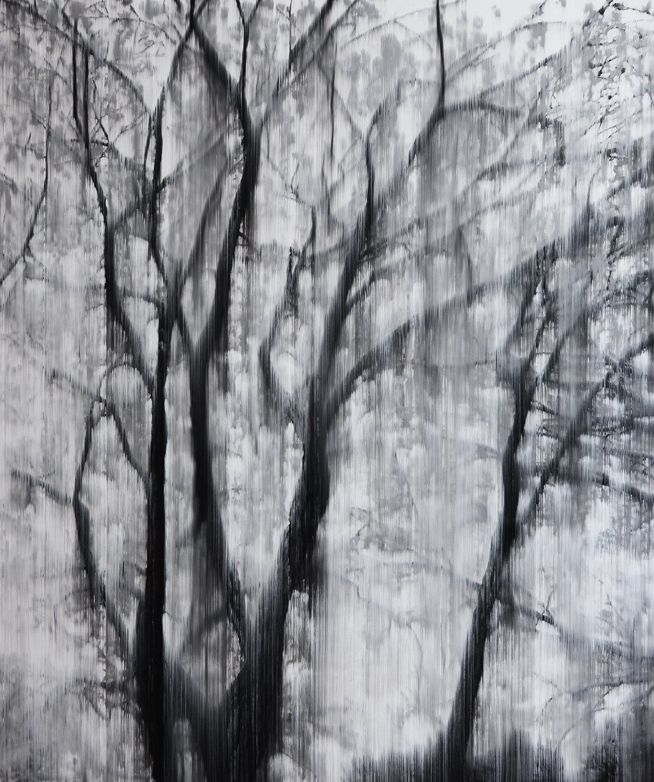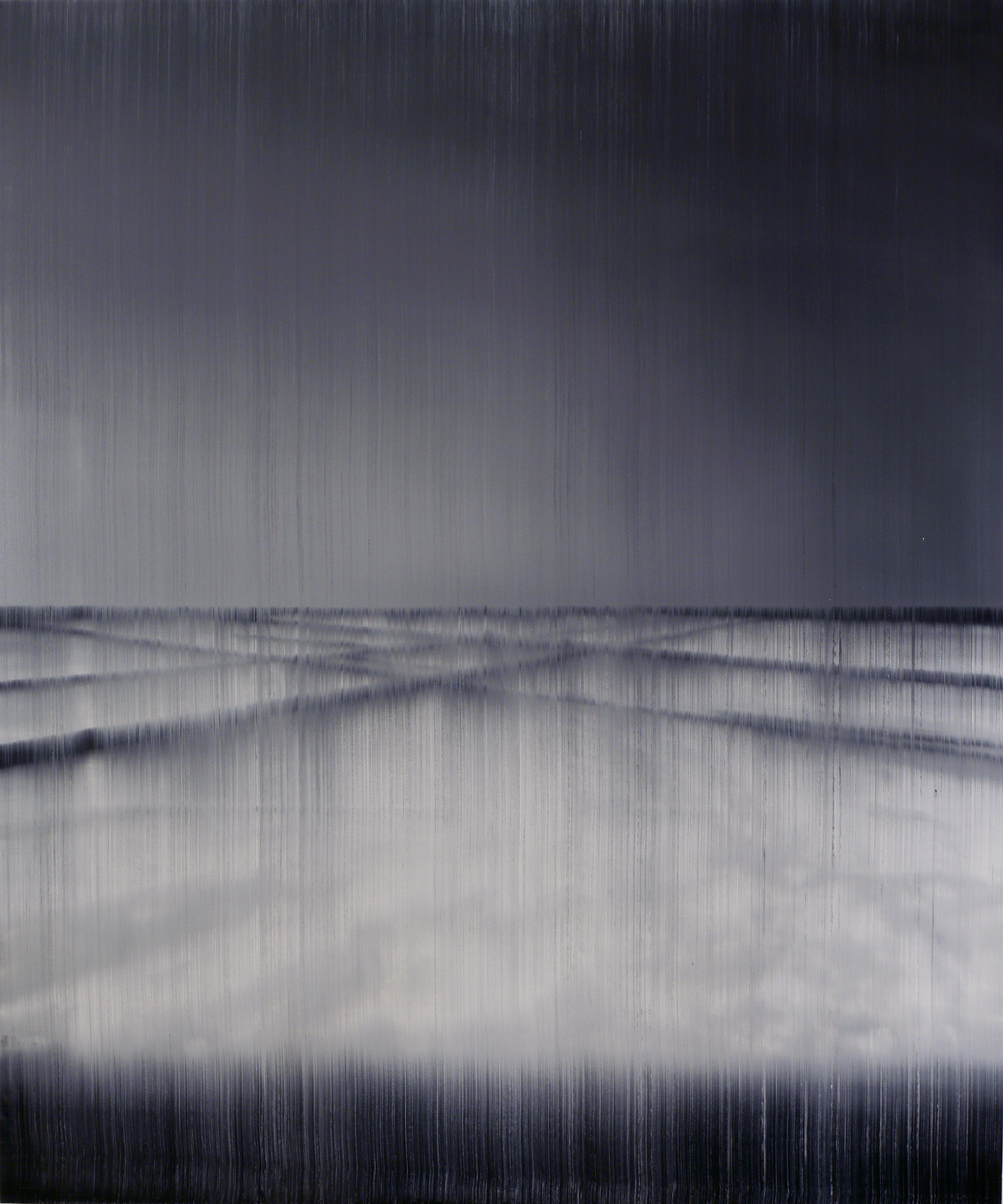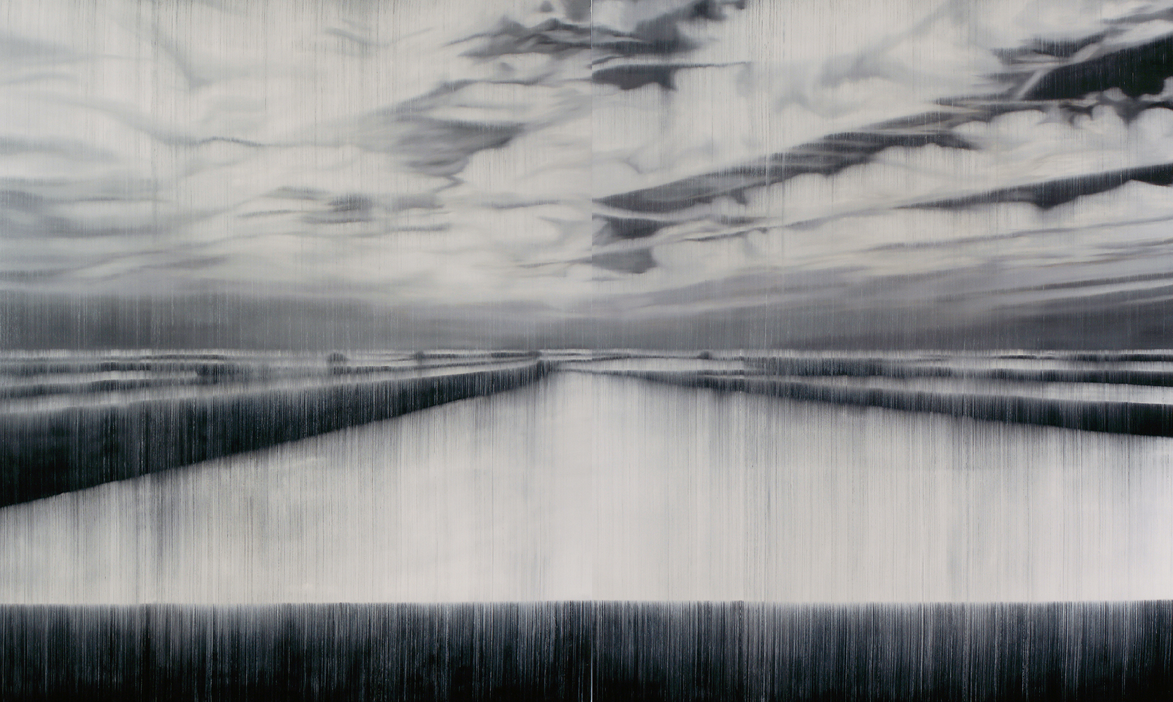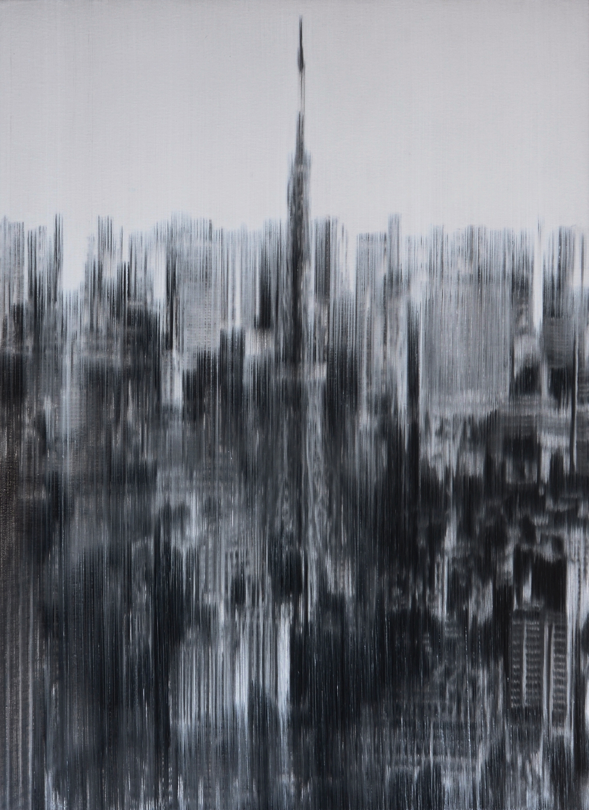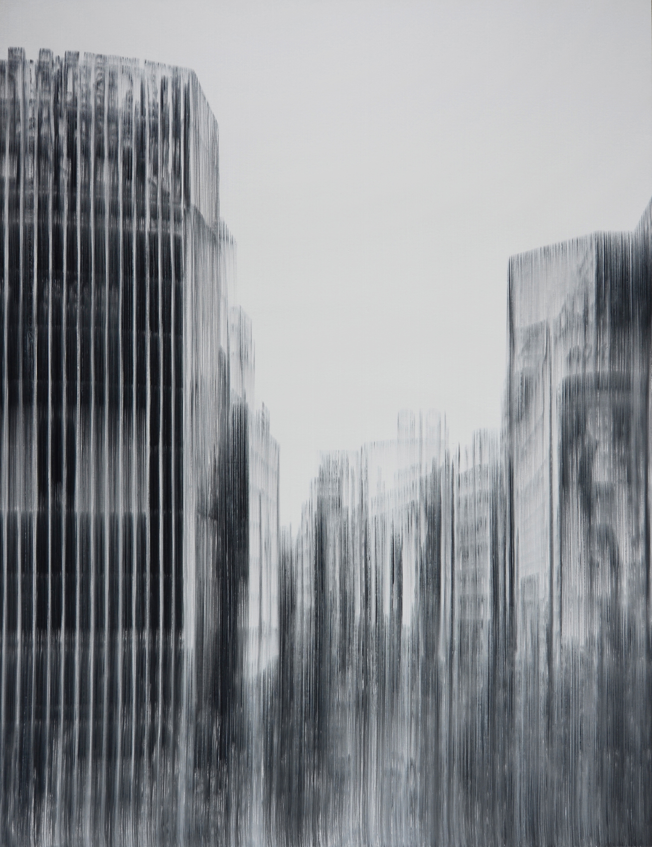 Emerging from a grey haze, cities become lost among towering skyscrapers, Mount Fuji appears marked with creases, and the Sahara fades away. Japanese cherry trees, seen by the artist as a symbol of order, gain in depth. Facing an infinite horizon, Akihito Takuma distorts perspectives and reveals, from underneath abstract marks, the appearance of white streaks. His canvases are an experimentation ground but, contrary to the apparent disorder, this is about a return to equilibrium for Akihito Takuma, an escape from the system.