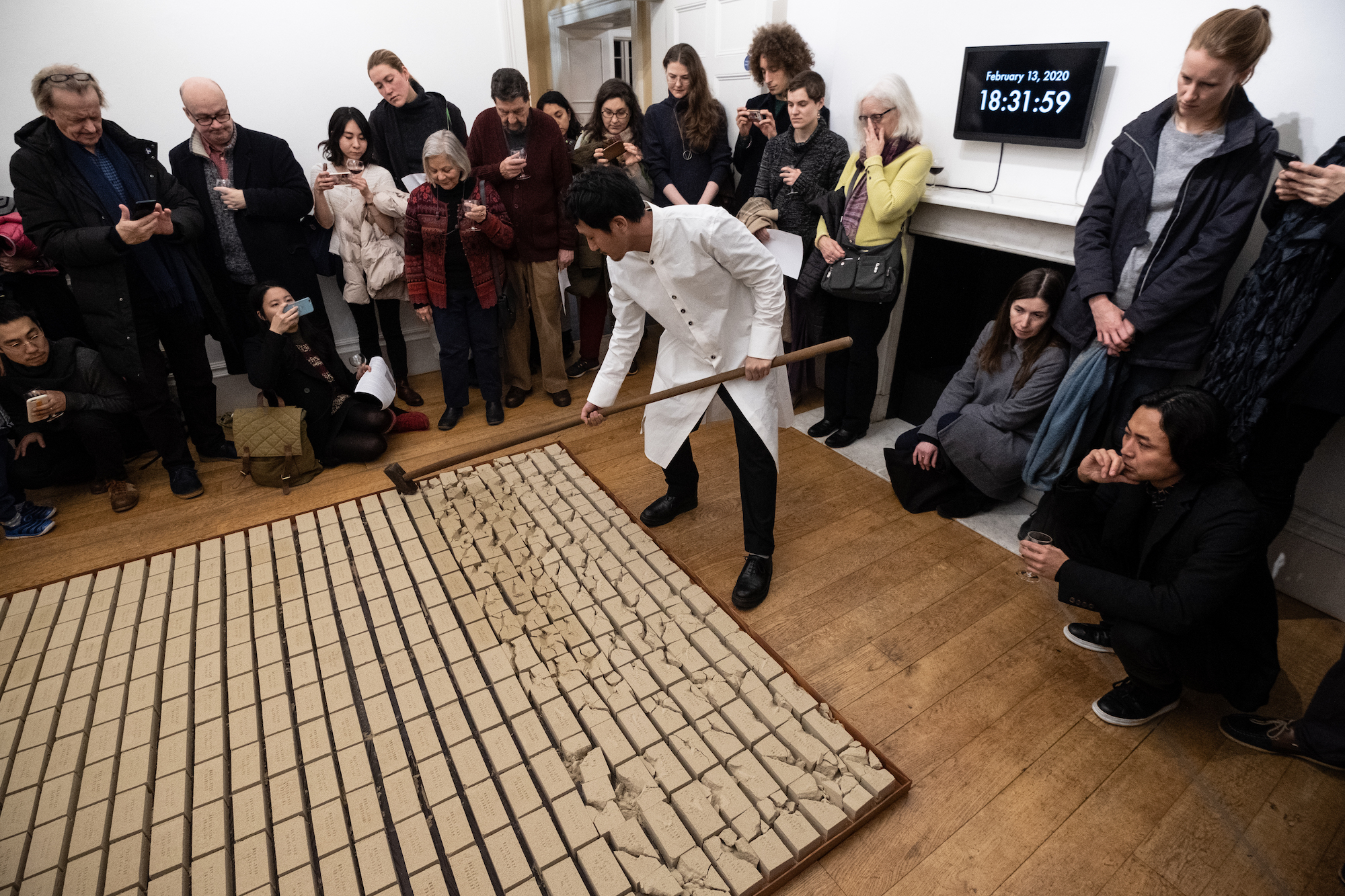 Within the same series, the artist methodically fractures row upon row of neatly arranged clay bricks with the rhythmic tapping of a metal hammer. The resultant patterns may appear random, but the pursuit of such organic lines and forms in fact stems from a childhood fascination with the shapes found in nature.