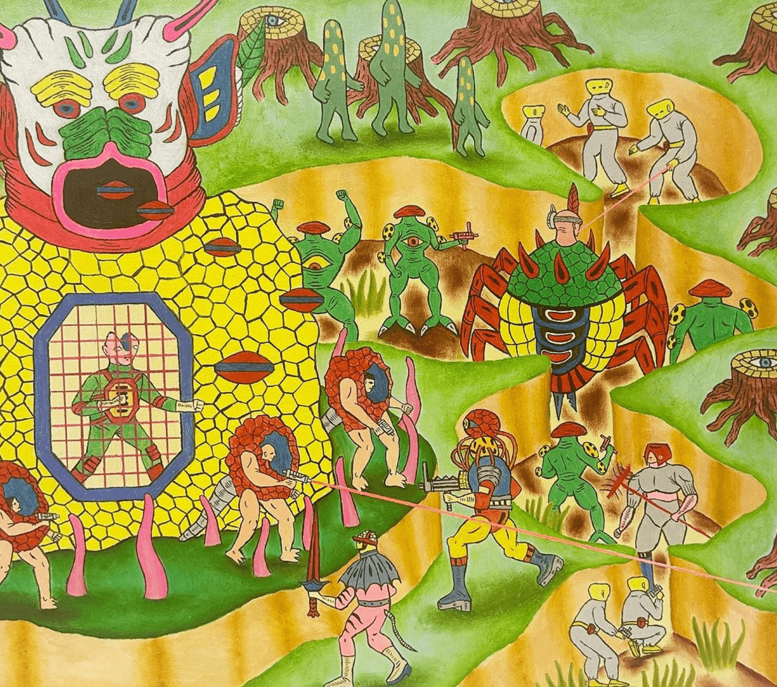 In these colourful and cluttered paintings, mysterious landscapes teem with aliens, monsters, and the occasional human.