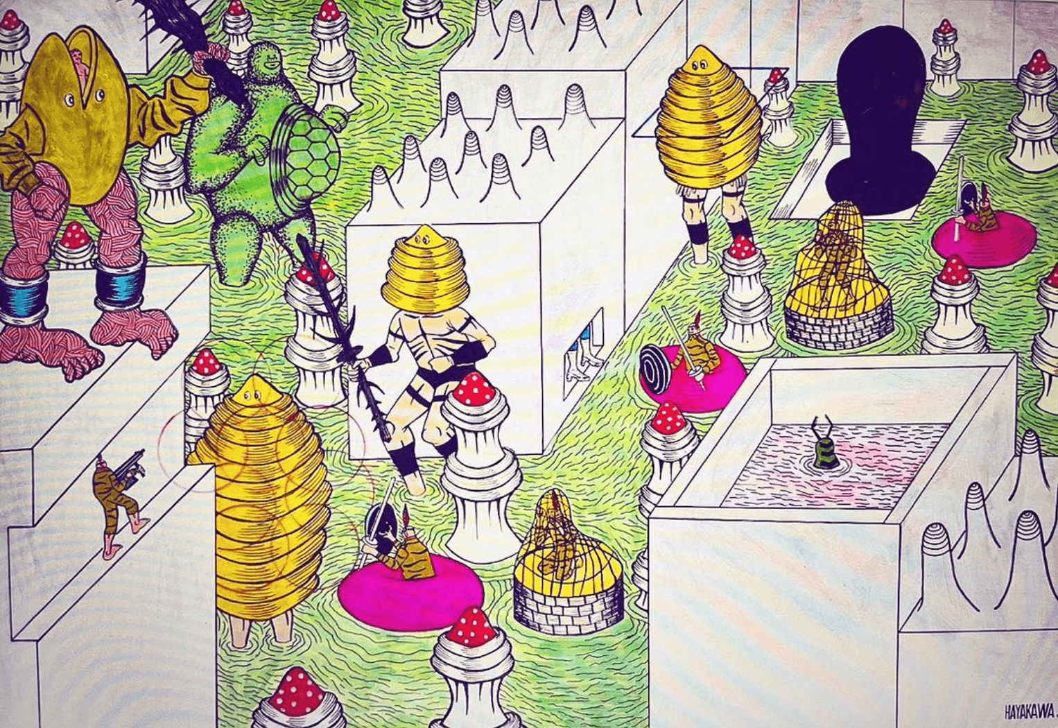 Born in 1974 in Yamaguchi prefecture, Motohiro Hayakawa is a Japanese illustrator and artist, notable for his bright, nostalgic acrylic paintings and rough pencil drawings. The latter, typically depicting oddly transfigured human faces or strange creatures, often bear traces of erased marks, lead smudges, and even crumpled paper. Both mediums recall the anarchic styles of his heta-uma (‘bad-good’) forebears associated with the avant-garde 70s manga anthology Garo. Defined more by a philosophy than a single unified aesthetic, heta-uma revelled in unpolished, subversive takes on manga and graphic design, often with dark and comic themes. Yet, to look closely at Hayakawa’s paintings, another set of influences has a much more prominent role.