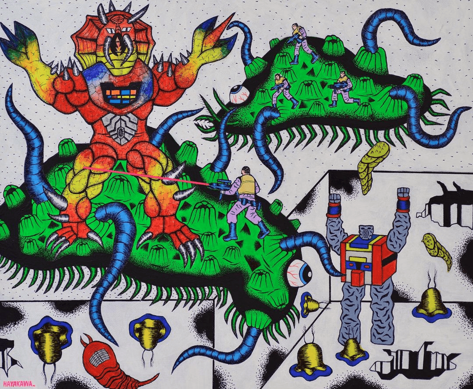 Descriptions of Hayakawa’s paintings in gallery brochures or articles inevitably allude to the strong influence of tokusatsu. Tokusatsu, literally ‘special effects’ in English, emerged as a major element of Japanese film and TV from the 1960s onwards, referring to live-action productions with heavy practical effects. In the west, perhaps the most well-known examples are the eponymous Godzilla, in the case of kaiju (giant monster) films, and Power Rangers, the American adaptation of Super Sentai, in the case of superhero television. Hayakawa’s paintings are heavily populated with visuals taken from both subgenres: giant scaled lizards, laser guns, spacesuits, and the like.