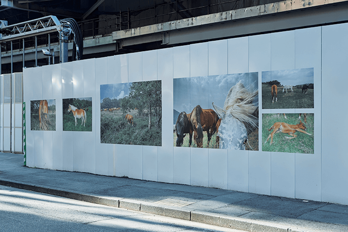 View of the T3 PHOTO FESTIVAL 2024. On the temporary walls of Yaesu Nakadori, Ayaka Endo’s series ‘Luminescence Land’, focused on horses photographed in the Tōno region of Iwate Prefecture, appeared unexpectedly in the heart of the metropolis.