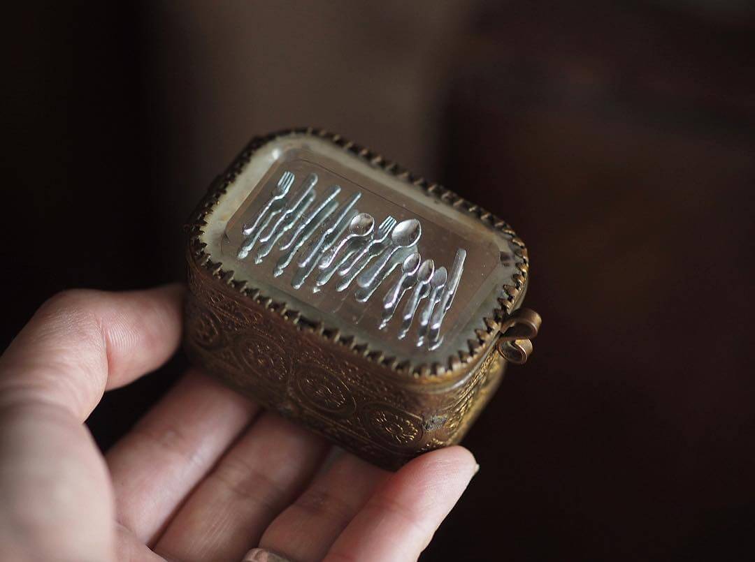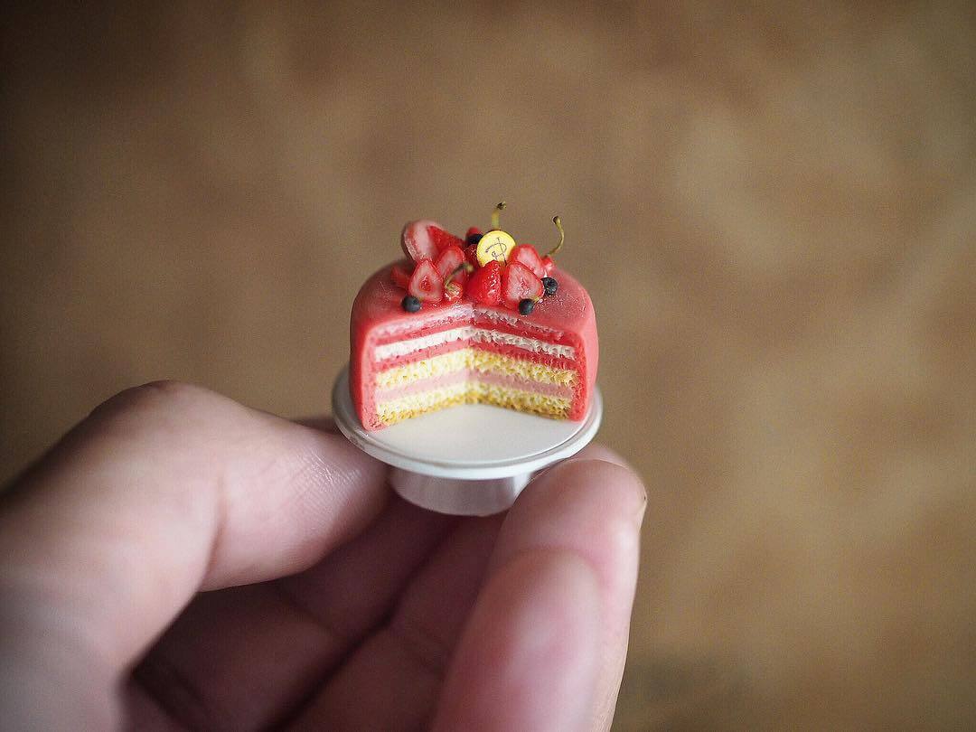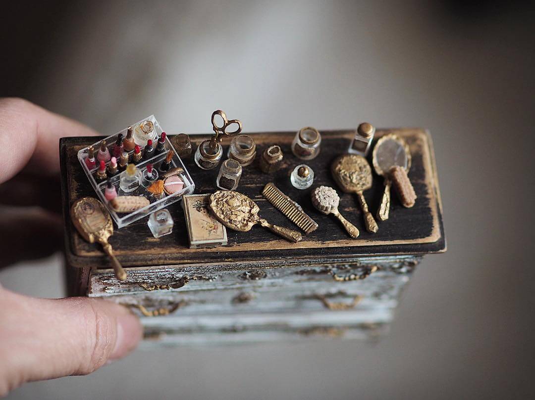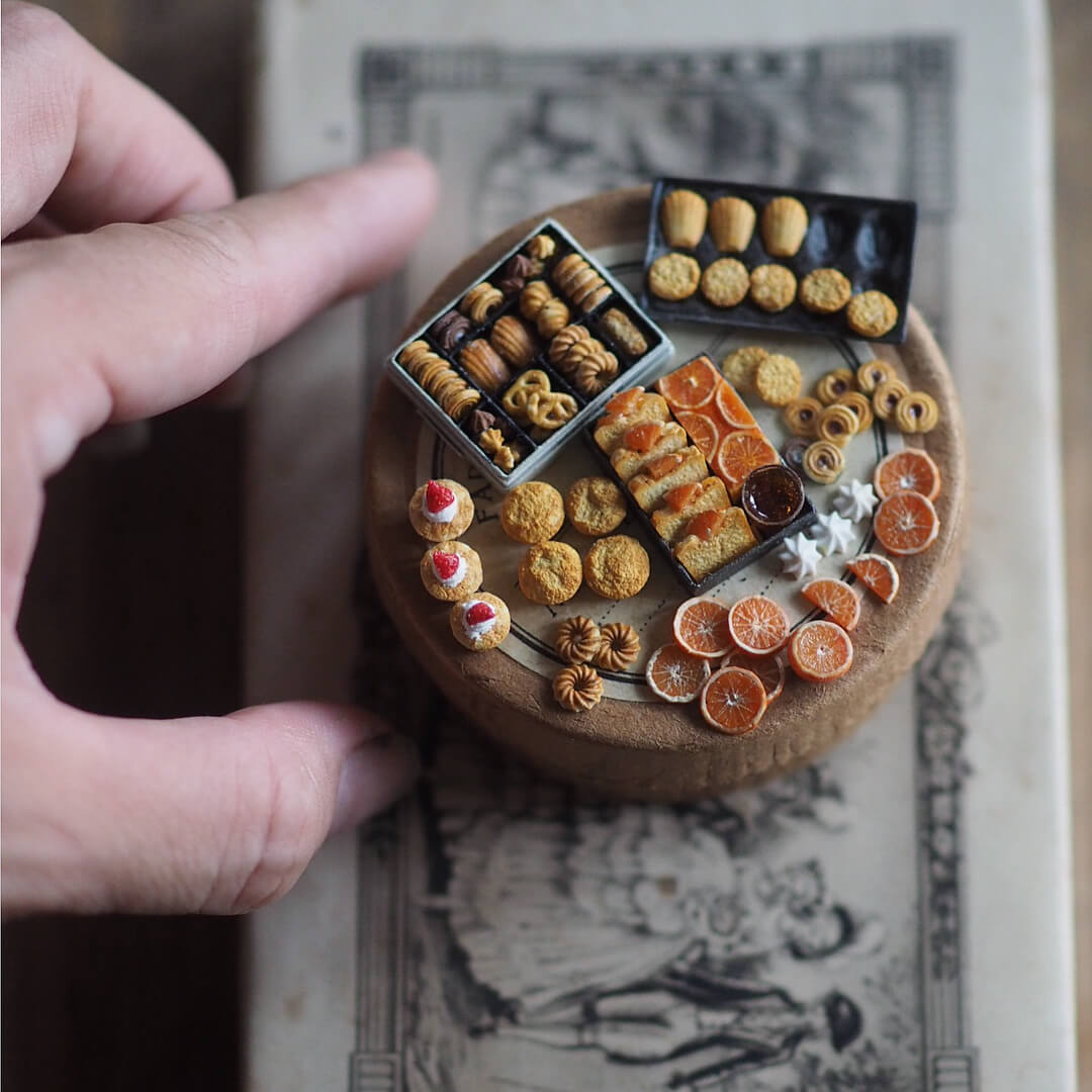Artist Kiyomi‘s painting practice is characterised by meticulousness and an extraordinary sense of detail, creating miniature replicas of everyday objects. By using various materials, such as wood, glass, steel or wax, Kiyomi shapes by hand vases, furniture or cutlery so small that they would not even fit a doll. She even cooks up tiny pastries that are so realistic that you might think they were edible.