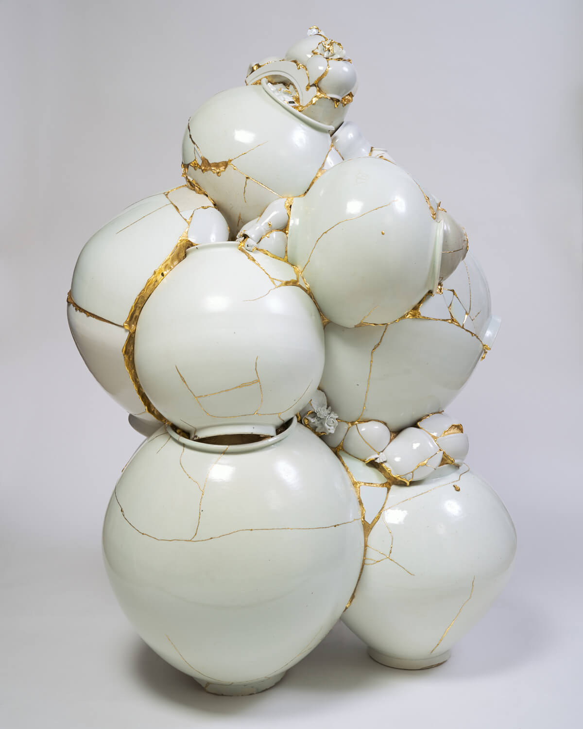 Beyond the dazzling visual result in 24 carat gold, each repaired object adheres to a positive philosophy which dictates that the cracks and scars of the past are not something to be concealed, but rather to be acknowledged and made beautiful. It is with this in mind that artist Yeesookyung assembles fragments of Korean objects to showcase the beauty of fragility and the imperfections of human existence. All of this is done in order to reconstruct the pieces of Korean history which, much like kintsugi, is fragile and delicate like ceramics, and strong and durable like gold.