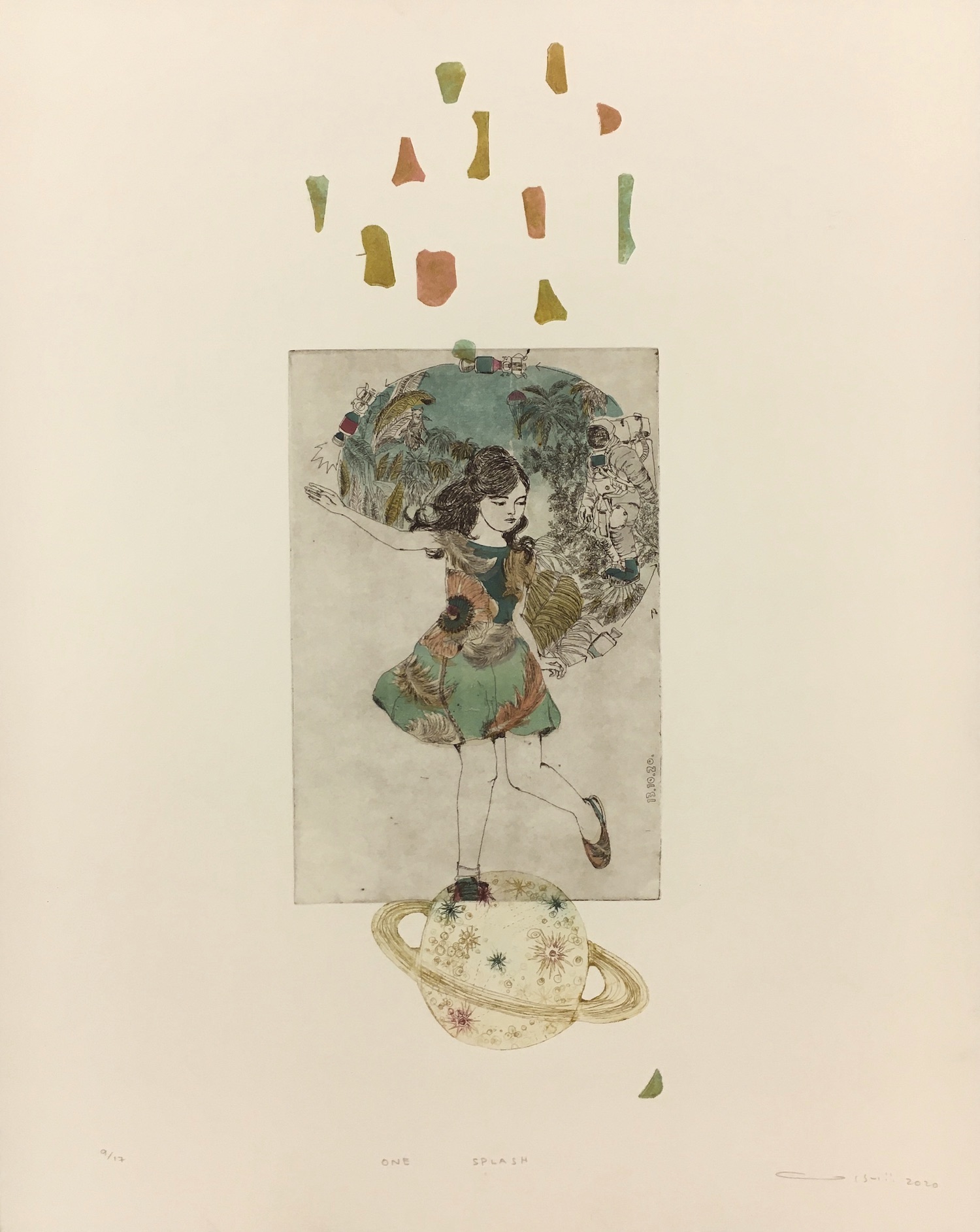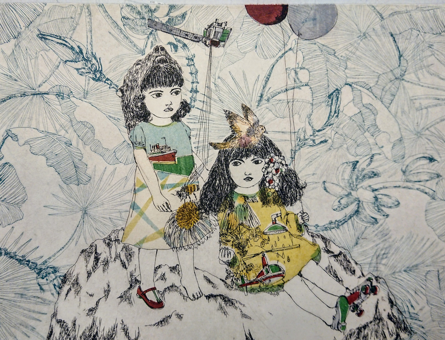 Atsuko Ishii‘s coloured etchings can be seen as delicate enigmas. Female figures, allusions to childhood, landscapes, and architectural elements come together in her engravings and present distorted fragments of current affairs and reality, ‘because I play with them’, she explains.