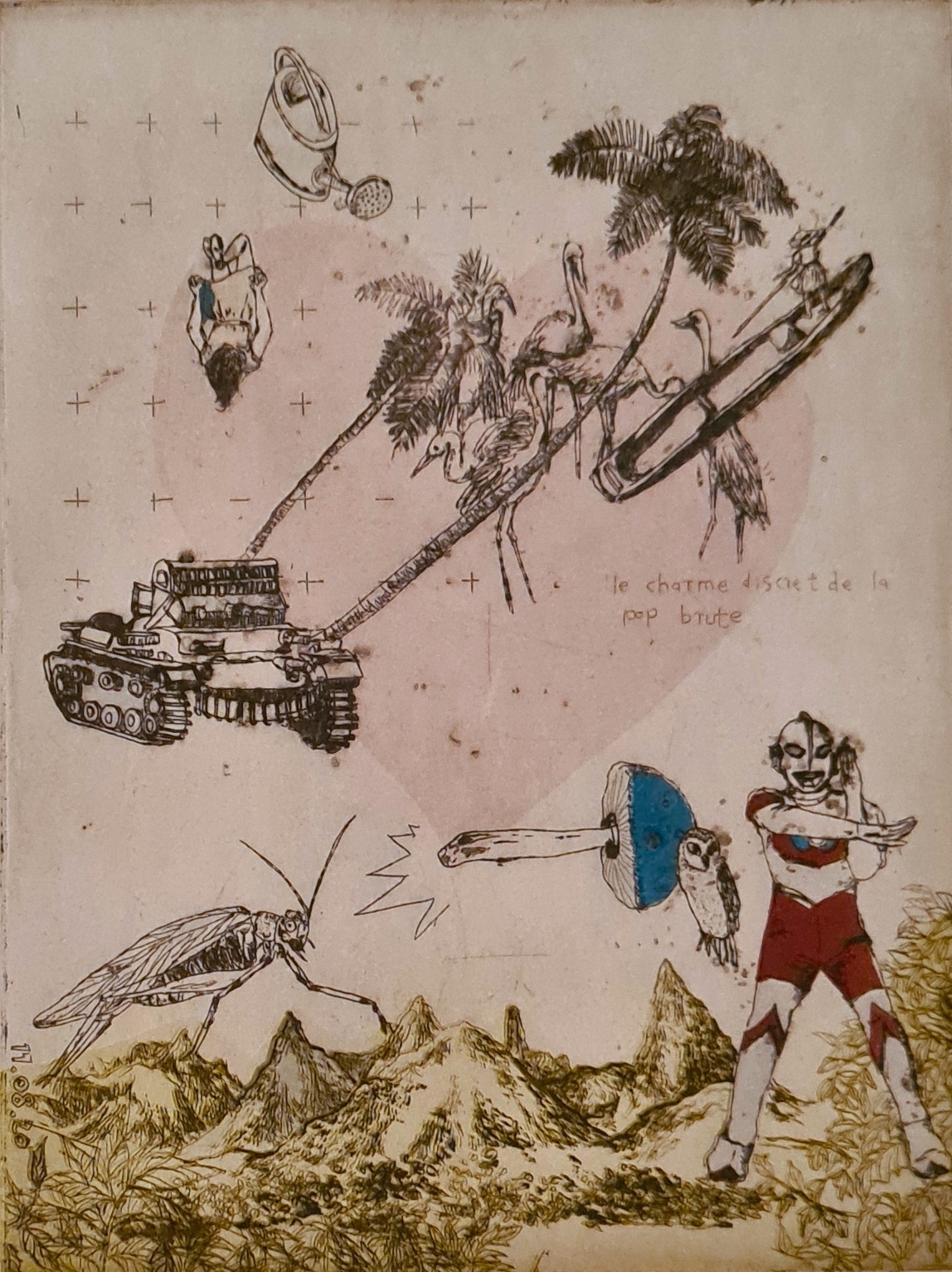 When creating her pieces, Atsuko Ishii very rarely draws, and considers her copper plate as a sheet of paper. She varnishes it, then attacks the thin layer to create detailed motifs, before soaking it in an acid bath. Once cleaned, the plate is coloured, and the artist decorates it using collages, stencils, and goffering. This painstaking work gives rise to delicate, surprising creations.