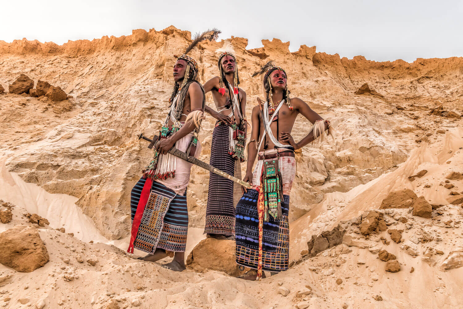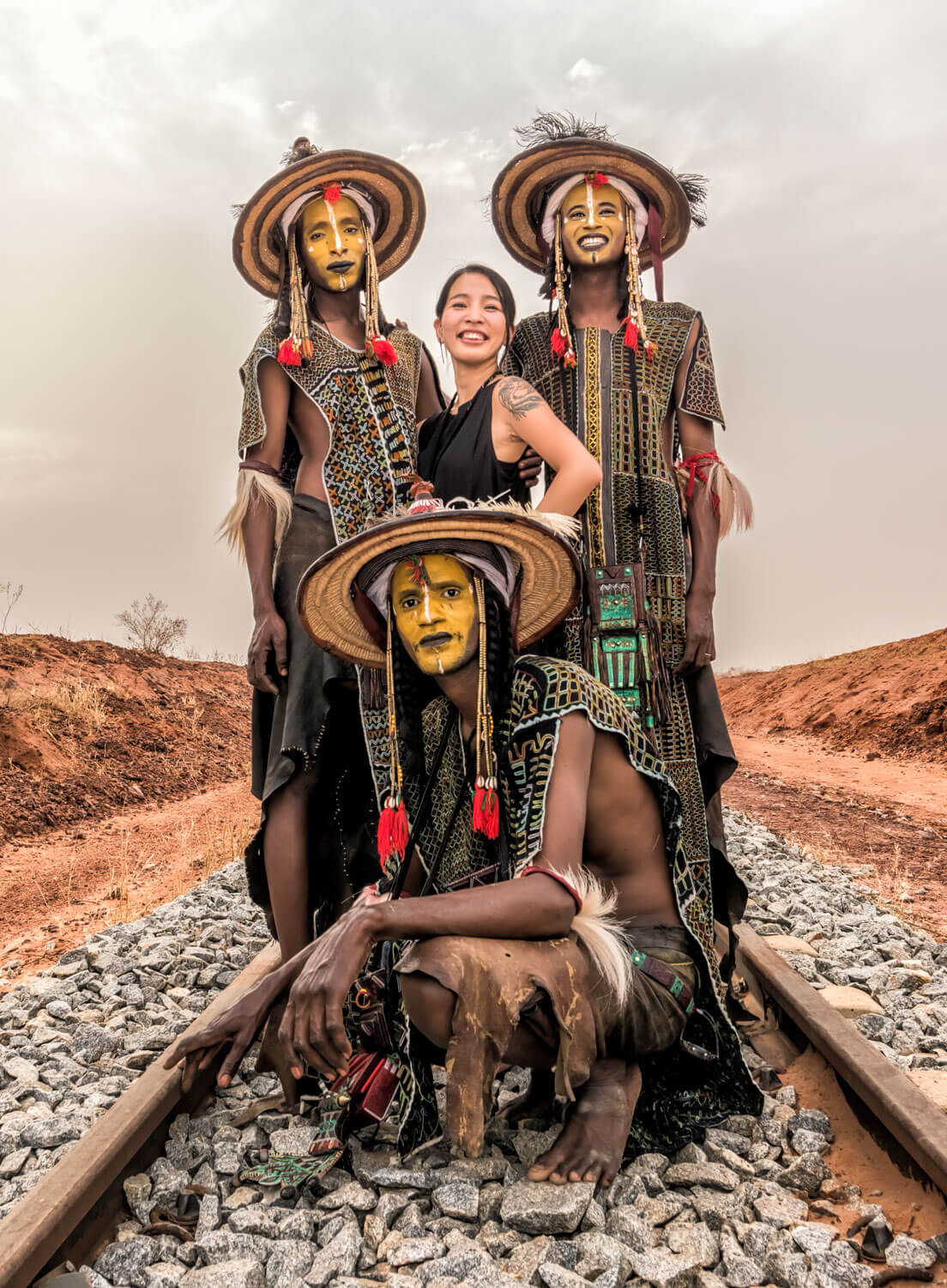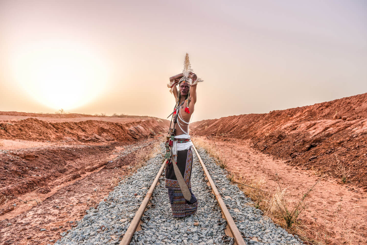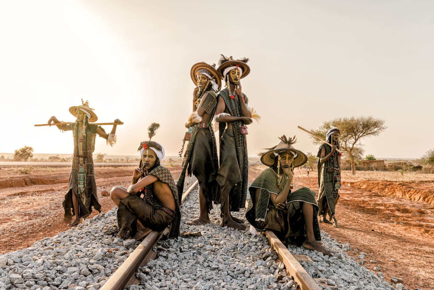Yoshida brought Bororo members to a location near Niamey, Niger’s capital city, to photograph against a backdrop of a lone railroad track in the desert.