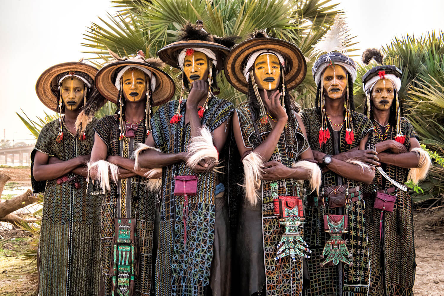 Straw hats, turbans, and headpieces with bags made from beads as they carry swords. ©Nagi Yoshida