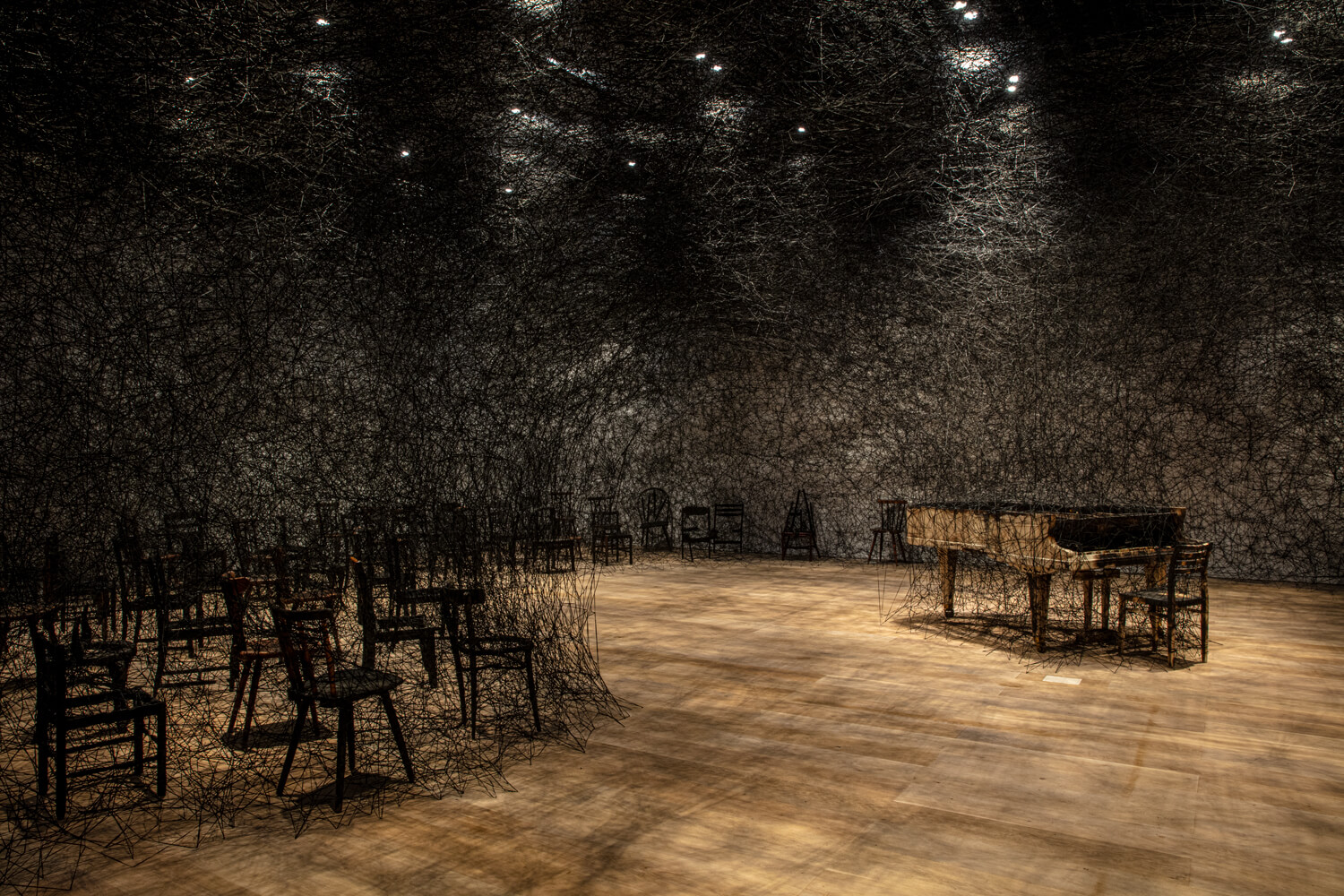 Rusted beds, dresses, old keys, windows, silent pianos… ‘existence in absence’, highlighting the memory of things, has always been her distinct theme. Shiota explores the breathing that can be observed in that absence, as if she were focusing on spinning a thread.