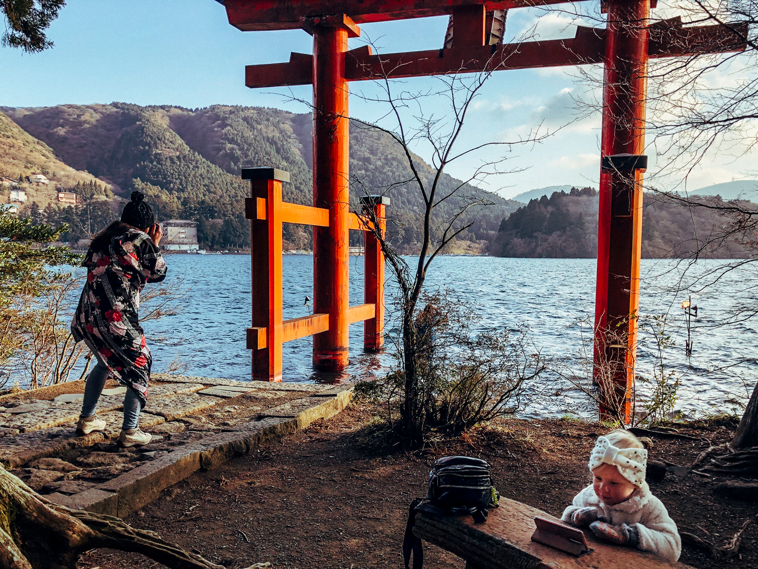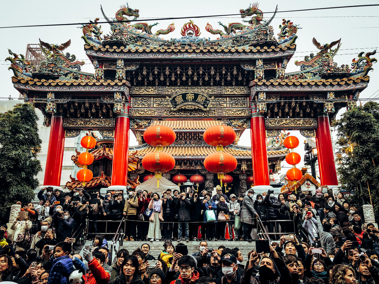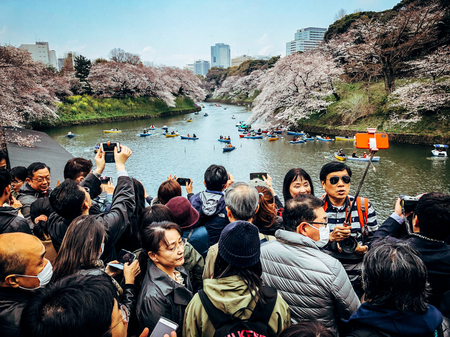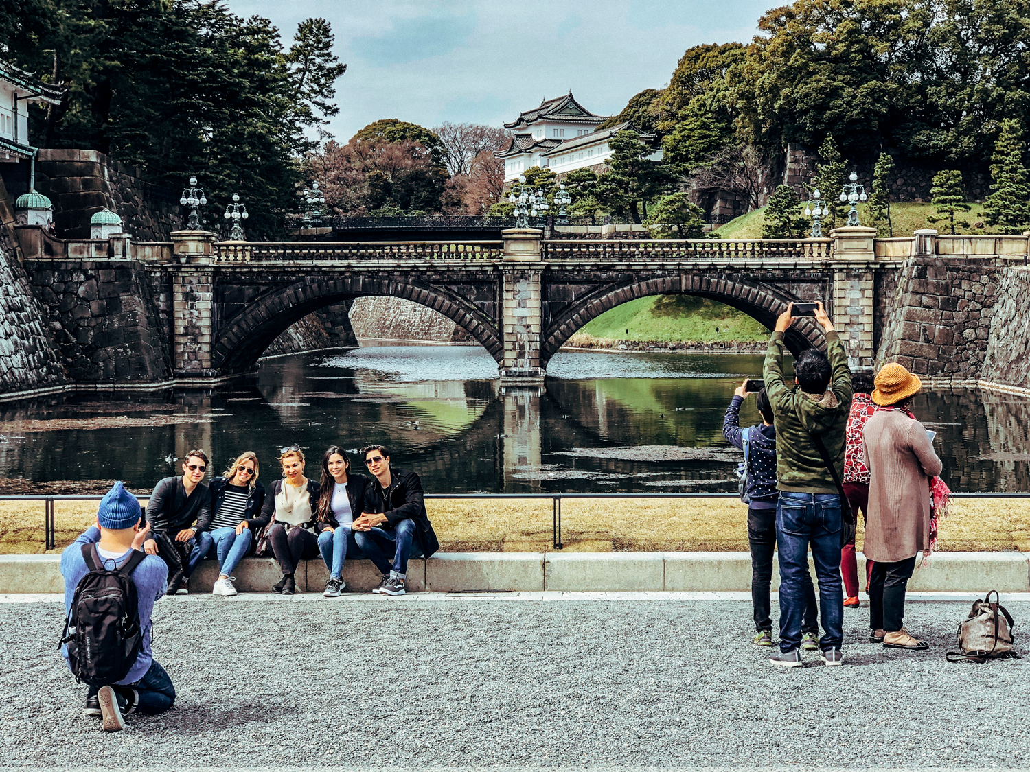 Hakone, Yokohama Chinatown, the great Kaminarimon gate of Asakusa, the Golden Pavilion of Kyoto or the Tsutenkaku tower of Osaka… So many emblematic touristic places, immediately identifiable by any Japanese person, from the north to the south of the country. Places that have themselves become ‘cliché’, like postcards from souvenir shops. And yet, it was enough to have them photographed by Daisuke Ito to find something strange and new in them. A visual shift born of unexpected details, which have inadvertently slipped into the frame: a baby sitting in front of his iPhone in the foreground of a torii or a Shinto shrine, a couple posing among cherry trees in bloom. Or even a group of bantering foreign tourists proudly carrying a camera. The scene conveys the excitement, the ingenuous enthusiasm of these travellers, as much as it astonishes. Daisuke Ito captures the seriousness and conviction with which foreign visitors photograph Japan’s tourist hot-spots before arranging his pictures as if they were tourist guides themselves.