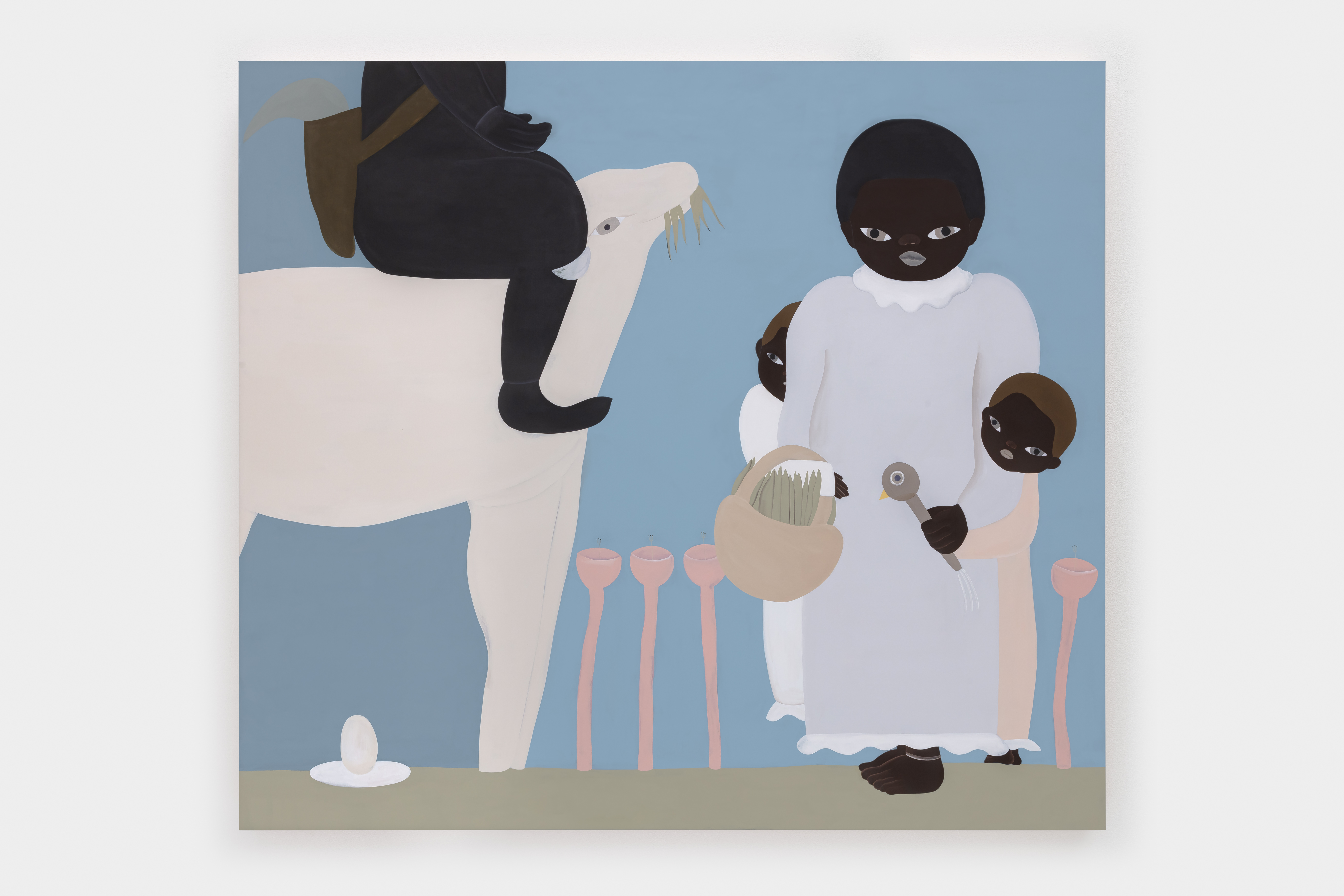 Although at first glance the androgynous, childlike figures depicted by the artist might appear to be the same ‘style’, this apparent uniformity vanishes when taking a closer look at the details of the attitudes, environments, and symbols presented. These similar faces become unique; their glance may conceal a mood, a message, the meaning and detail of which are left open to the viewer’s interpretation. Alongside animals—which also suggest biblical references—the figures evolve in a way that is unaffected by the passage of time, similar to our own dreams, and look at the viewer with a benevolent eye, inviting them into a dreamlike atmosphere that draws on their own experiences.