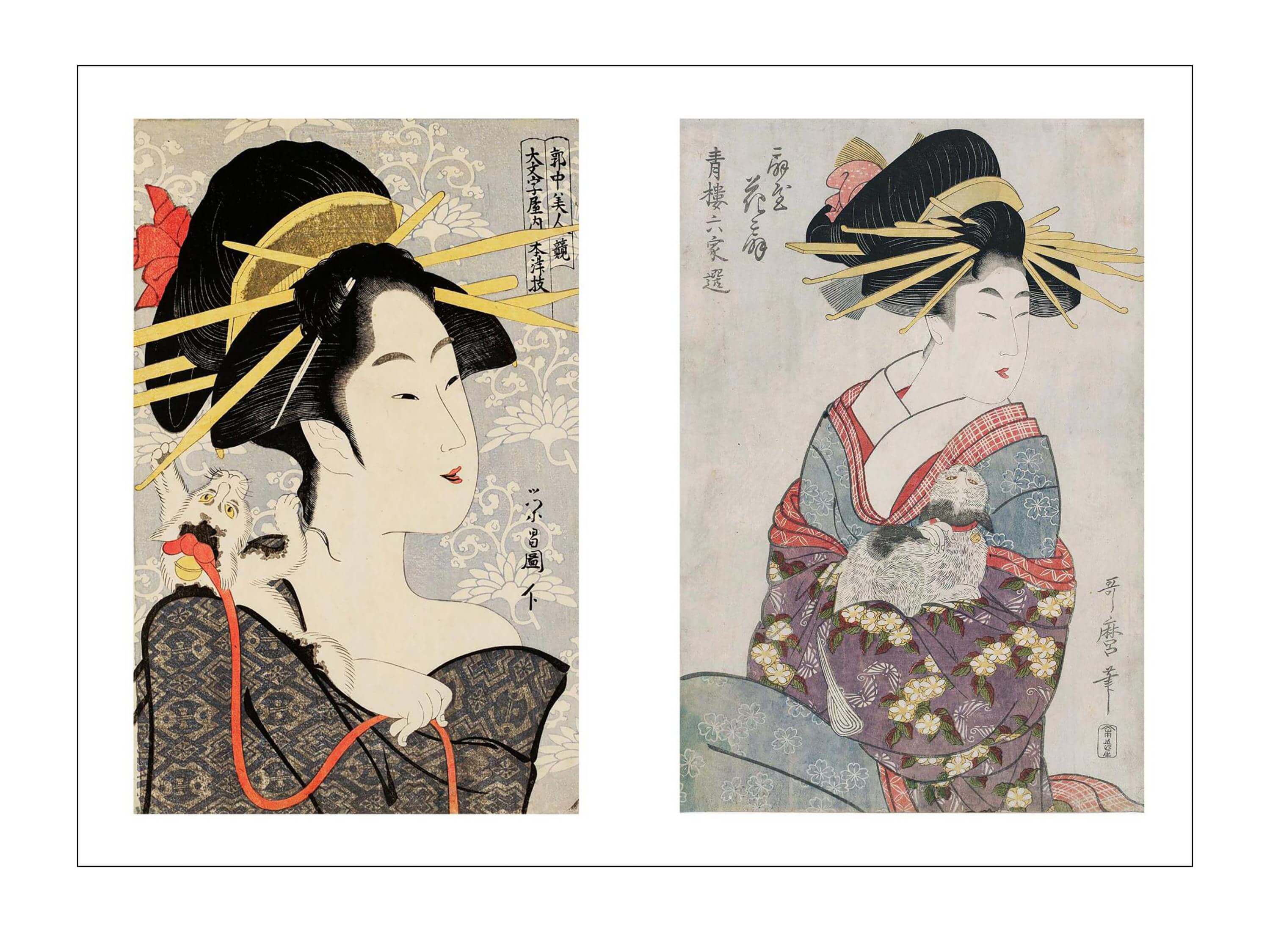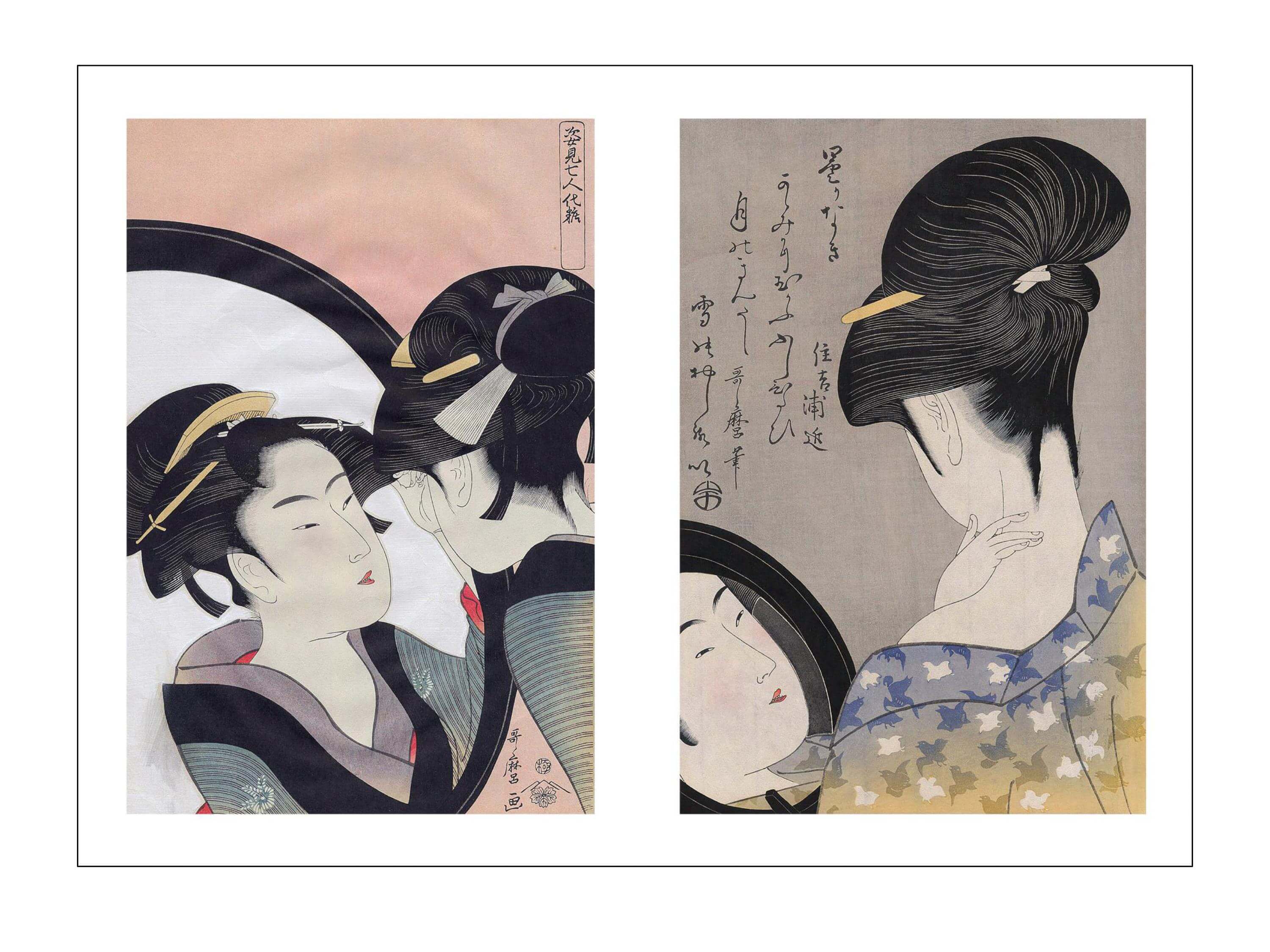 These engravings, most of which depict courtesans, but also young girls and mothers with fine features, a proud bearing, and delicate gestures, are known as bijin-ga, which translates literally as ‘beautiful people’, even if in reality, they only represent women. This artistic genre, popularised at the beginning of the Edo period, achieved great success with the chonin, members of the new urban and merchant bourgeoisie.