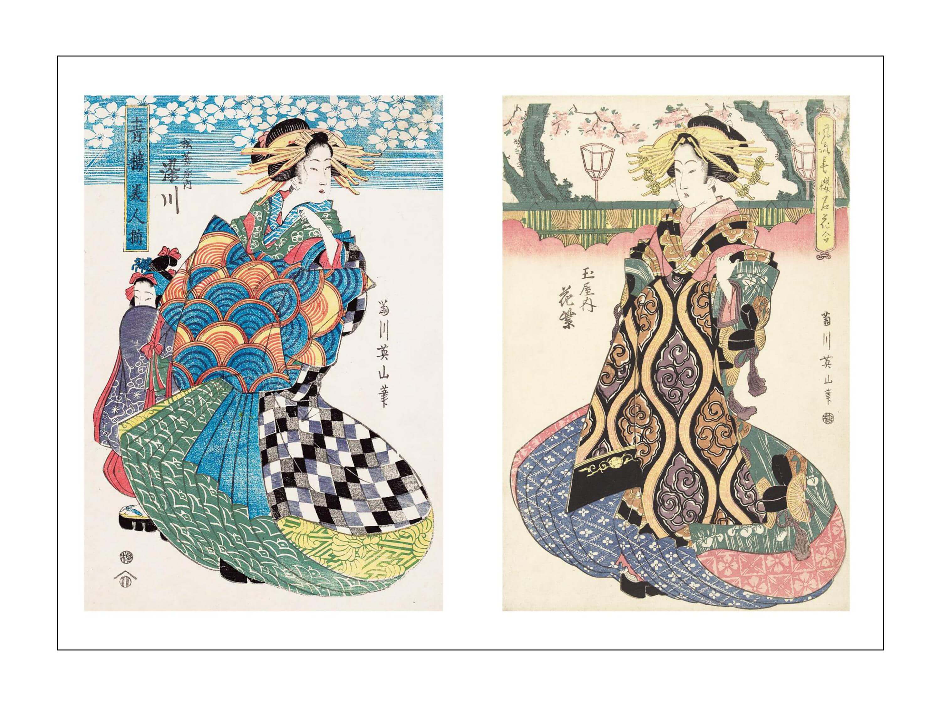 The book, with its multiple pieces reproduced in leporello format—a layout where the images appear on sheets folded like an accordion—extends to infinity. The reader can admire the work of the most iconic figures in engraving, such as Katsushika Hokusai, Kunisada Utagawa, and Utamaro Kitagawa, in which, in addition to reproducing the perfect beauty of women, particularly close attention is paid to details: the delicate colours of the kimono, the refined hairstyles, and the richness of the outfits worn by the courtesans.