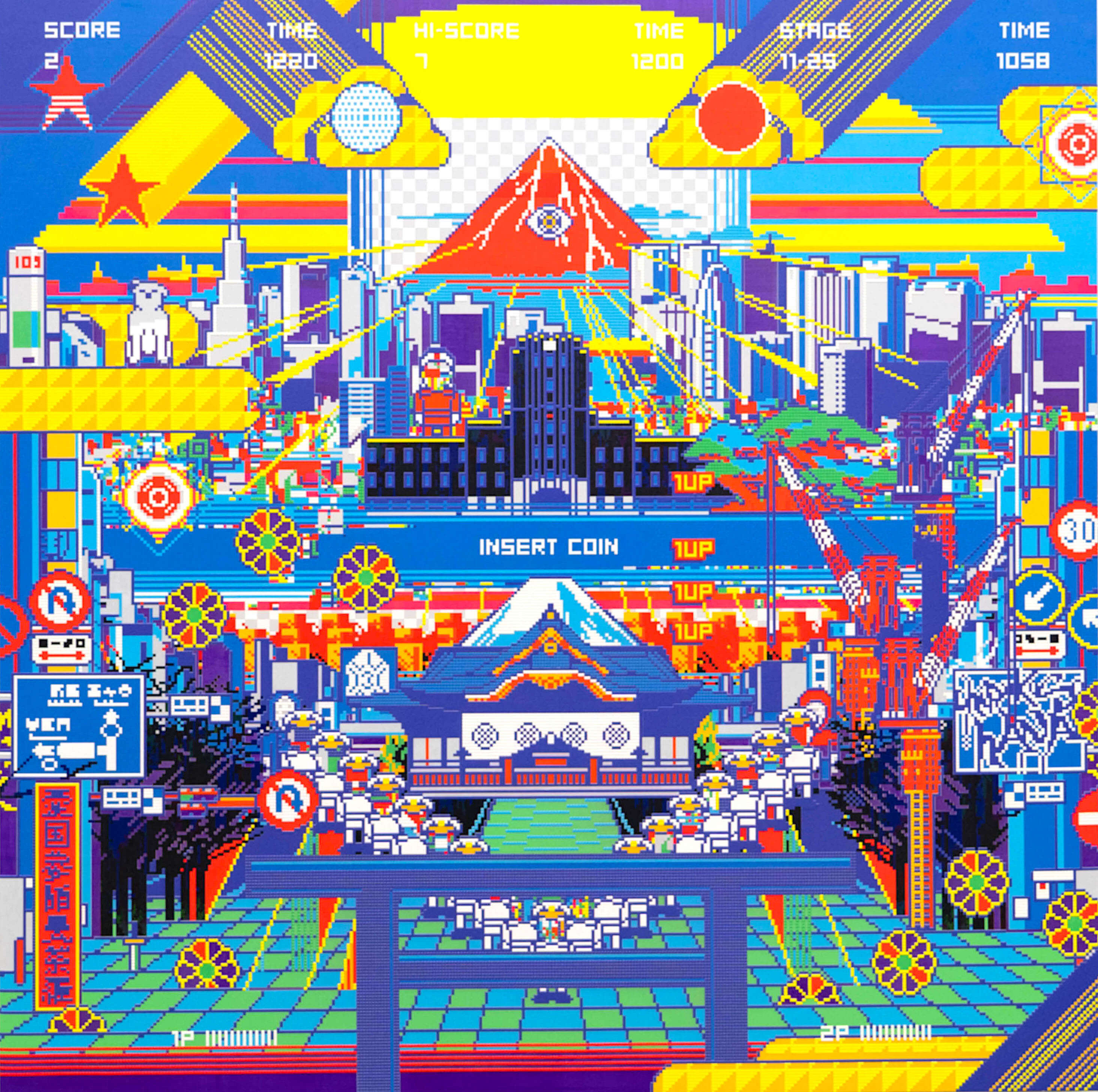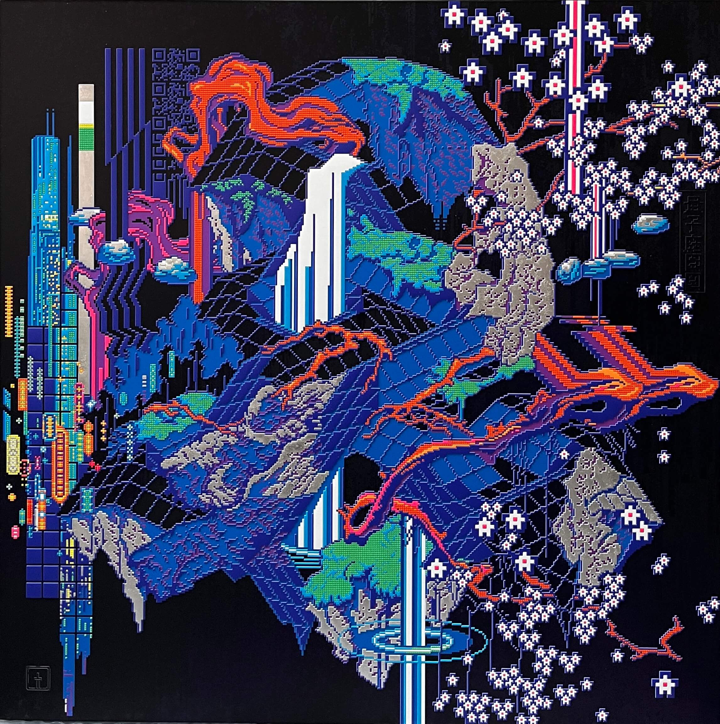 ‘Our collectors are not necessarily well-versed in Japanese culture,’ explains Julien Sato. ‘However, many are drawn to urban art, which shares common ground with pop culture.’ Some of these collectors are also deeply involved in the crypto and metaverse spheres, making them particularly receptive to works inspired by gaming culture—an aesthetic explored by the artist collective EXCALIBUR. Their pixel art compositions, often in 8-bit style, pay homage to the golden age of 1980s video games, blending gaming motifs with modern urban landscapes. The group describes this new movement, emerging in the wake of Takashi Murakami’s generation, as ‘meta-bit.’