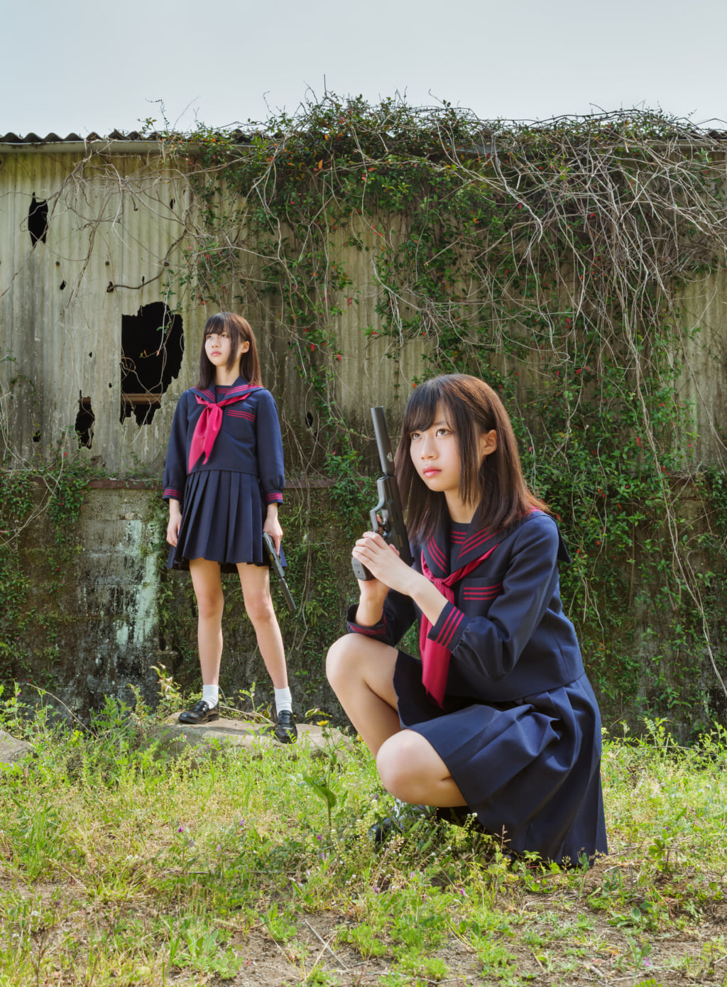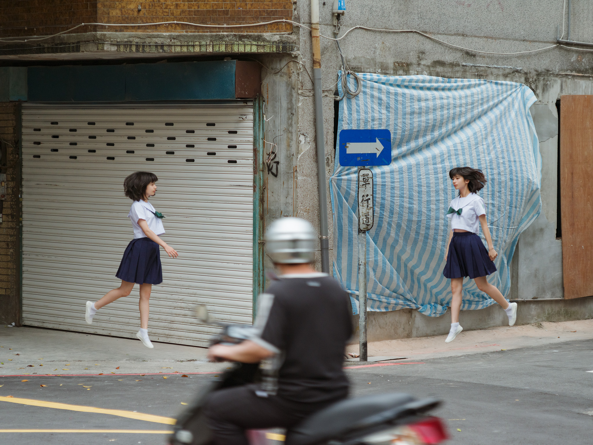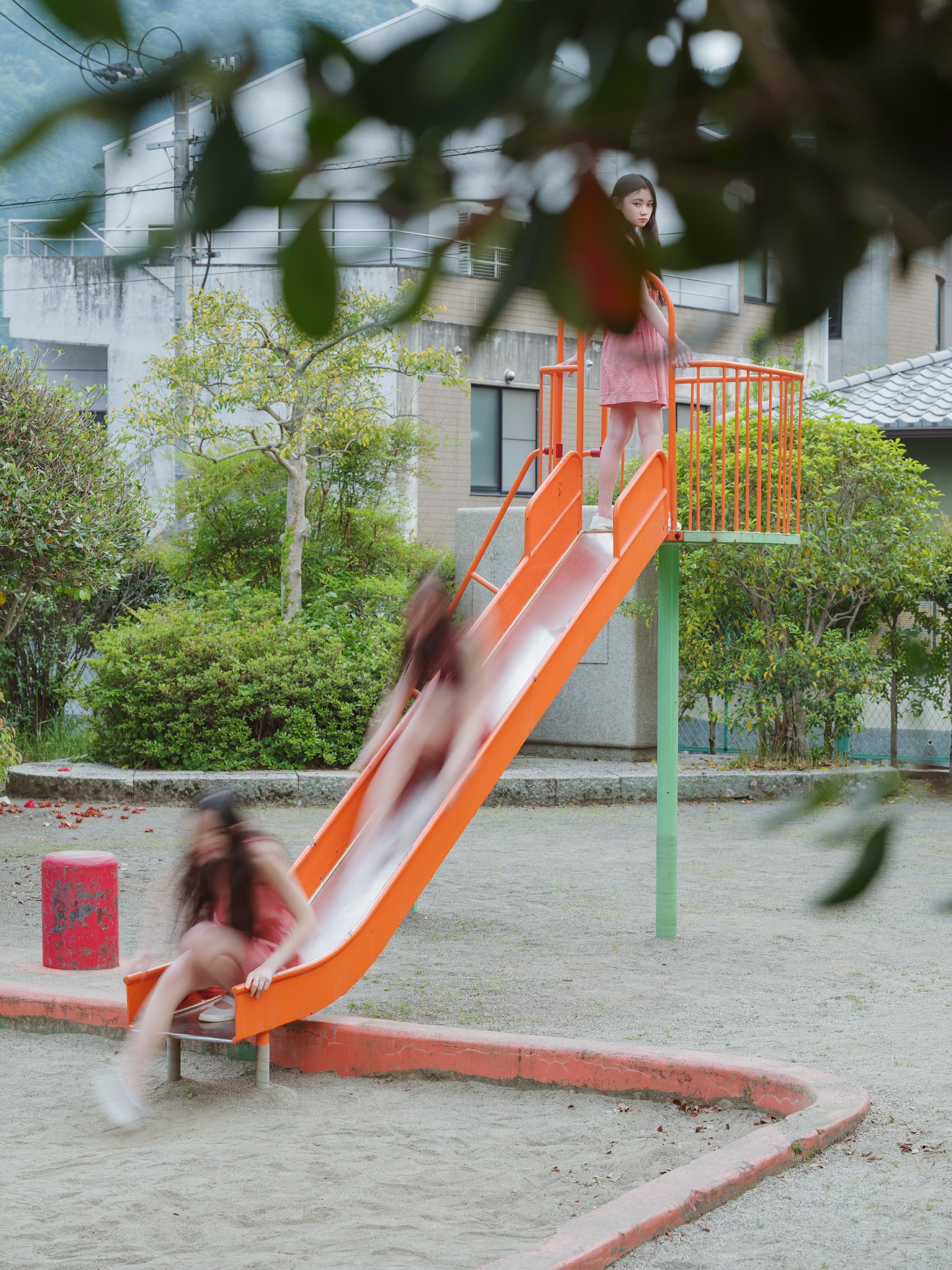 In order to contrast with the regular stereotypes linked to youth, Hisaji Hara and Natsumi Hayashi have created a series within a series. The girls are photographed multiple times, as if they were twins or triplets. They be can seen in multiple scenarios, with various postures and attitudes, allowing the viewer to interpret the poses and the interplay between subjects. The anonymous models have no brief; their backdrop the city of Beppu, they are free to chose the staging of the images as well as their outfits. ‘They curtail their own tendencies toward insolence, are sympathetic to the weak, despise lies and deceptions, and show affection for all without prejudice,’ explained the artists in a presentation of the series at the Tokyo Photographic Art Museum in 2020.