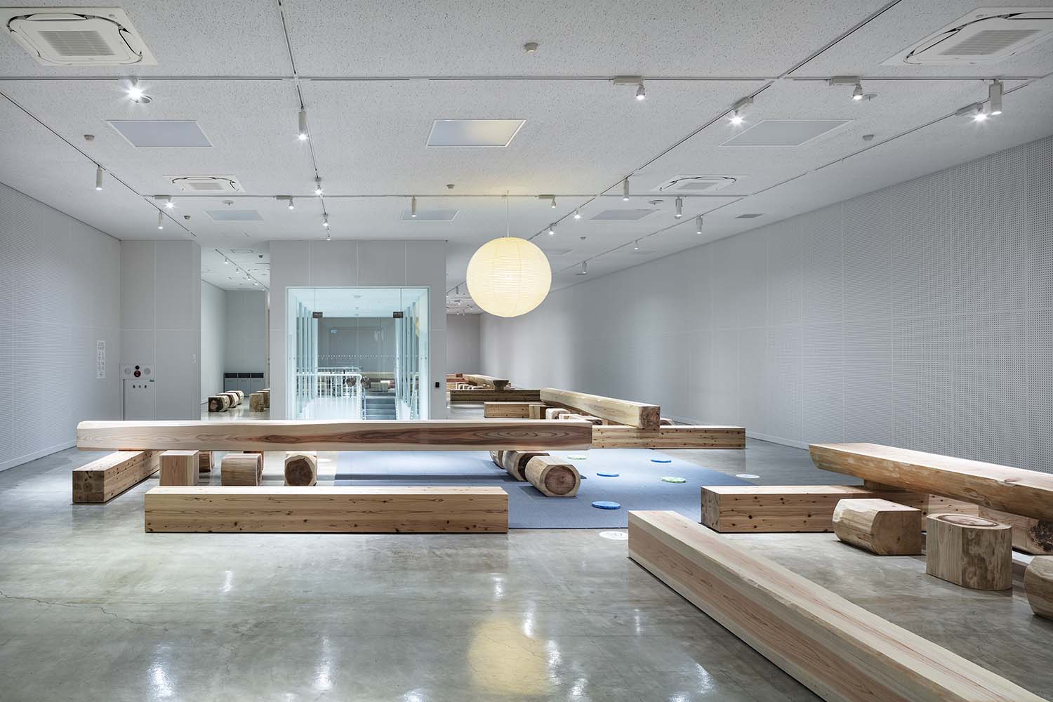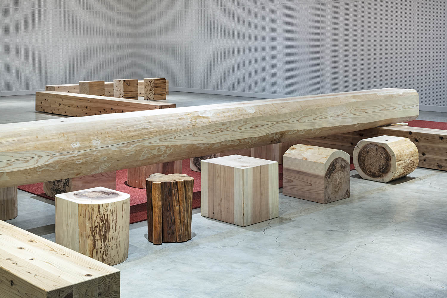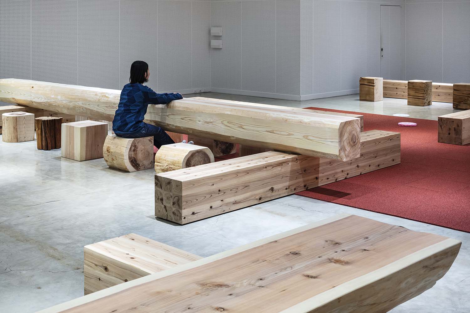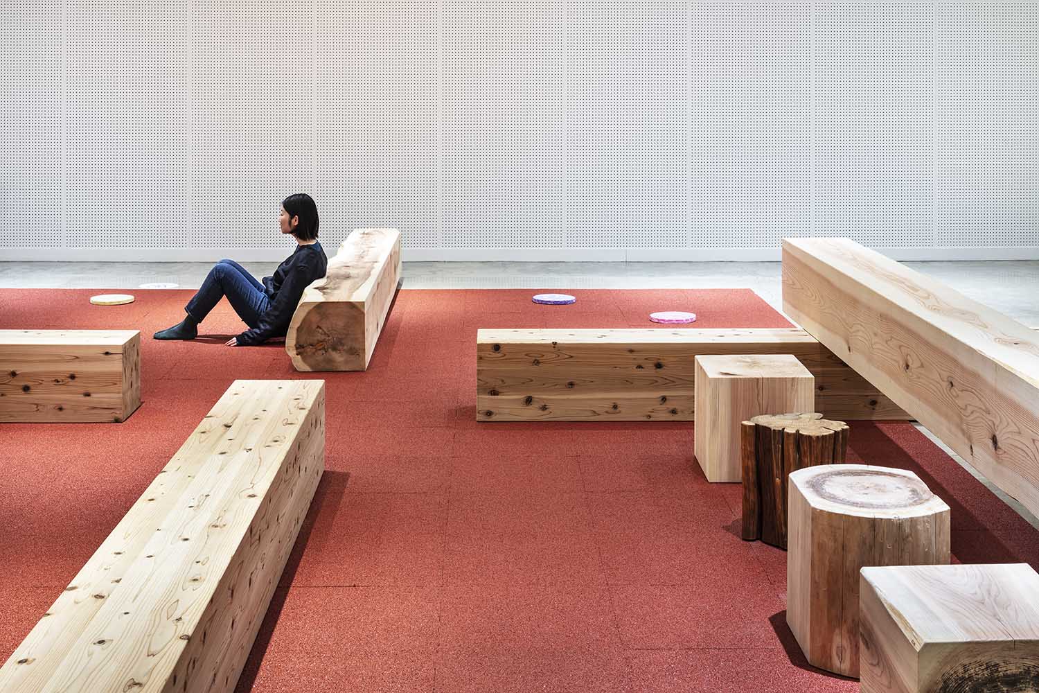 They are set out to act like benches in the space, where visitors can sit and take a break, or like long tables surrounded by log stools where they can have lunch. TORAFU ARCHITECTS also created spaces covered with large rubber carpets where visitors can lie down before continuing to explore the museum.