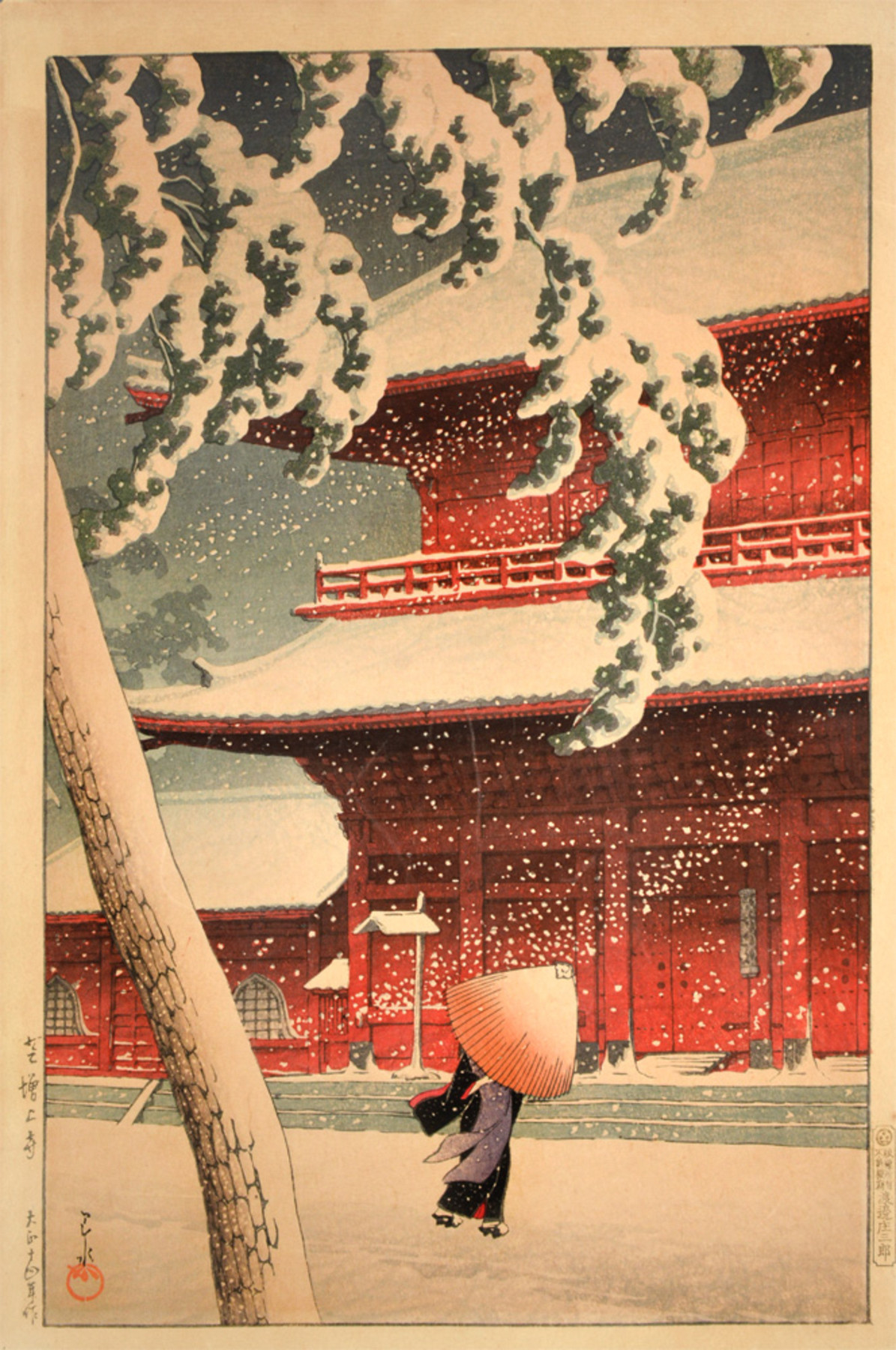 In 1956, one year before the artist passed away, the Japanese government awarded Hasui Kawase the title of Living National Treasure for a print from 1925 that depicts Zojo-ji Temple in Shiba in the snow—a place where six of the Tokugawa shogunate are buried.