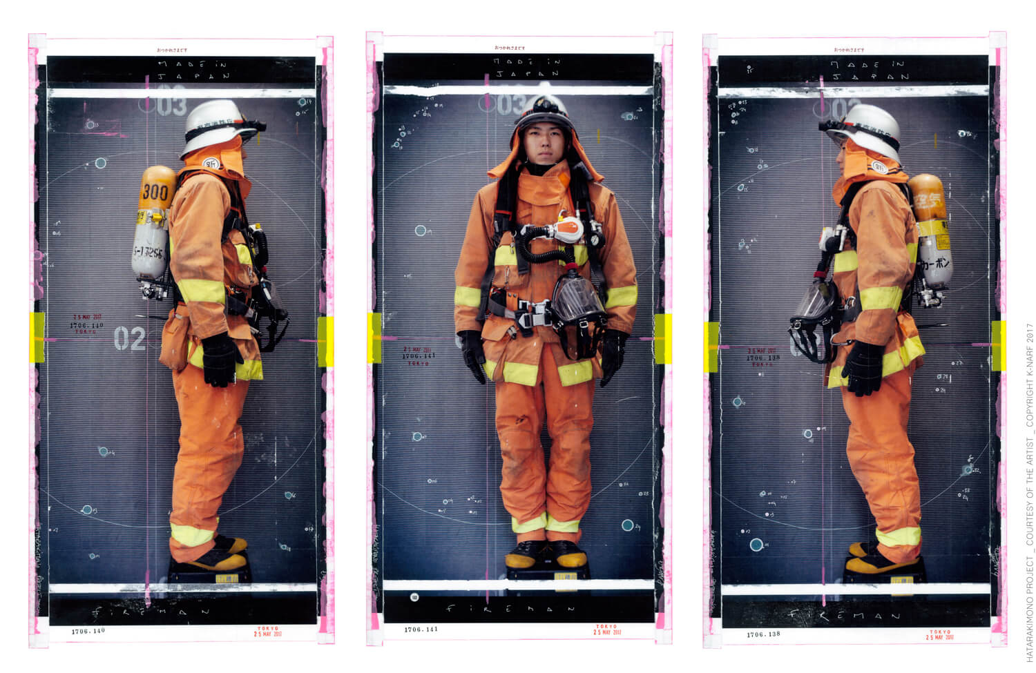 ‘Everything is very codified in Japan, so the longest and most complex part of the project was to get the authorisations. The workers were not hard to find and gladly agreed to pose. But they had to get their company’s approval; each company would release their employee for a few minutes, just long enough for me to take front and side shots. Shoko, with whom I carried out the whole project, was admirable and supported me in each of these steps.We work together like the artists Jeanne-Claude and Christo, and she is the one who asked for and obtained the authorisations, even those I thought were a lost cause, like the Ministry of Civil Security who authorised us to photograph the firemen.’