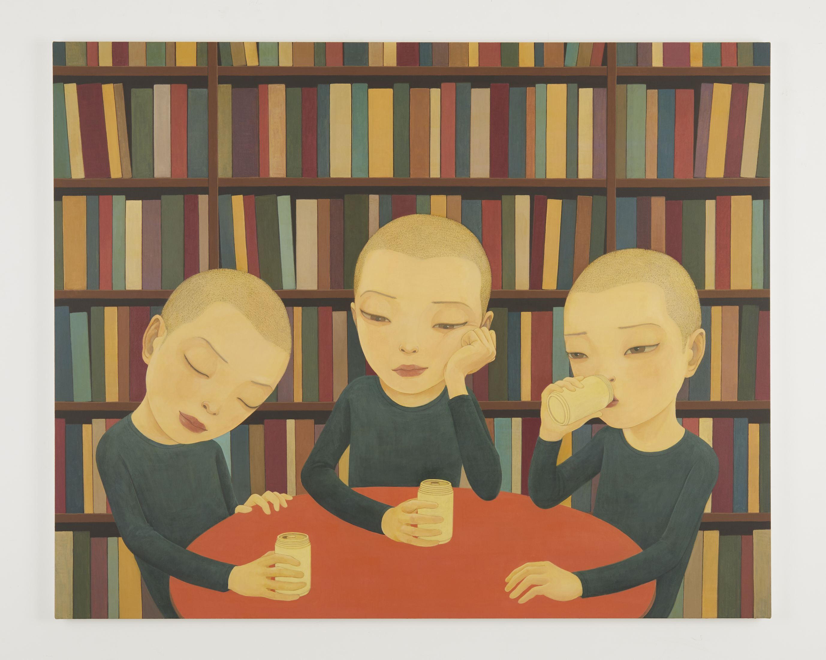 The characters depicted by Hideaki Kawashima, whether alone or in groups, appear pensive, demotivated, and in some cases tired of their everyday life, in moments that we all experience. A group of students, all identical, are shown escaping during a break in the library, expressionless in front of the viewer, frozen in their own mind. Like still lifes—vases of flowers are also present in his work—the figures, whose age and sex is difficult to define, endure life and seem to give up on it. More than suffering in silence, they appear resigned, whether in the shower or sitting with their breakfast in front of them.