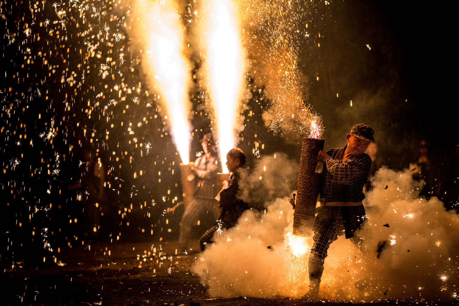 These Japanese fireworks, named tezutsu hanabi, are one of the country’s oldest traditions. It all began in the city of Toyohashi in Aichi Prefecture, central Japan, 400 years ago. These fireworks, which served as a means of communication in wartime, their flames reaching up to 20 metres in height, are made by hand from bamboo. The lit cylinders are held by men for the duration of the ceremony. This perilous spectacle was captured by Japanese photographer Hidenobu Suzuki. His photographs mainly show men standing surrounded by flames, under a shower of sparks.