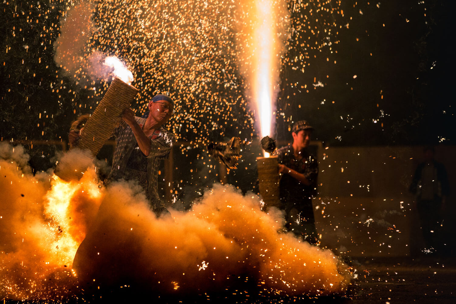 Photographer Hidenobu Suzuki captured ‘tezutsu hanabi’, cascades of flames that men hold at arm's length until the point of exhaustion.