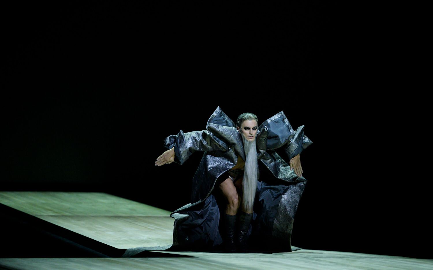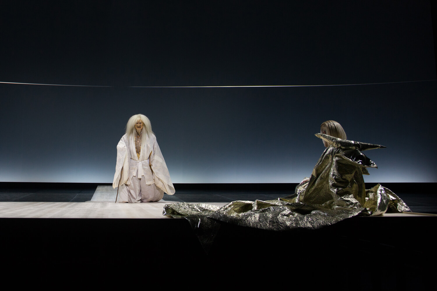 Of course, there is the interlude with the shite. Here, too, the audience can spot certain breaks with tradition. Choreographer Alessio Silvestrin, who has been living in Japan for many years, took some liberties with the form. He states that he took inspiration from the Buddhist paradox that ’emptiness is form, form is emptiness’ and transformed it into ’emptiness is form after form is emptiness’. Two Noh theatre actors, Tetsunoji Kanze and Kisho Umewaka, made the trip from Japan especially to play this incongruous character, but one who is magnificent when he appears in the finale of the play, just like in Noh plays.