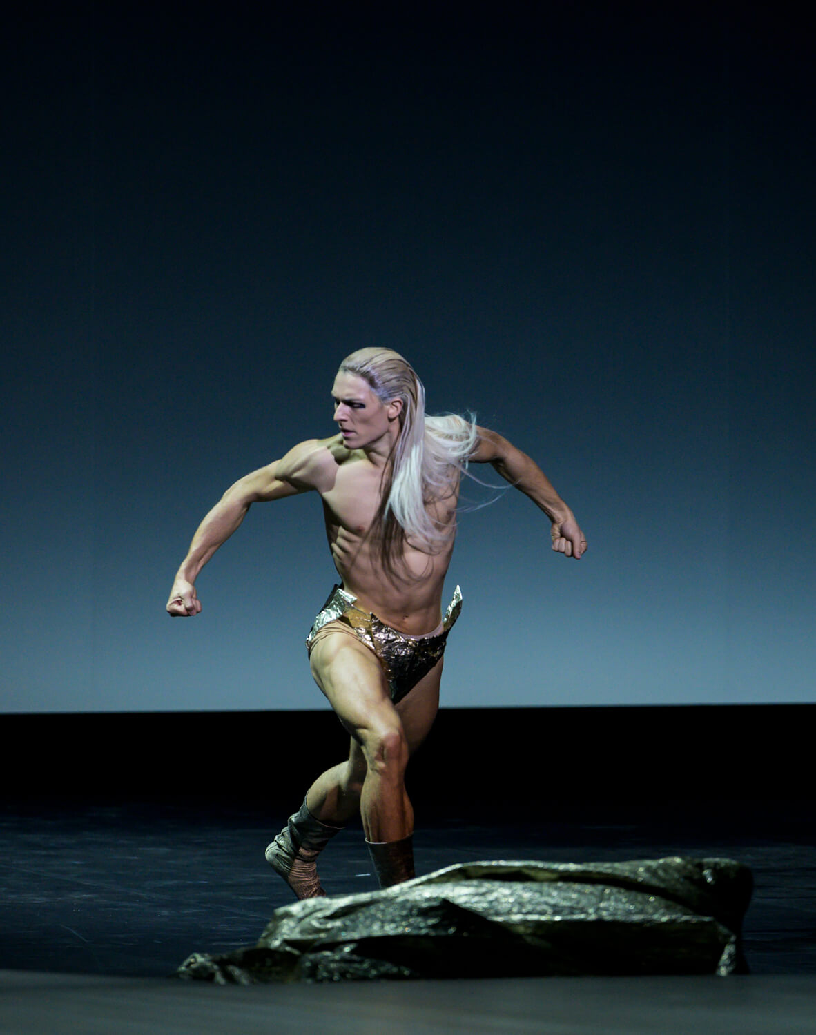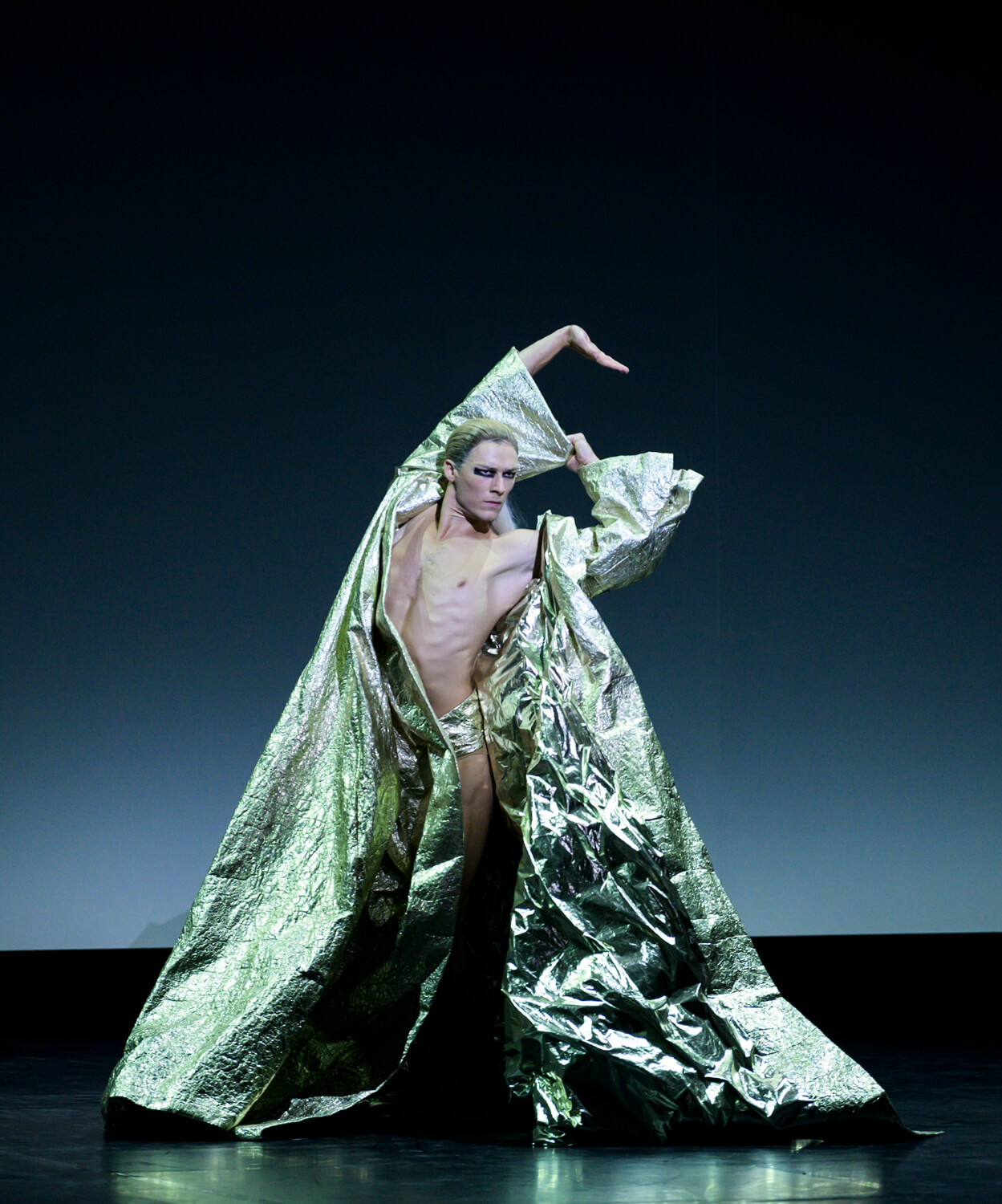 ‘These performances at the Palace Garnier are my attempt to bring the spirit of Yeats back to the stage thanks to the wonderful dancers of the Paris Opera’, Sugimoto writes in the programme for the play. And he does this with brio in a production which echoes his sea scenes thanks to screens hung in a semicircle at the back of the set upon which light effects are projected, thus recalling his photographs. A Nogakudo, the traditional raised stage found in Noh theatre, has been erected specially for the occasion at the front of the performance area to represent the island in the story. The three characters all launch into a highly modern variation which revisits the conventions of ballet, brought out by the music of Ryoji Ikeda. The ports de bras with the elbows bent at a 90-degree angle contrast sharply to the fluidity of classical dance. The same is true for the costumes made from lamé fabric which form what look like giant covers in which the dancers roll themselves up. They use them in their precise gestures which are a clear tribute to Noh dance.