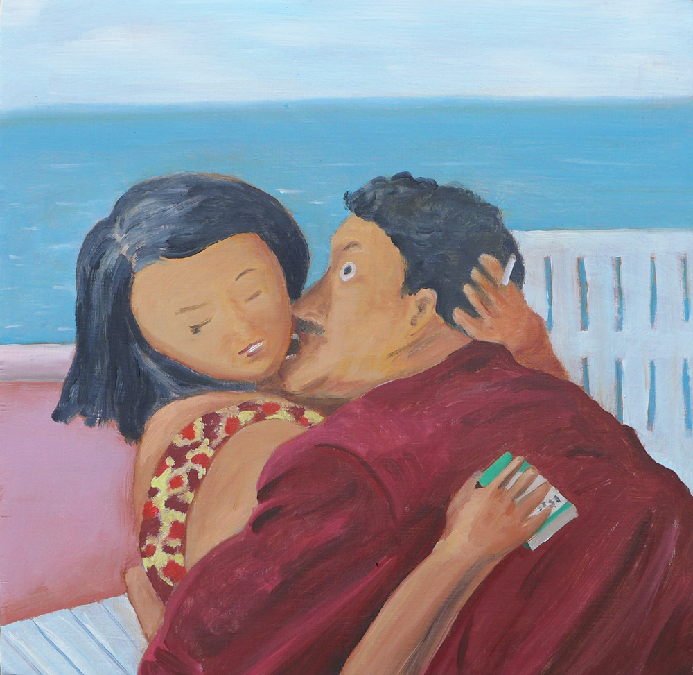 A couple kissing passionately, a woman smoking by a window, pensive, two friends immortalising an evening… Hiroya Kurata‘s paintings sublimate the ordinary. Characterised by bright colours and a certain sense of lightness, his creations freeze spontaneous moments like a snapshot.