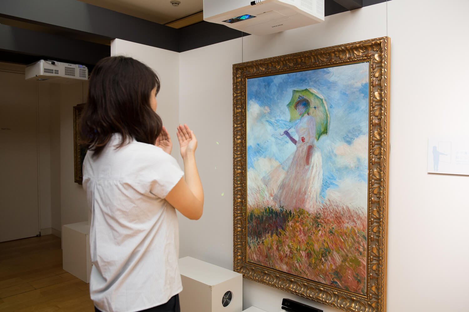 In addition to preserving great works of art, ‘Digital x Hokusai’ is also about enhancing the gallery-going experience for a modern audience. Goggle-less VR allows visitors to zoom in on a Hokusai at a high rate of definition simply by moving their body slightly forward, while sweeping hand gestures whip up a virtual gust of wind across the surface of ‘Woman with a Parasol’, enhancing the kinetic sensation of a breeze proposed by Monet. Likewise, twirling one’s hands in front of Van Gogh’s ‘Starry Night Over the Rhone’ sends stardust dancing across the surface of the artwork.