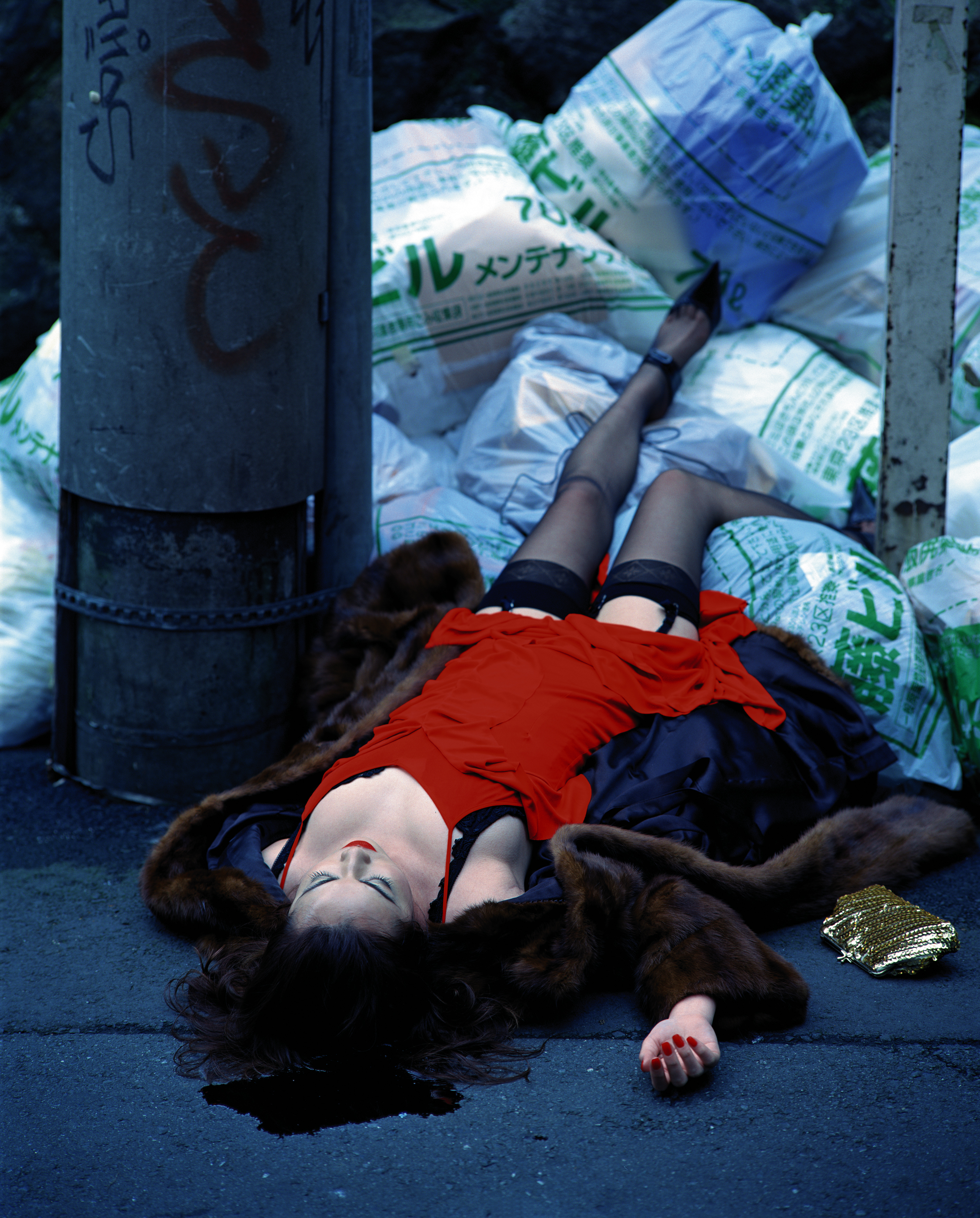 Between fashion, cinema, and visual art, the project undertaken by photographer Izima Kaoru seeks to aestheticise the death of young women. The series Landscapes with a Corpse, published in its entirety in 2008, presents photographs of immaculately-dressed models and actresses appearing in their fantasy death scene.