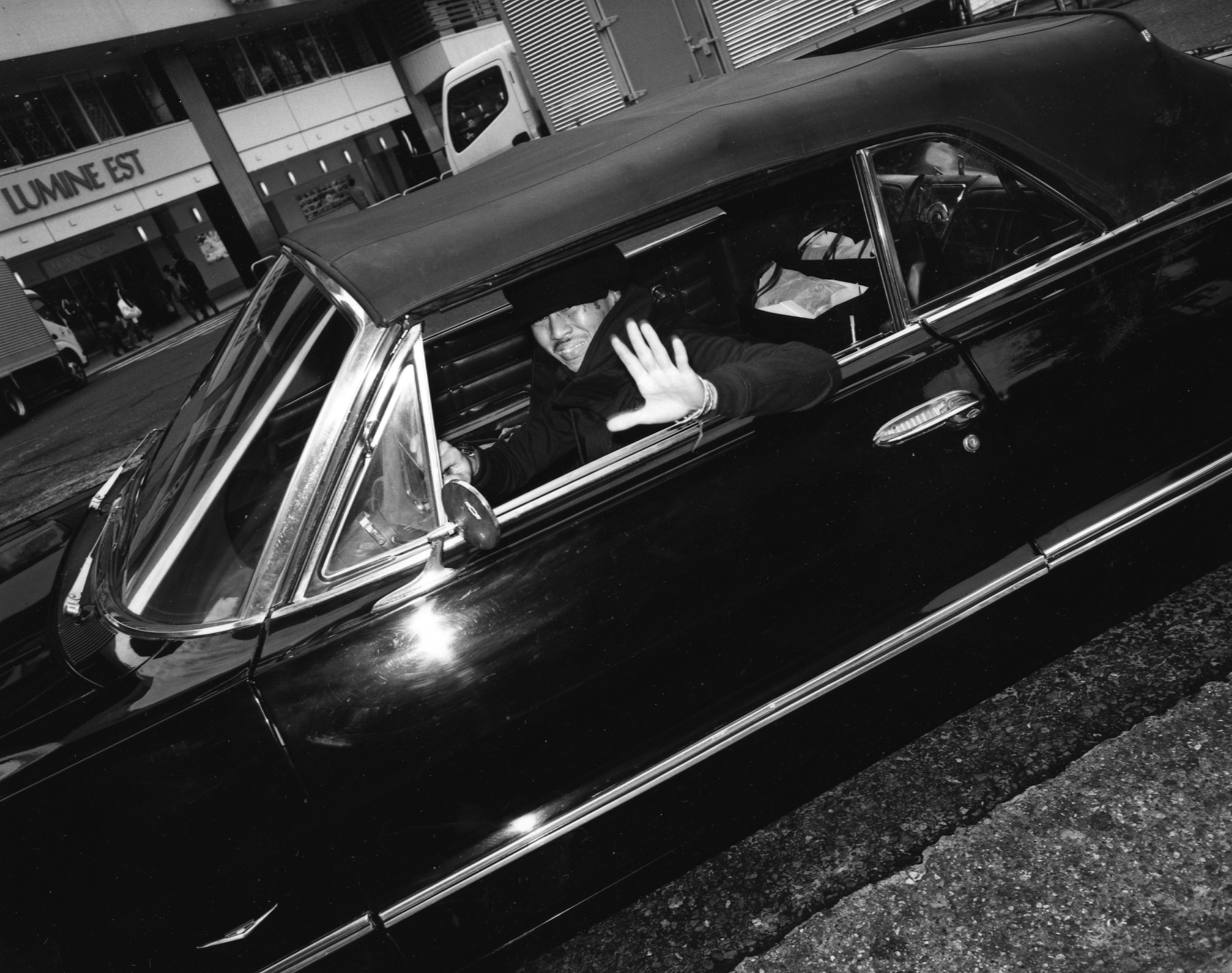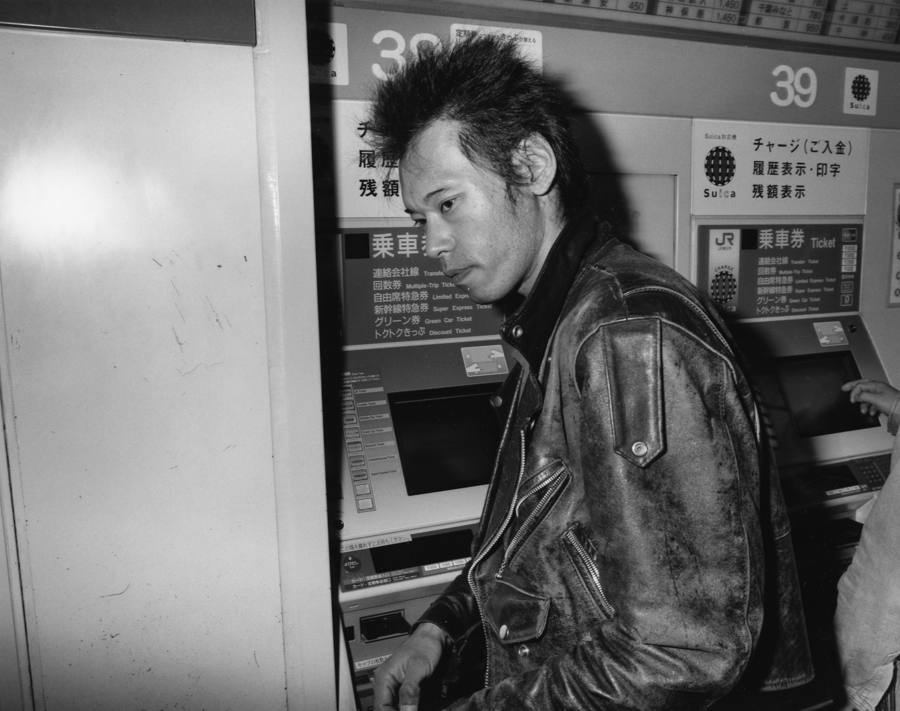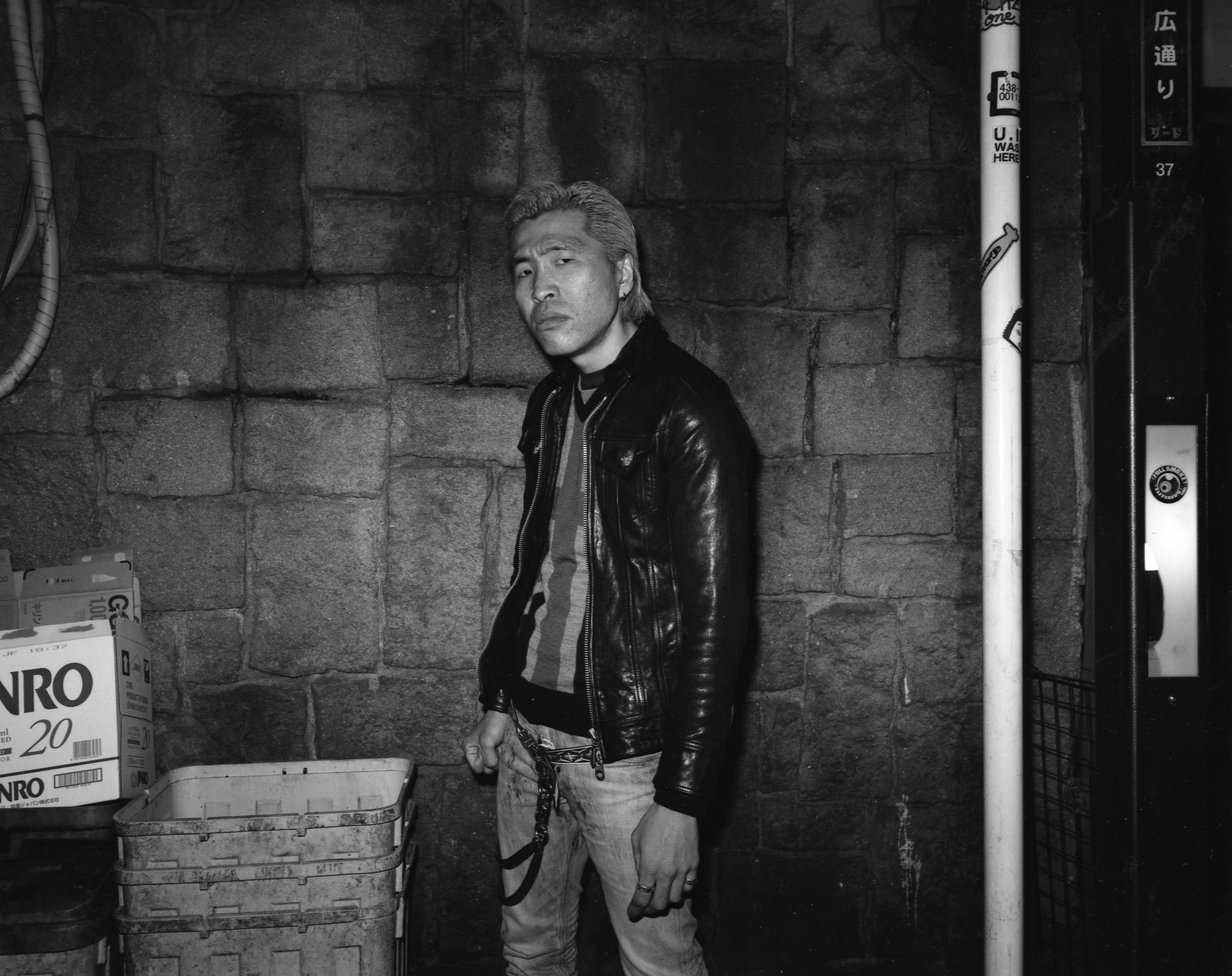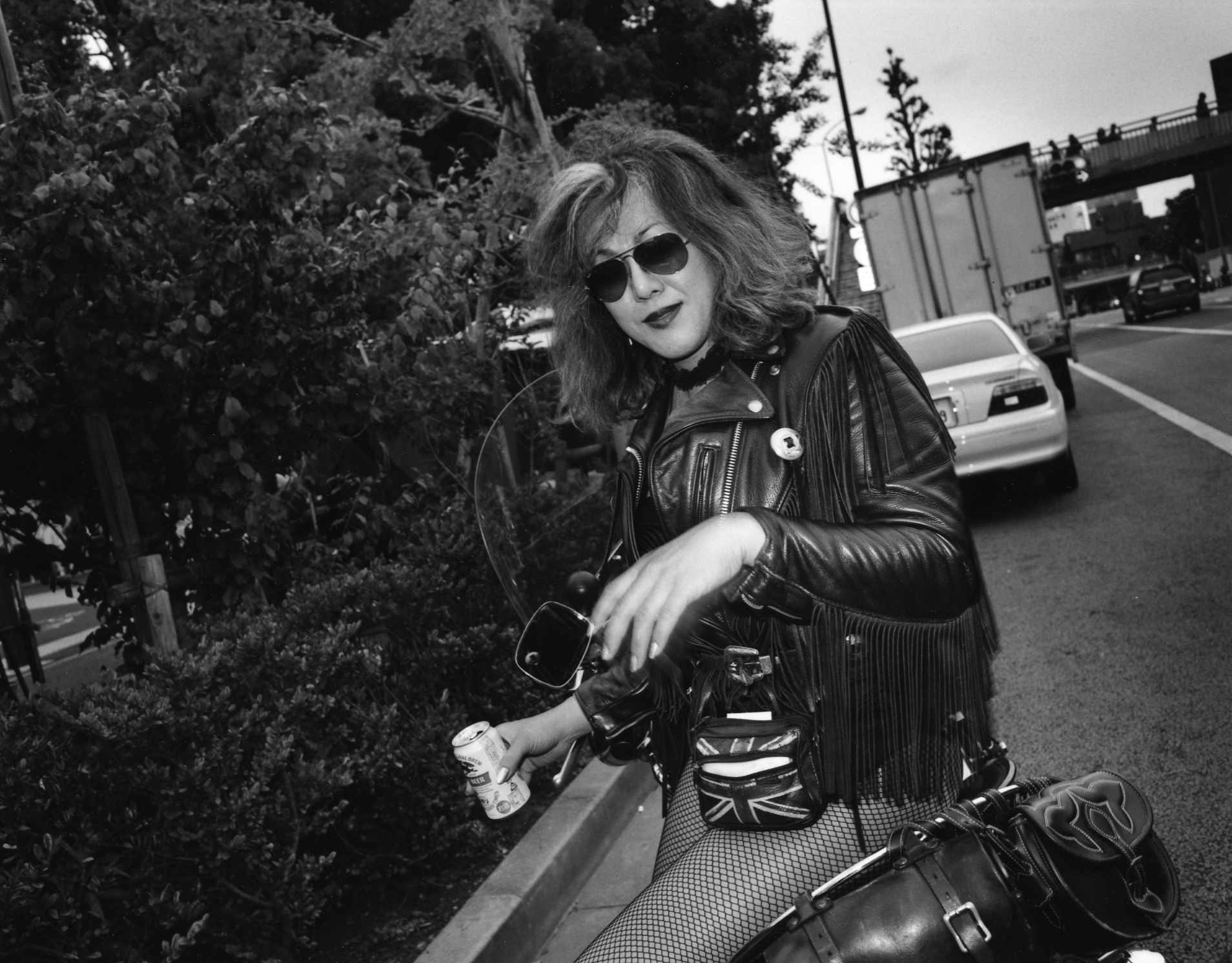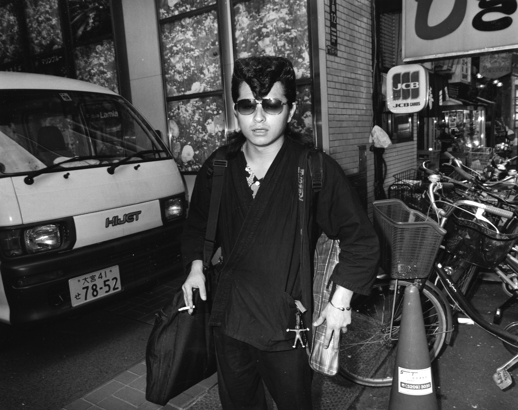 The black-and-white photographs in high density—taken from 2010 onwards, without any precise dates given—showcase certain details and bring the leather of jackets, the metallic paint of cars, and subjects’ hair to the forefront, sexualising the context to a certain degree. The artist’s perspective as transcribed in his photographs shows the relationship that forms between him and his subjects, a sort of admiration, of gratitude for bringing life to a society that might appear homogenised. Prior to taking his photographs, the artist likes to chat with the subjects he selects and states: ‘sometimes we have a beer together in the street.’ In the book’s afterword, Keizo Motoda explains the degree to which he is touched by ‘the sadness, the joy of the people I encounter, the flourishing and the decline of the streets.’