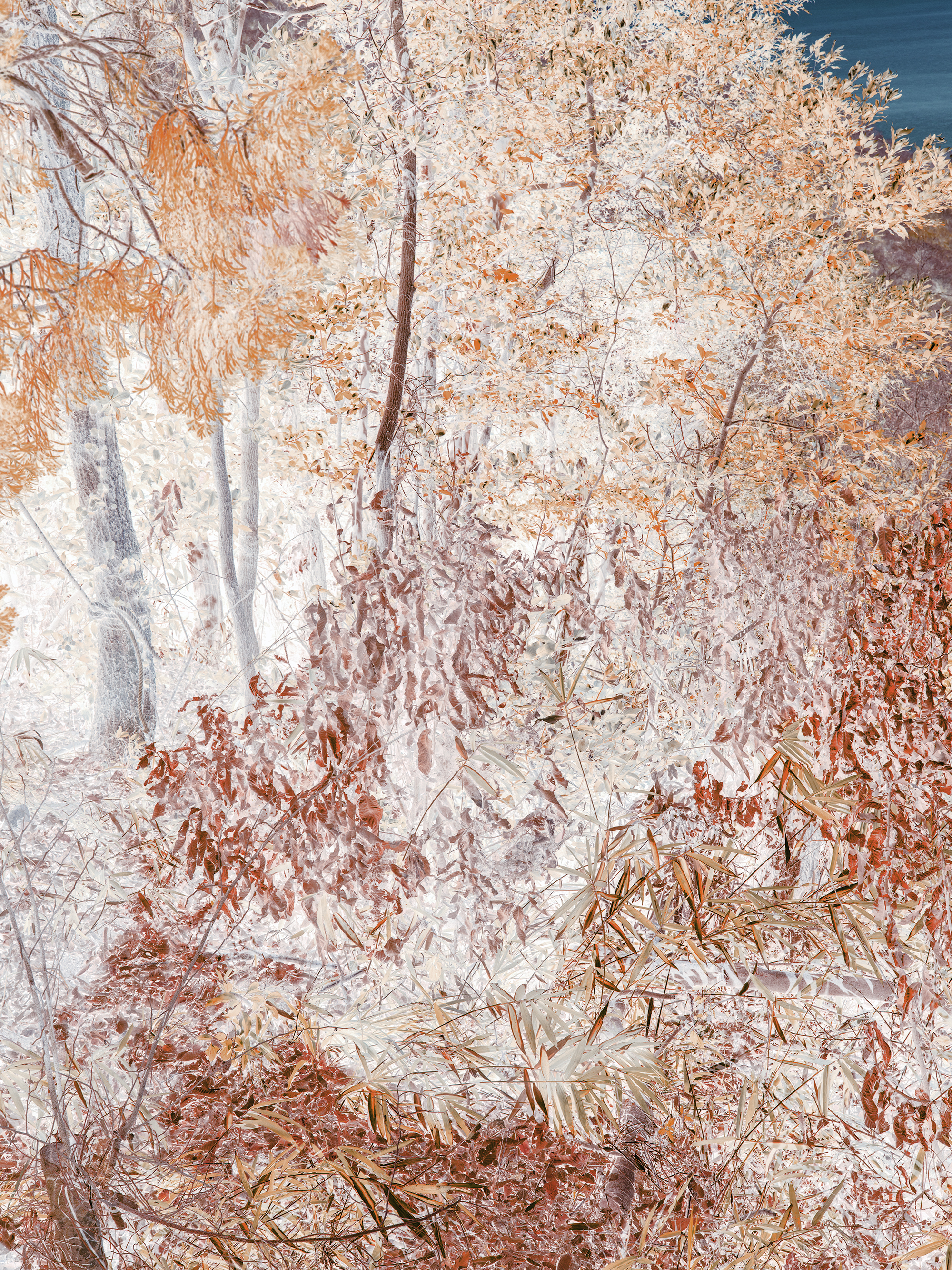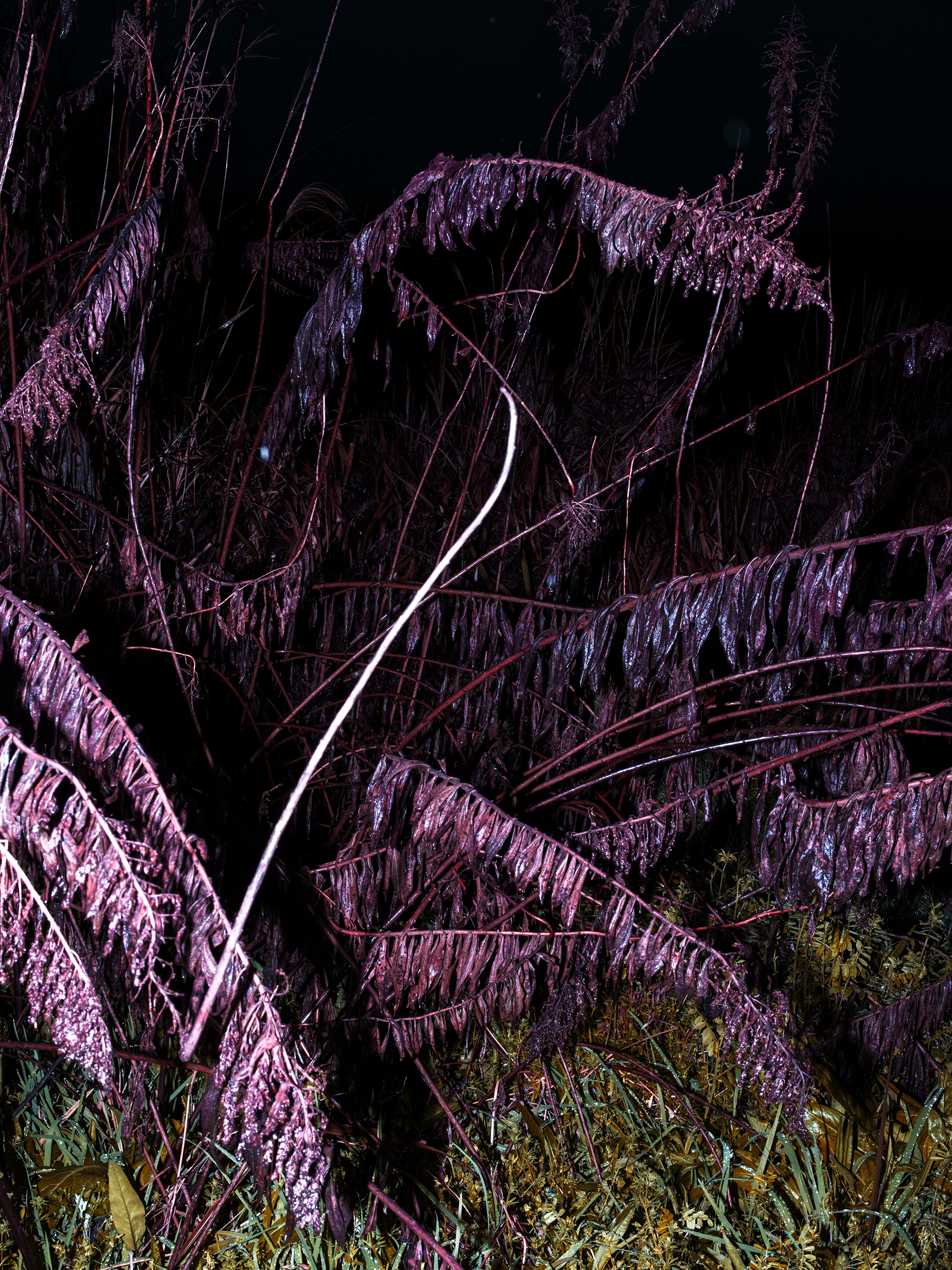 Nature is a complex notion for the artist, one which amounts to more than the wild state. ‘I use the word “nature” to describe everything that is subject to biological, chemical, and physical processes, everything that exists, ages, and decomposes.’ It is inseparable from humans, who form a part of it themselves, and vice versa. ‘Plants grow right next to the road, it’s a concrete river, it’s a rotting house in which flowers are growing…’ This is nature personified, with a purpose and a personality. With bright, saturated lighting, reversed colours, and inverted composition, Łukasz Rusznica’s photographs give the impression of being undeveloped shots that break the balance between shadow and light. ‘Yes, they actually come from the negative image, but I worked on them as if I were working on normal images. The colours aren’t negatives of the original colours, it’s not the opposite, it’s the original.‘ The reflection is independent of its reflected image, like the supernatural from the real. ‘These are attempts to speak about spirituality through the image’, Rusznica states. The photographer captures reality itself, and not just a recording or reproduction of it. The images talk to us about the truth of the world, in the same way as a work of fiction might.