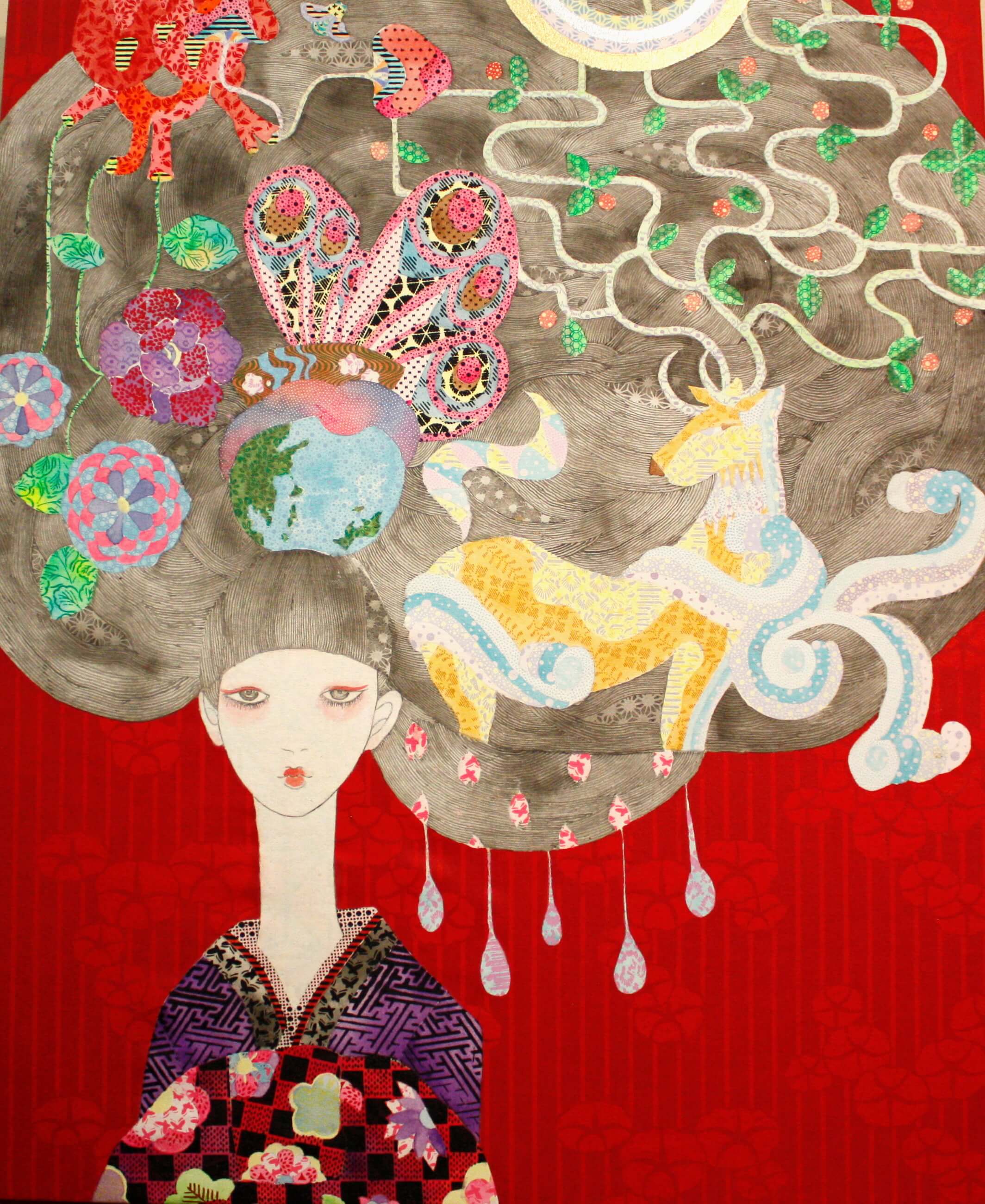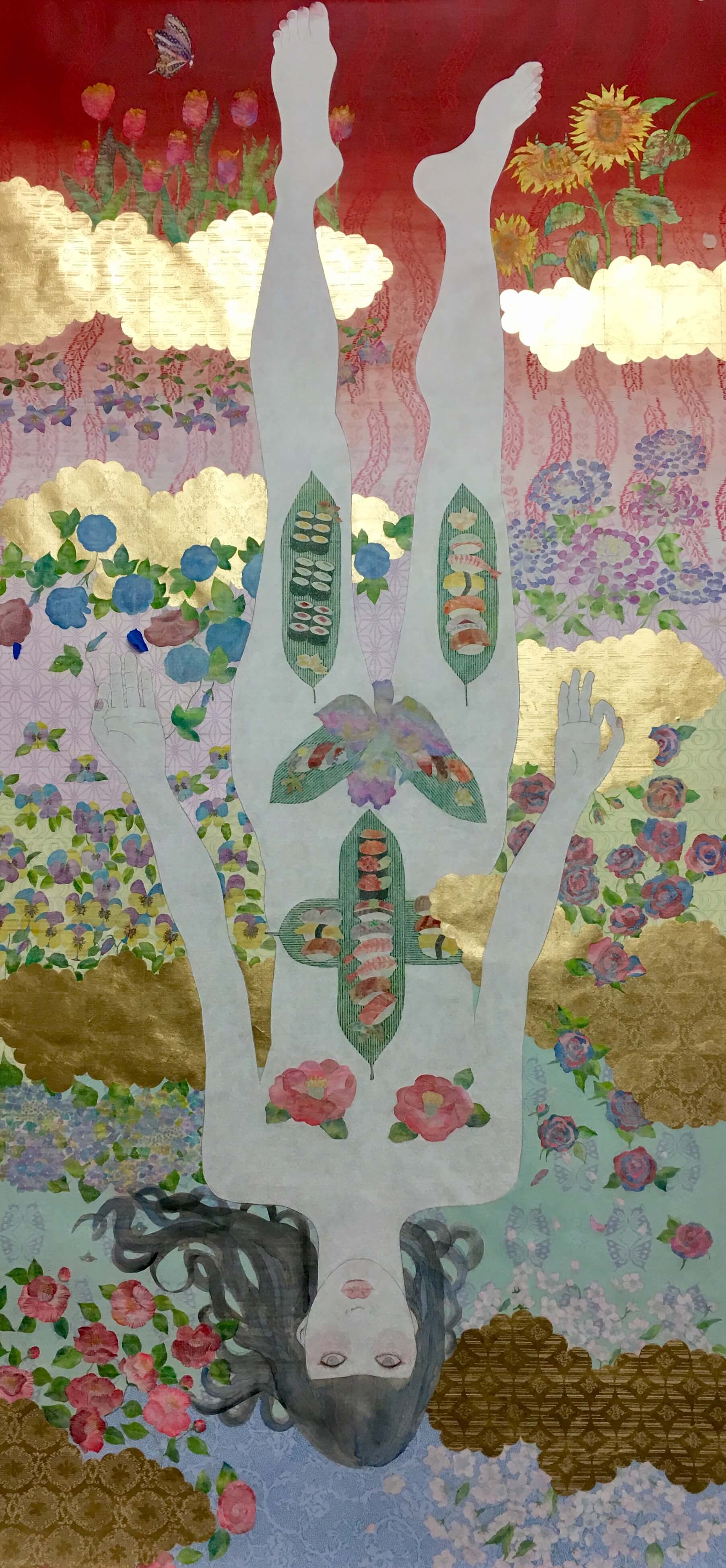 In her pieces, the artist brings together acrylic paint, gold leaf, sumi-e (traditional calligraphy), and ukiyo-e (wood engraving). She combines different eras, symbols, and messages. The women she represents stare at the viewer, as if questioning them. In their private lives, these women oscillate between lasciviousness and innocence, but also seem to be aware of the environment in which they exist. The artist thus seeks to be a representative in a culture marked by a form of misogyny.