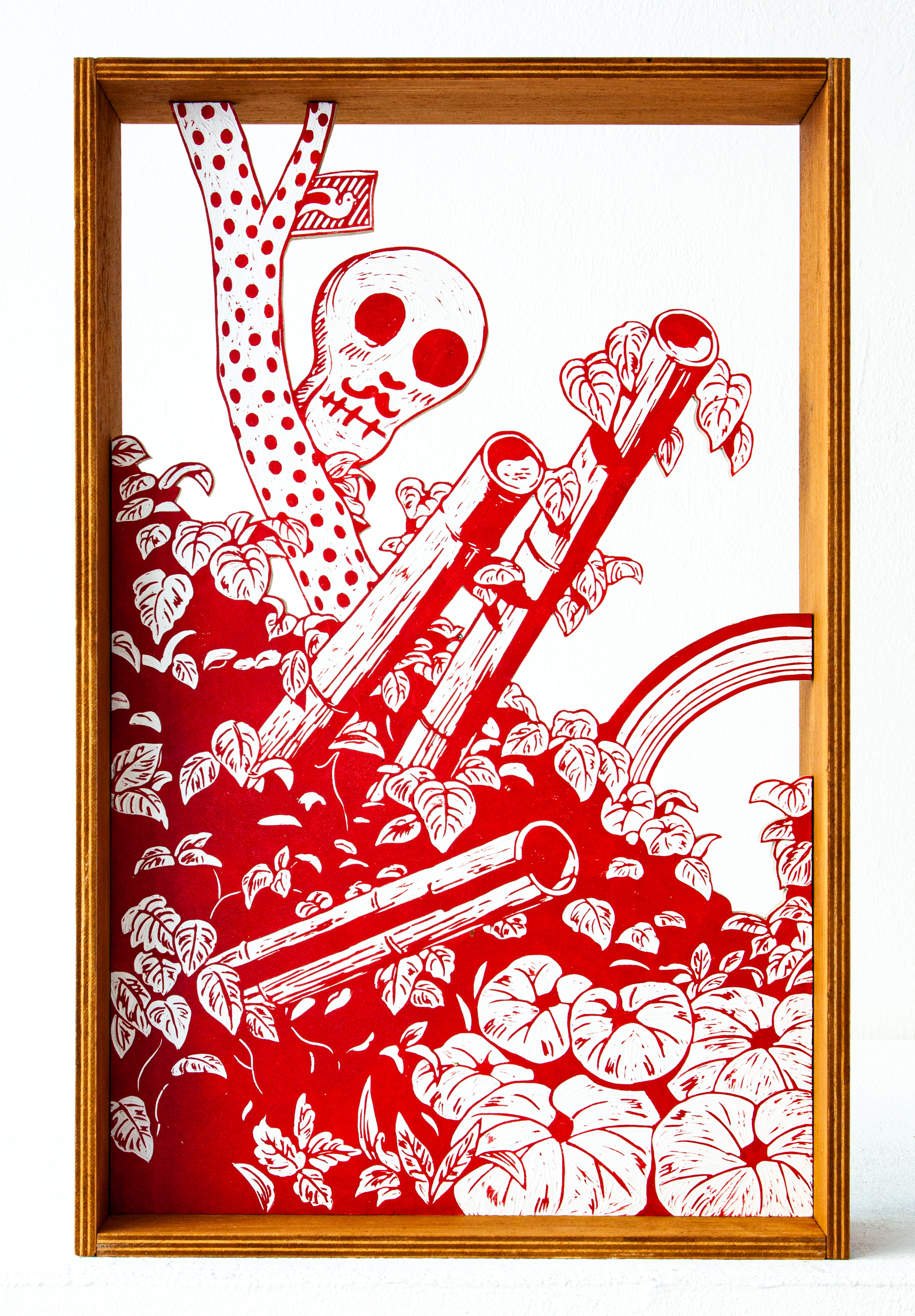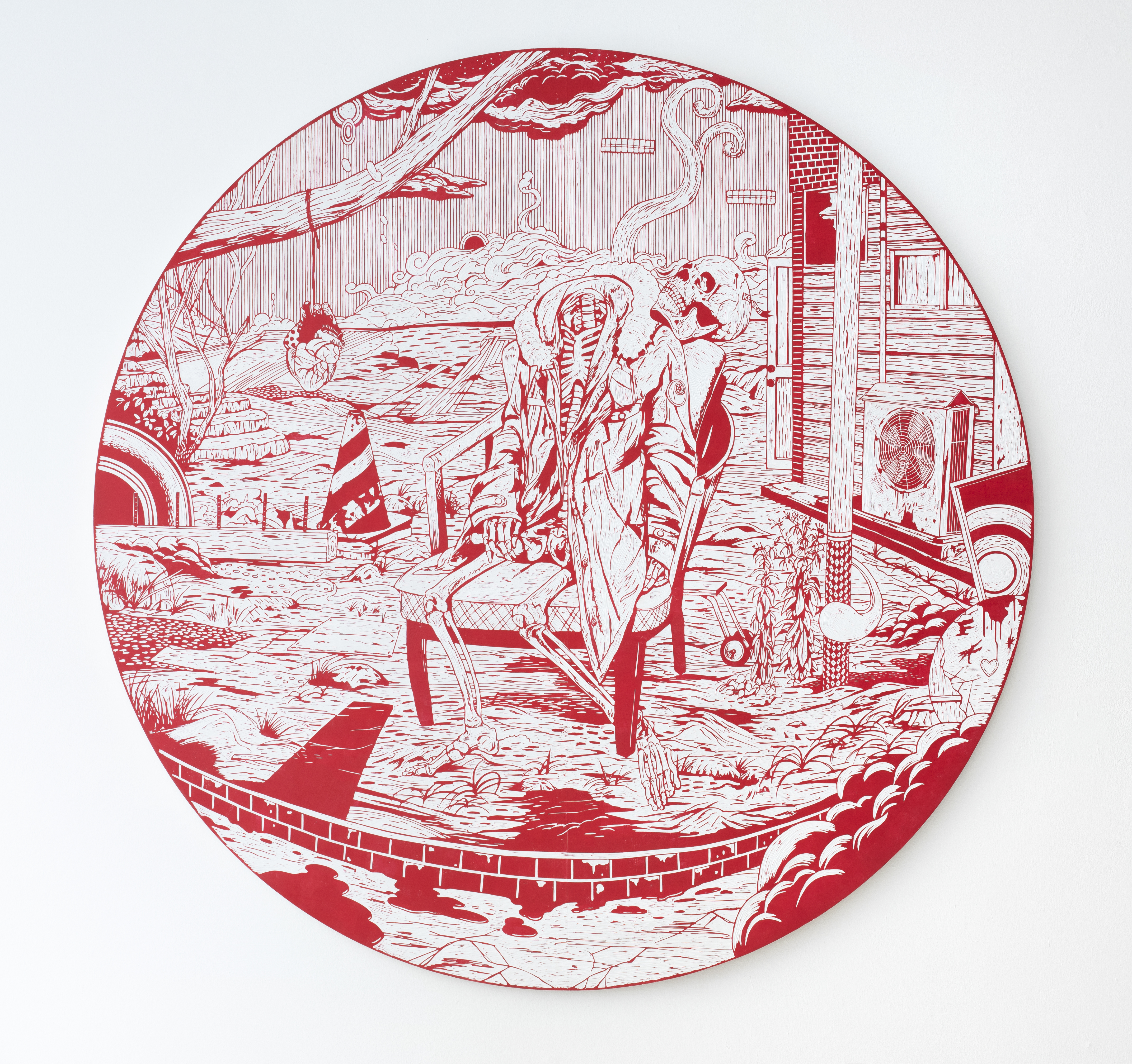The Kanazawa-based artist’s compositions reveal a mix of symbols and codes that the viewer needs to take the time to decipher. Cultural stereotypes are connected to these symbols and codes in an unusual way, and the sugary pop imagery specific to Japanese society is drowned in a red universe, which was long tinged with symbols of blood, violence, and cruelty, before gradually tending towards representations that could be described as expressionist. The artist, born in 1972, explains to Pen: ‘I want to be cheerful.’ He achieves this in a counterintuitive manner: ‘I try to be positive while dealing with motifs that sometimes remind me of death. This is because I believe that having a dark essence makes everyday life more positive.’