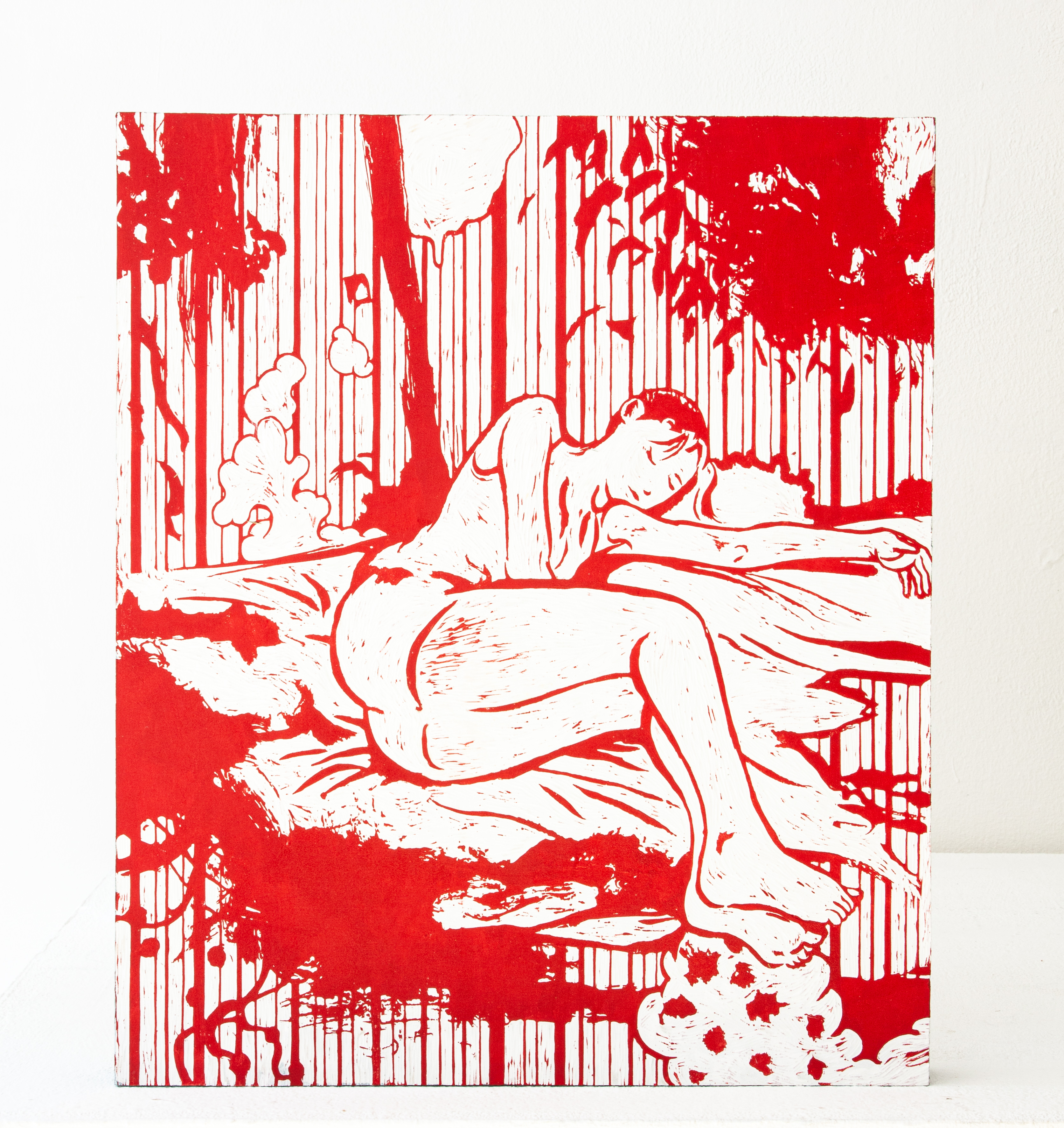 Initially inspired by motifs from modern Japanese manga culture, anime, or horror films, Kenichi Yokono decided to work using a traditional technique, wood engraving, but without executing the final printing phase. His body of work now focuses more on everyday, neutral scenes.