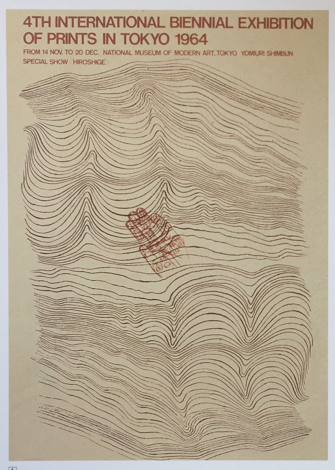 Much like how ukiyo-e prints, an early form of mass consumption, are said to have direct links to manga’s contemporary forms, Kiyoshi Awazu’s prints emblematises an imaginary bridge between Japan’s feudal past and fast-paced modernity. In his own ‘floating worlds’ the influence of medieval masters penetrate each line, and their optical effects are enhanced through his psychedelic chromatics and clever abstraction. As seen in his minimal designs for the poster of International Biennial Exhibition of Prints in Tokyo, an event in fact centred around Hiroshige Utagawa, he is able to conceptualise, through basic visual elements, an archaic, symbiotic relationship to nature in the context of post-war delirium. Tinkering with Japan’s national identity, each print represents an elementary magic which penetrates through time.