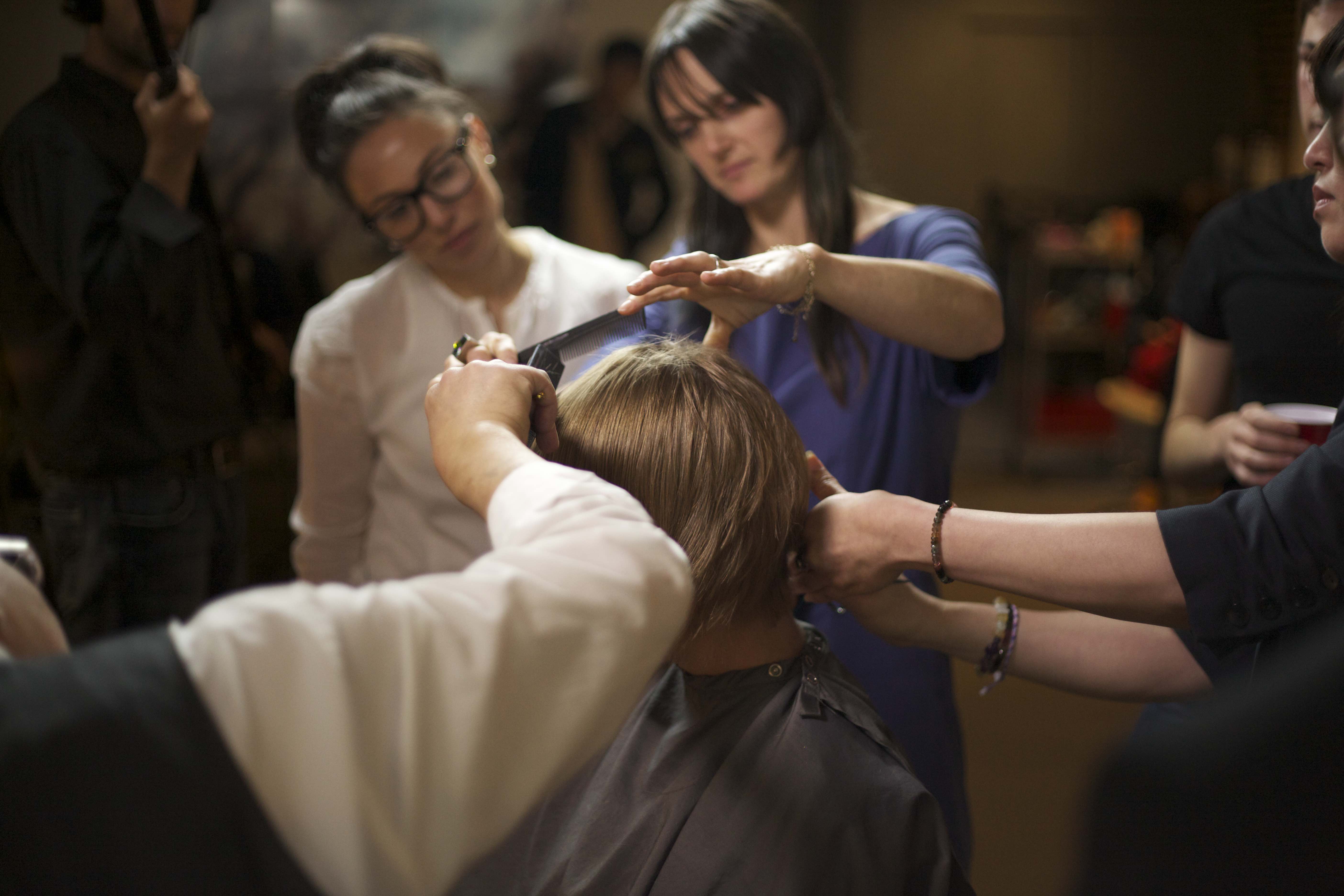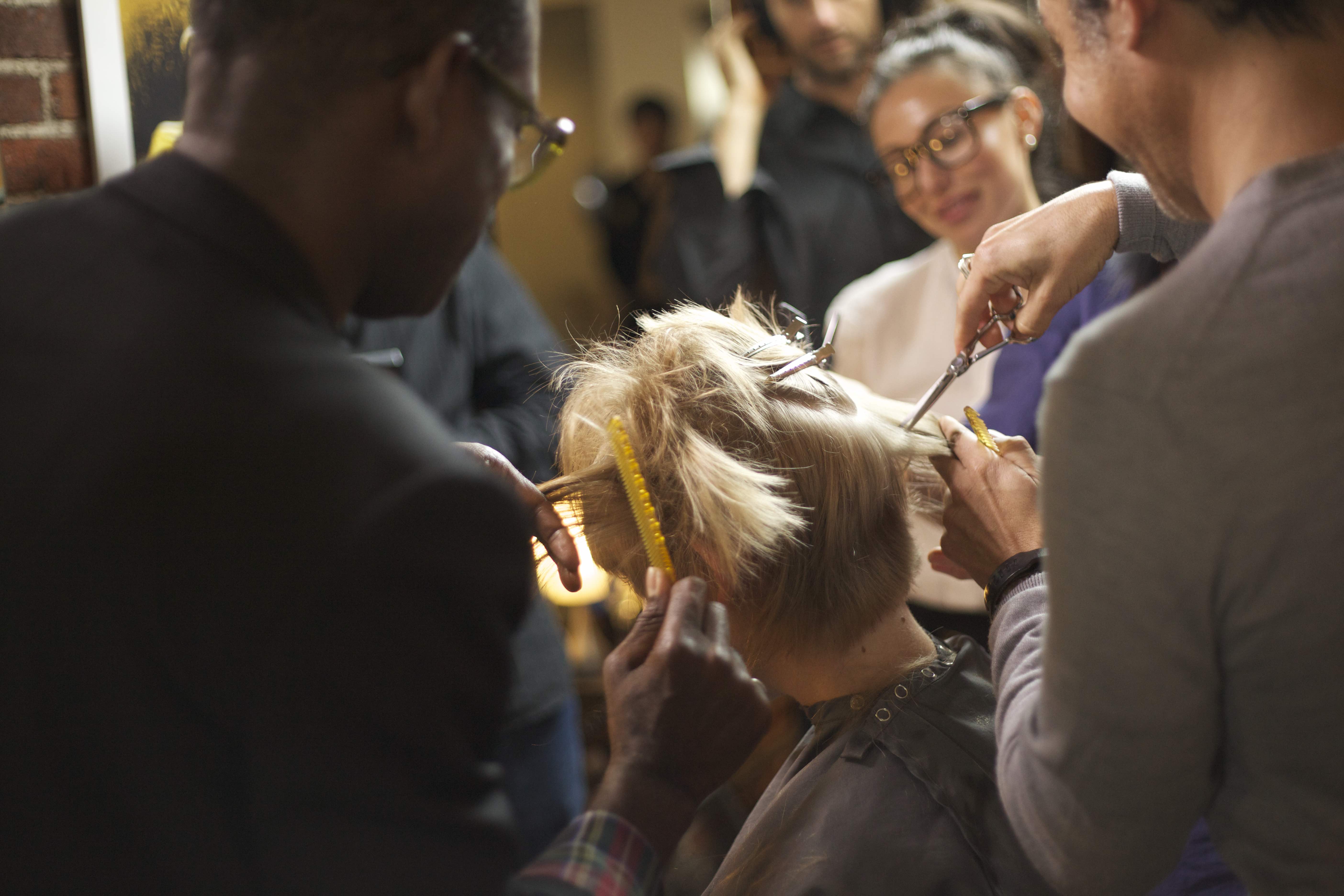 ‘A Haircut by 9 Hairdressers at Once (Second Attempt),’ 2010, Collaboration, video documentation (28 min), Zindagi Salon, San Francisco. Curator: Julio Cesar Morales, Commissioned by Yerba Buena Center for the Arts, San Francisco, Production photography: Tomo Saito,Participants: Victor A. Camarillo, Kristie Hansen, Nikki Mirsaeid, Olga Mybovalova, Sandra Osorio, Anthony Pullen, Brian Vu, Nicole Korth, Erik Webb, Karen Yee | photo courtesy of the artist, Vitamin Creative Space, Guangzhou and Aoyama Meguro, Tokyo