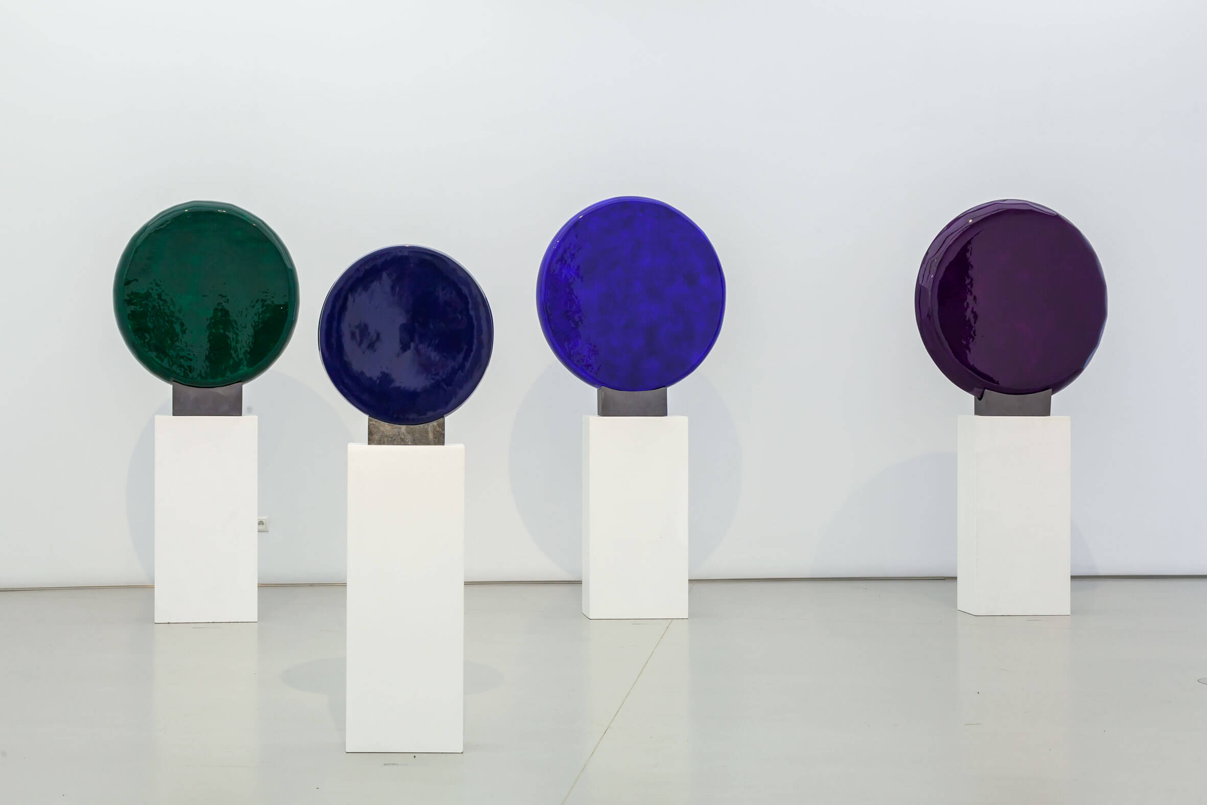 When travelling through Japan she was introduced to the mythology surrounding mirrors, ‘linked to the concept of reflection as a means of looking inwards,’ she explains, leading her to develop the Tambours series. This same concept echoes her own work, which seeks depth through painting. According to the artist, ‘in these traditions, the mirror isn’t an instrument associated with narcissism, seeking one’s own image, but rather an object that captures and conserves.’