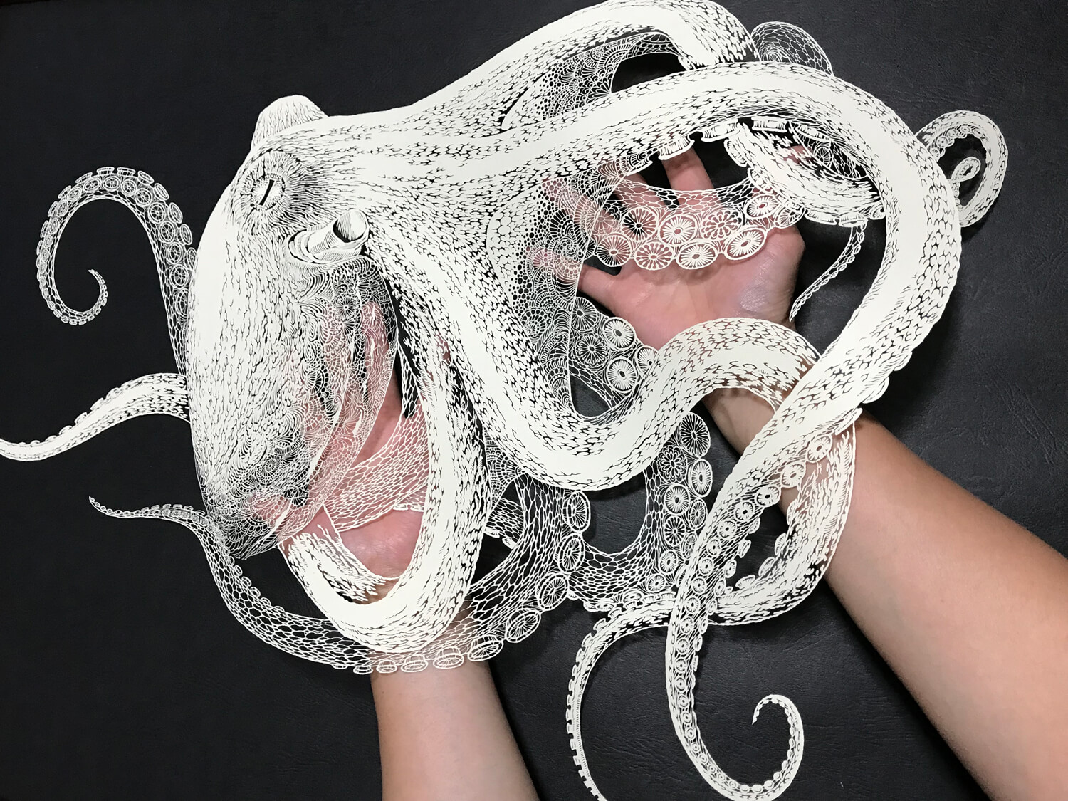 An octopus cut from a single piece of white paper. This fascinating work was one of the greatest successes of 2018 for its creator, Masayo Fukuda. Having practised kirie, the Japanese art of paper-cutting, for 25 years, she has become an expert in the domain. After working for long hours, in minute detail and with great finesse, she shares her final, breath-taking creations on social media, to great success.