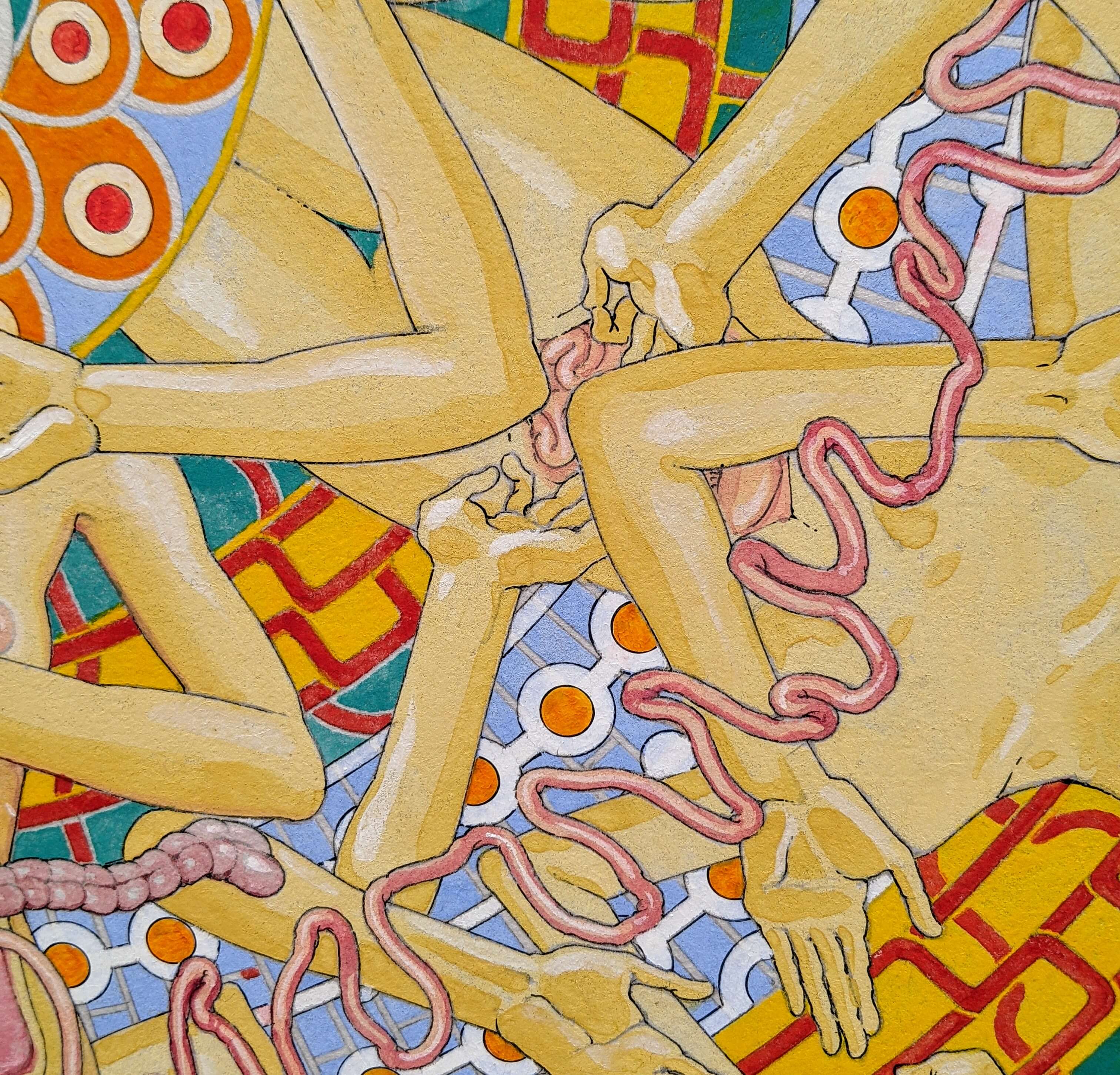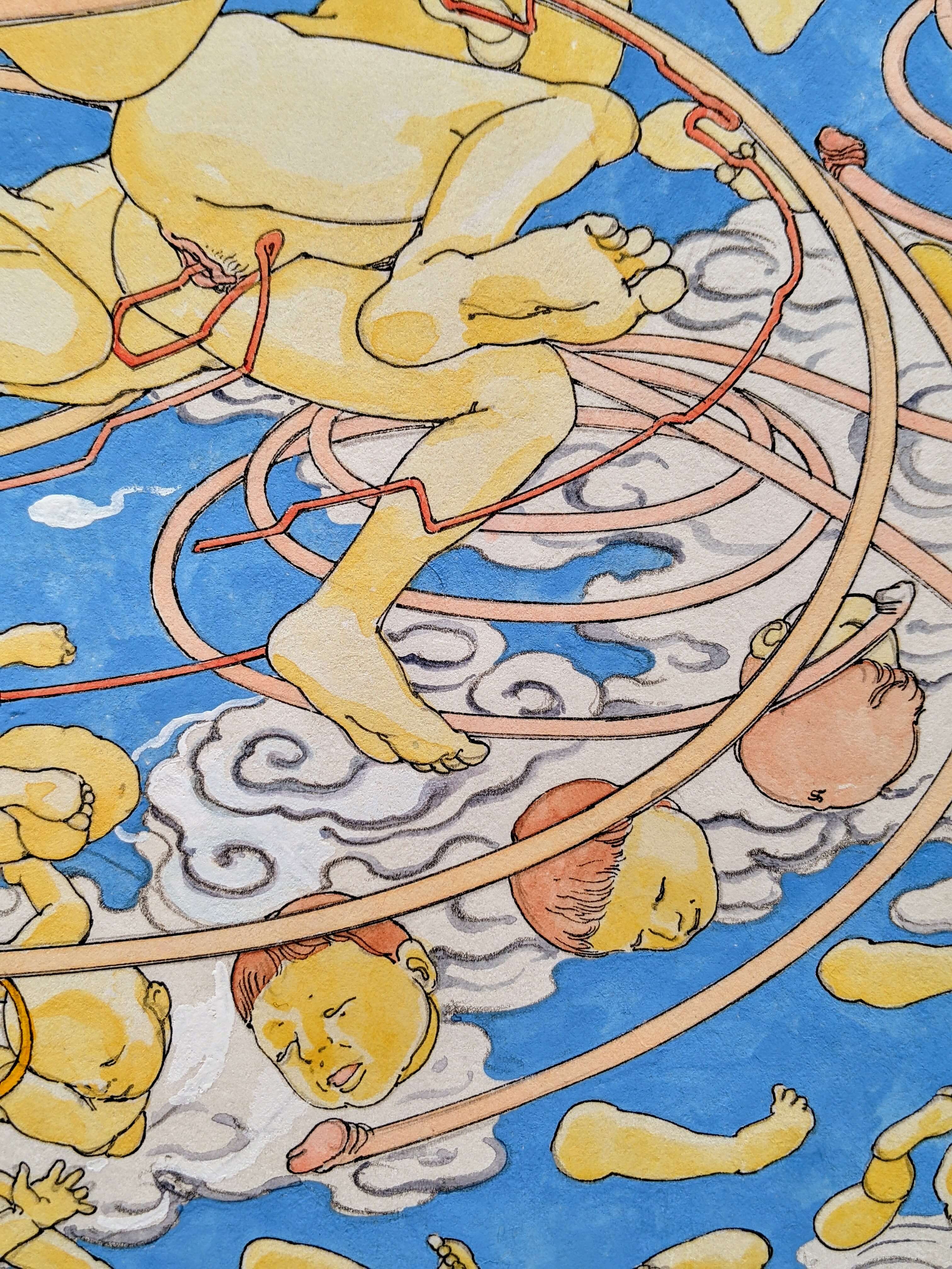 Looking at ‘Hell…’ throws into relief the ways Kago plays with the traditional Buddhist composition of the mandala in the other paintings. Set against the chaos of the former, the symmetry of a painting like ‘Genesis Kannon Bosatsu’ both enchants and repels the viewer. Unlike the playfulness of spotting a new and bizarre form of torture in ‘Hell…’, the elements of these mandala paintings draw the eye in a circle: one distended limb or elongated penis inevitably loops round to another. The viewer is thus subject to a distorted form of the meditative practice of viewing a mandala, as sinking into the endless details leads one further into disgust.