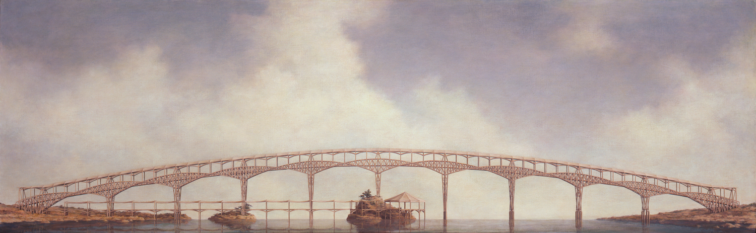 Minoru Nomata began working as an artist in Tokyo in the 1980s, having graduated from the Design Department of Tokyo University of the Arts, with his first solo exhibition in 1986. His painting style is immediately recognisable: inhabited by smooth, otherworldly architectures and improbable objects.