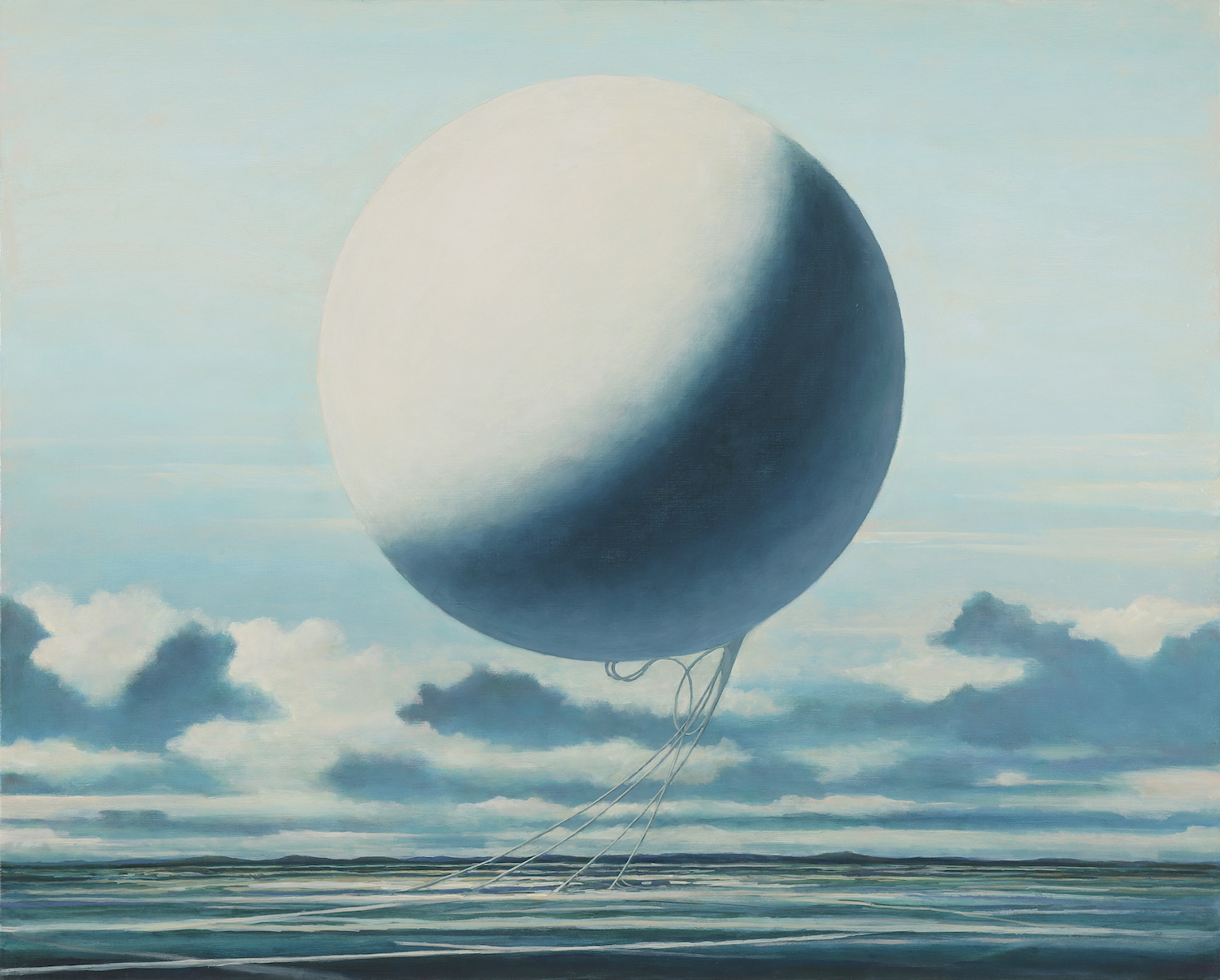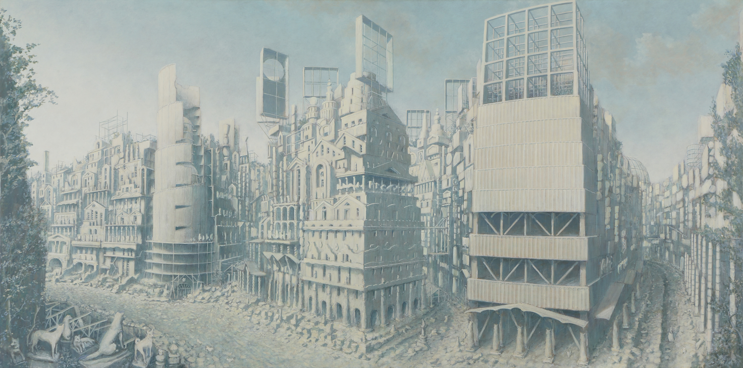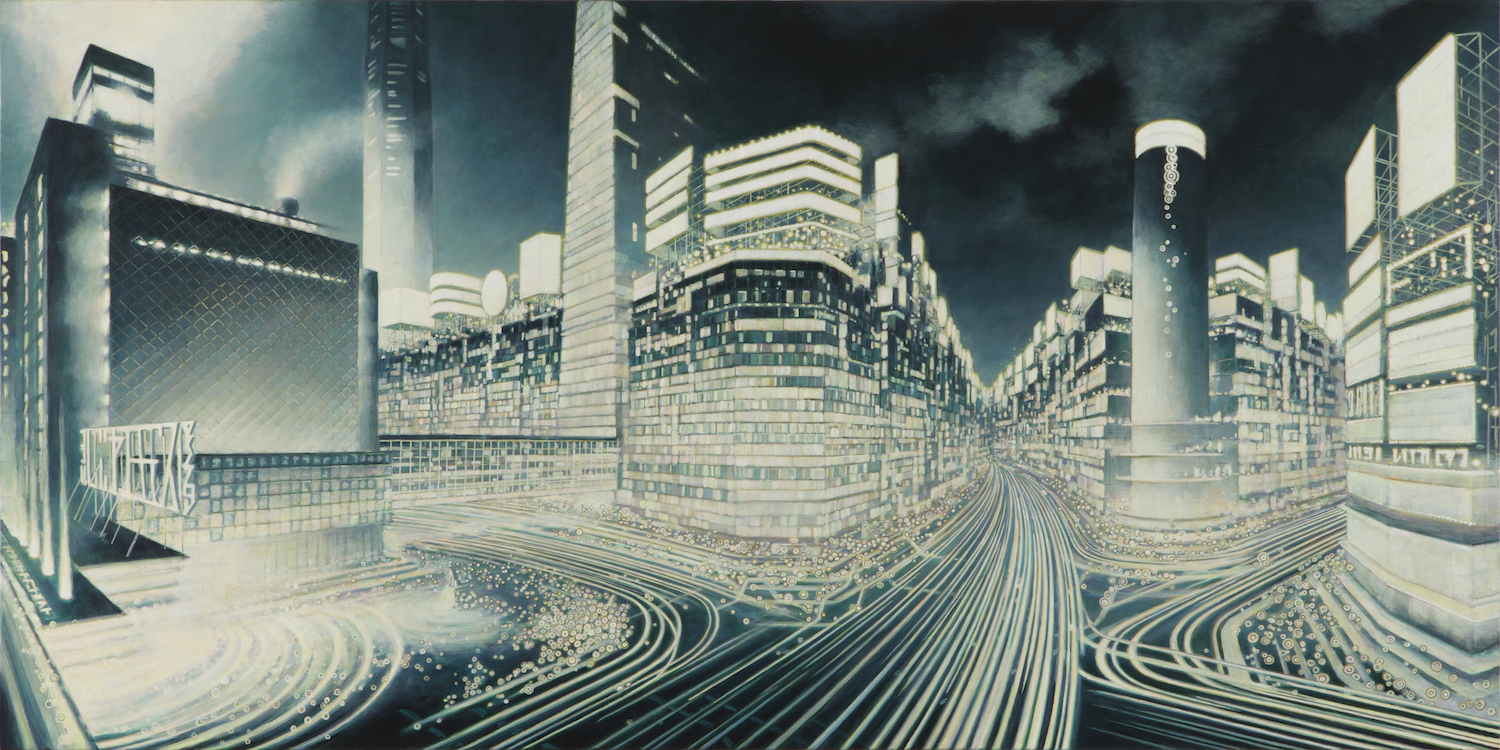 Minoru Nomata’s work feels both ancient and futuristic, with complex dreamlike edifices that rise up out of barren landscapes. His more recent work, such as the 2018 Ascending Descending series, takes on a more abstract form. These paintings show large spheres against cloudy skies, reminiscent of blimps, balloons, or hot air balloons. The works are described by his gallery as ‘a primordial sign that is going to be formed, as it were, similar to ki or airy energy.’ These more organic forms nevertheless exude the same disquieting energy as his empty cities, devoid of human life, but imbued with an uncanny familiarity.