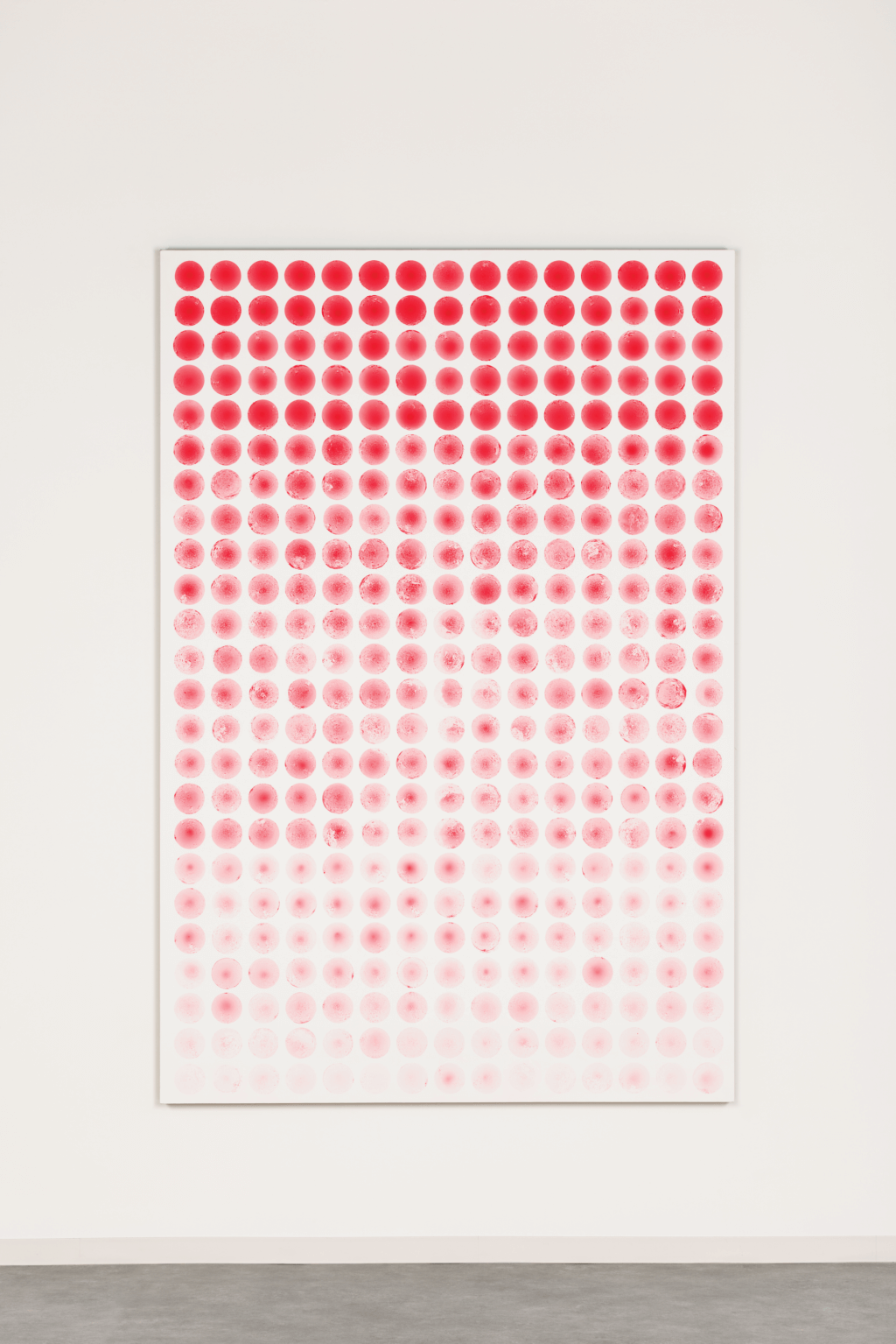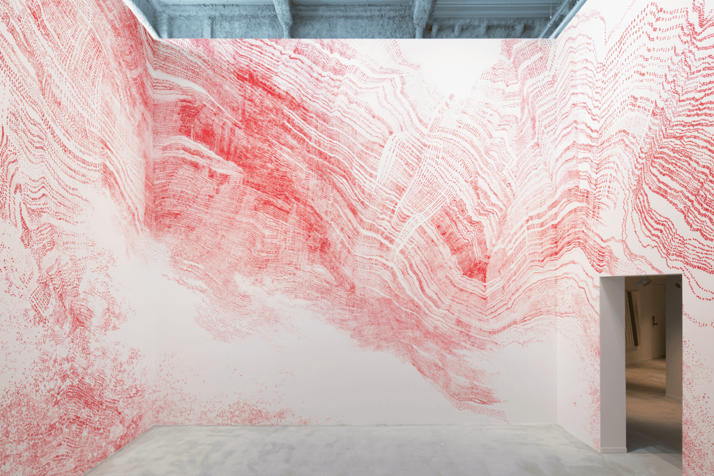 Alongside RED DOT, the artist has developed other series that engage the body just as intimately. In BREATH, she creates translucent circles by blowing into red paint, like forming soap bubbles. The under my skin series, in contrast, evokes the activity of blood cells coursing through the body. In each case, the artist’s physical engagement is central to the work. ‘I’m always completely exhausted after painting… and starving!’ she laughs. Marked by breath, repetition, and the rhythm of the body, her works seem to radiate the raw energy of life itself.