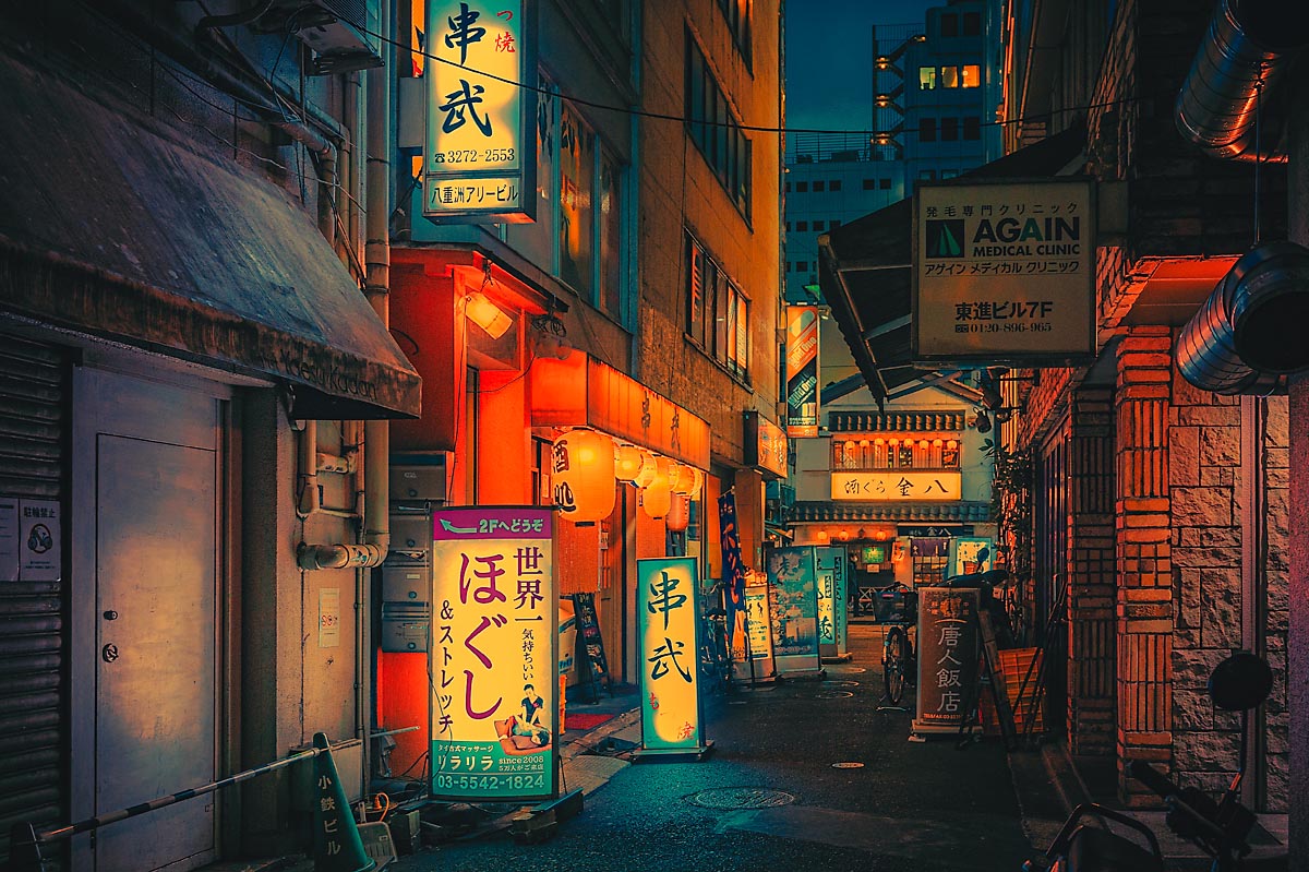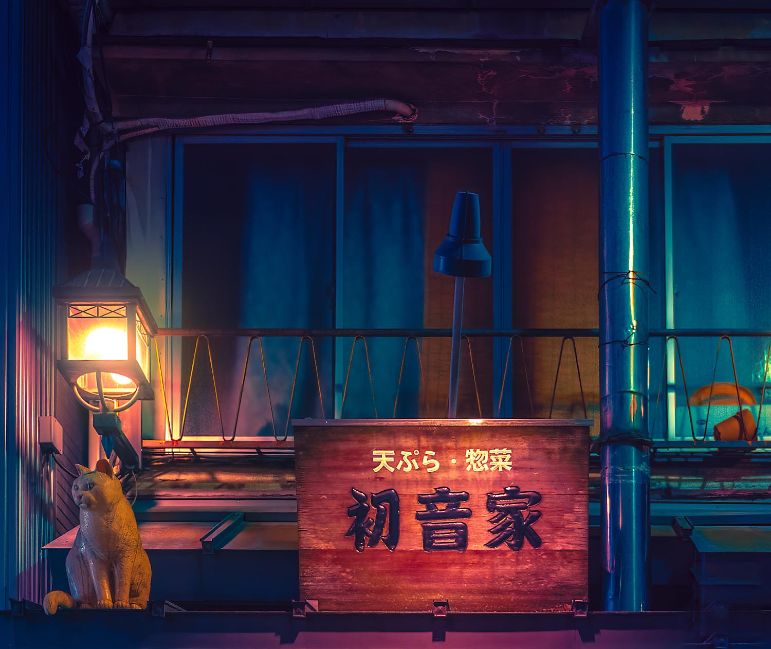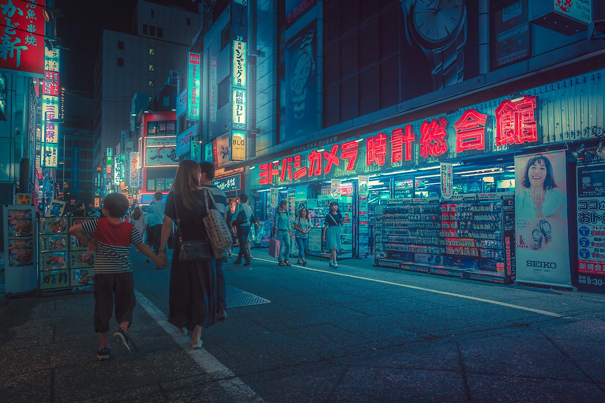 In this series, the photographer, a graduate from the School of the Art Institute of Chicago, wandered through cities in Japan to capture their main, bustling streets lit by neon lights, but also their winding streets, some of which were empty, and others of which had a few night-time wanderers. He also featured the front windows of izakaya and various boutiques. This contrasts with the other work by this artist based in Memphis, Tennessee, because Dream World involved a significant amount of work during the photo editing stage, with particularly close attention paid to colours and contrasts.