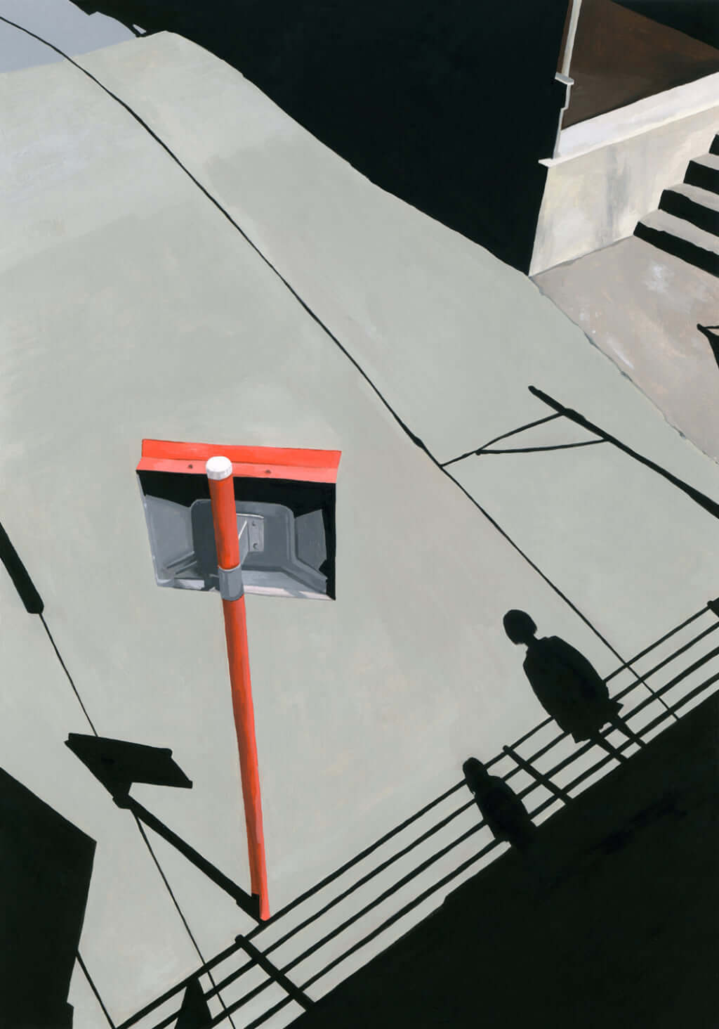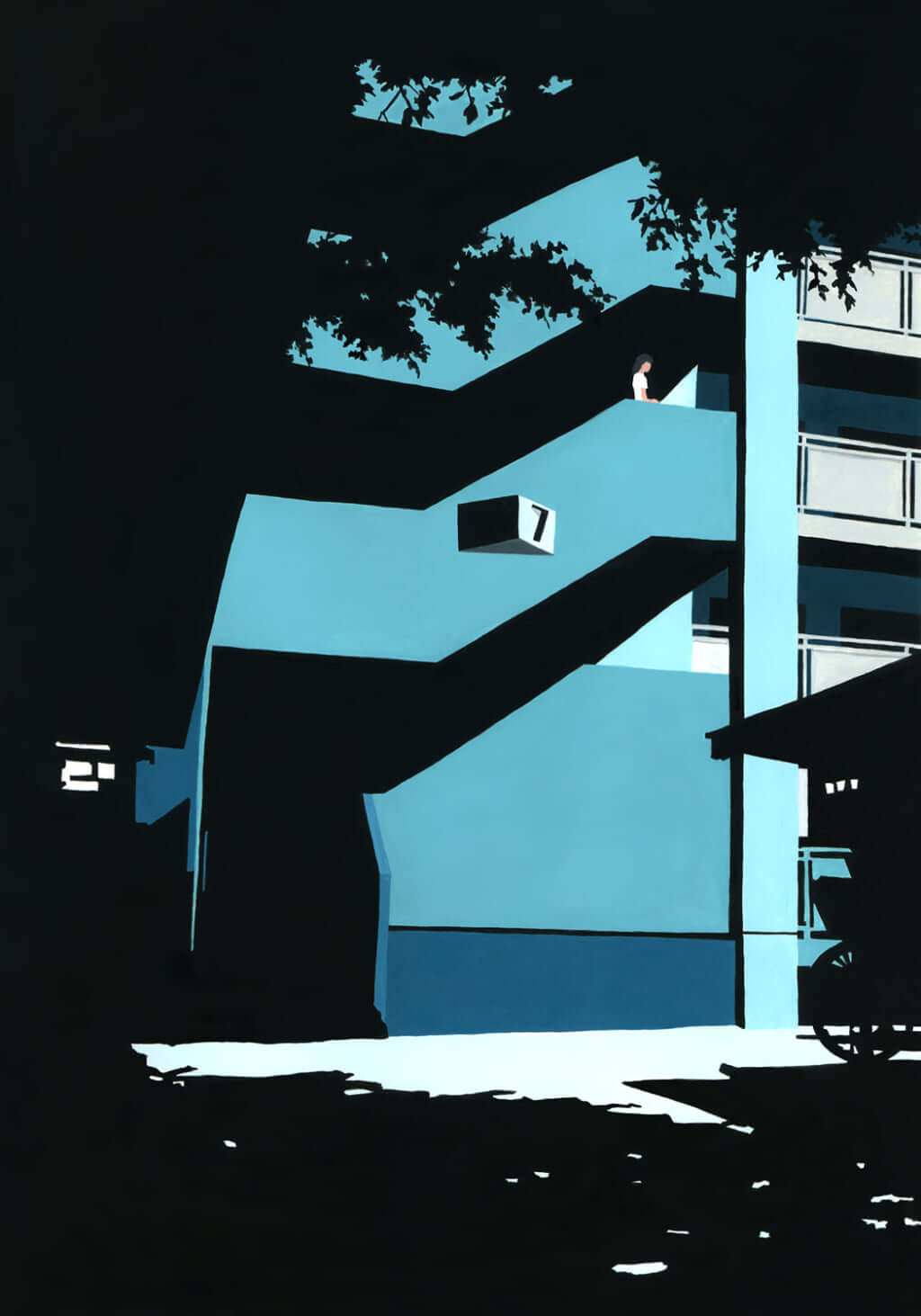 In order to achieve such poetic and serene illustrations, the artist always proceeds in the same way. During his walks, he captures a moment through the lens of his camera, develops the image and begins to give more substance to the scene through painting. Layers upon layers, he transposes a play of shadow and light to paper in minute detail, applying colour reminiscent of the paintings of David Hockney.