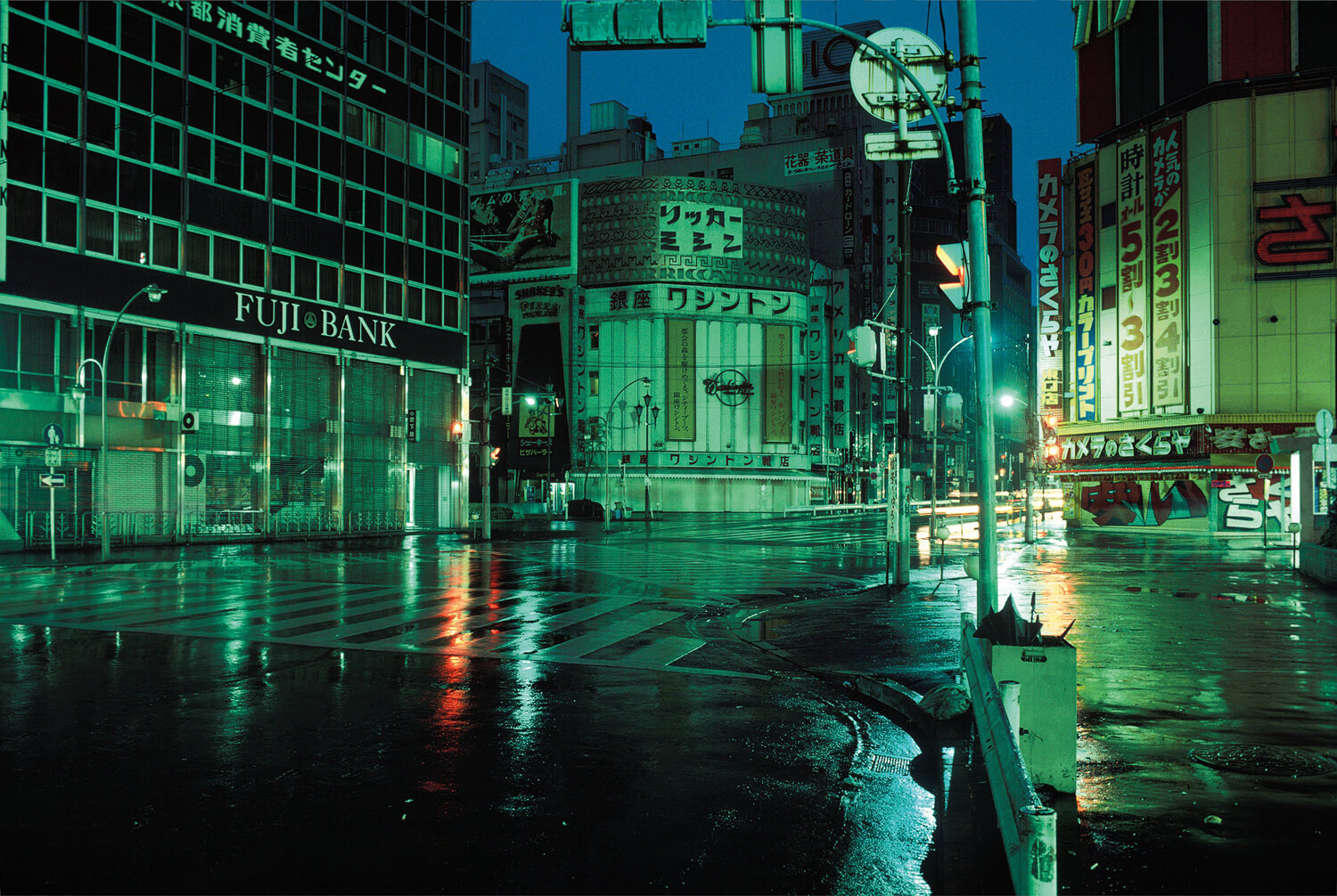 In the preface to the book, the photographer even describes his first impressions of the city as a trip into a science fiction universe. The photographs also have an aesthetic parallel with the cinematic world of Ridley Scott’s Blade Runner. The Shinjuku district, captured in a bluish and greenish light for example is strangely peaceful at 5 in the morning, far from the hustle and bustle of the neighbourhood today.