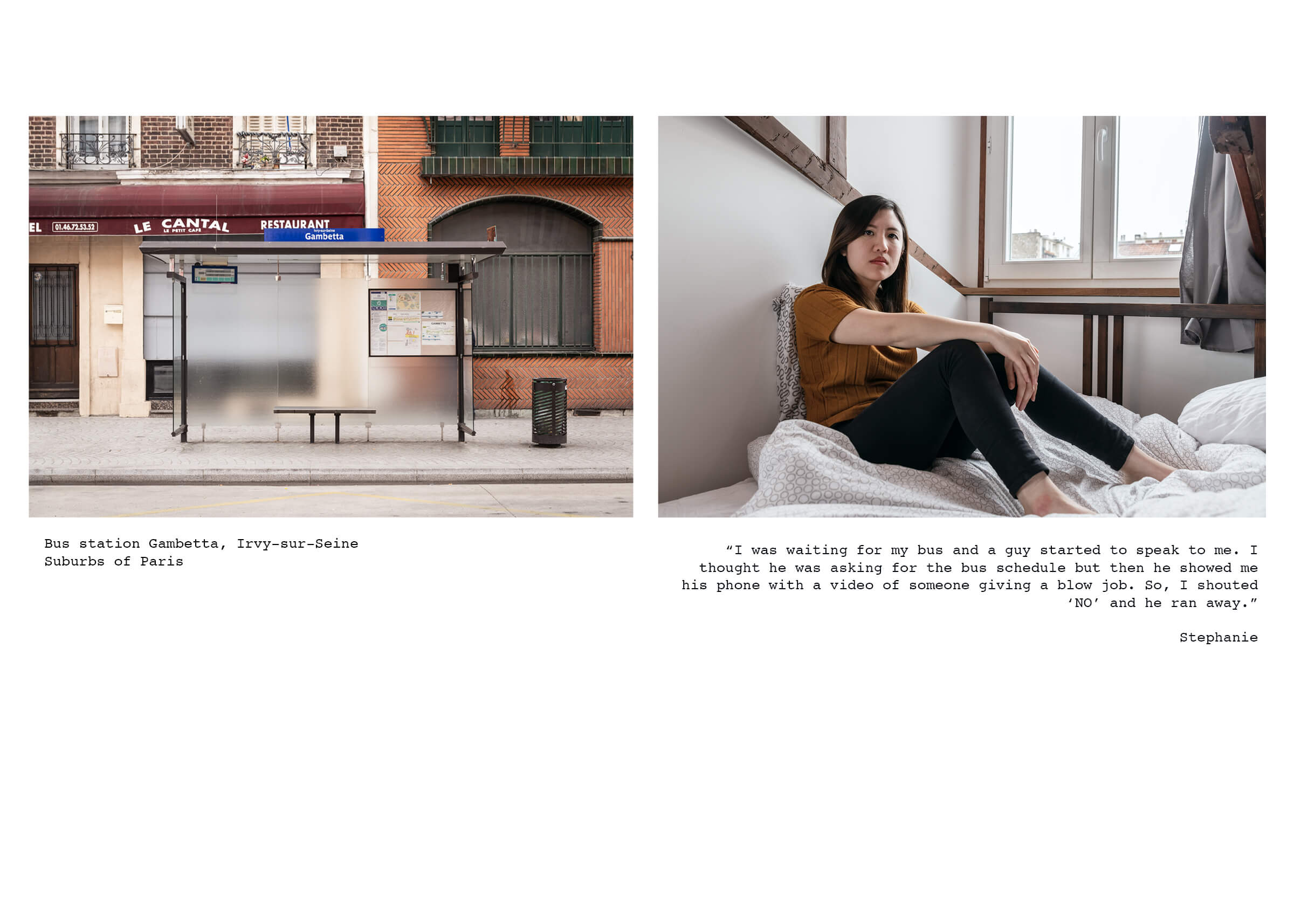 The project stages pictures of women, and the places where they were victims of harassment, side by side, accompanied by accounts given by the subjects.