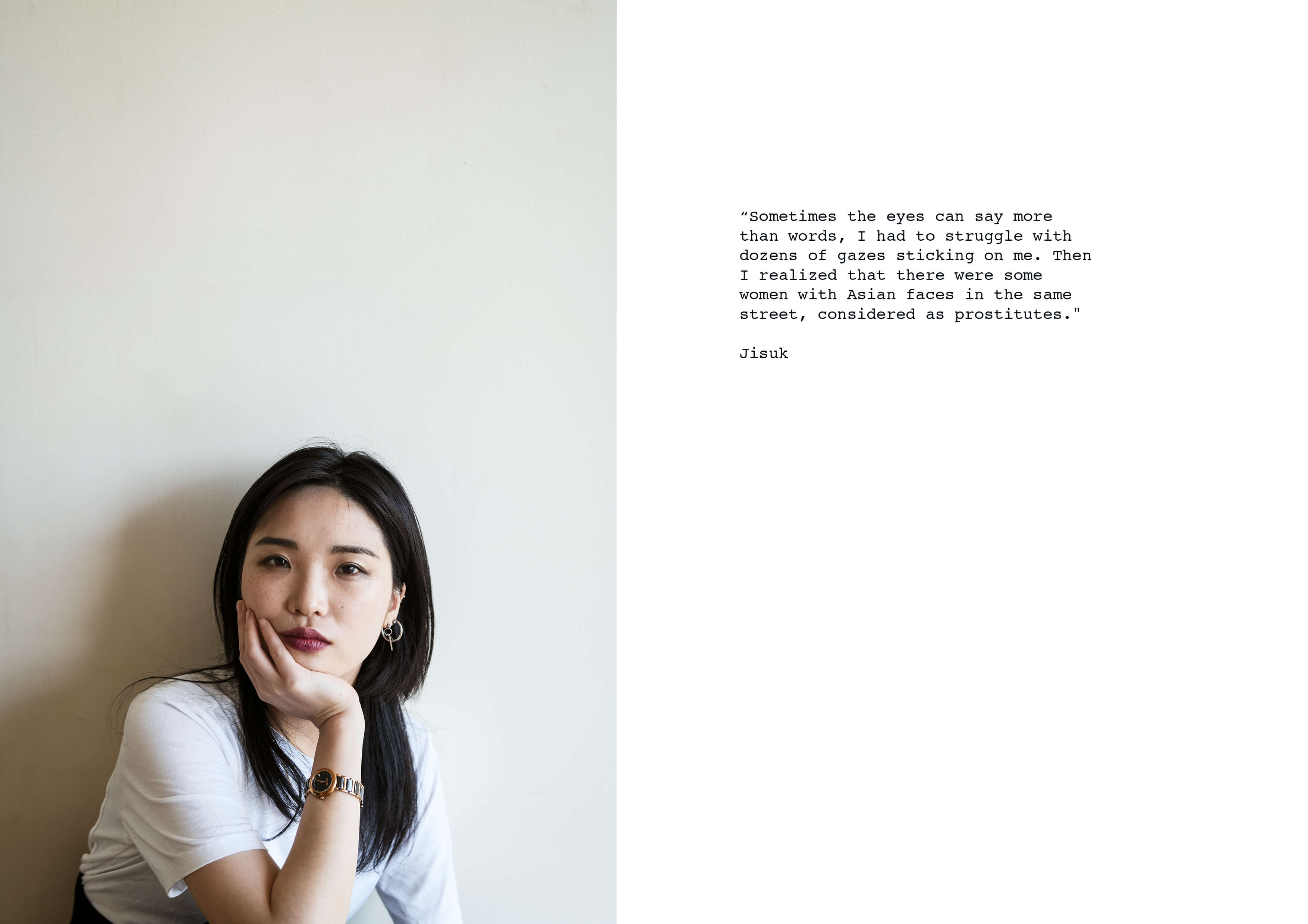 Beyond the phenomenon of harassment that Asian women experience in Paris, Hara wanted to highlight the clichés that they were subjected to, notably in places where sex work takes place, an industry that some Asian women are part of. She adds, ‘other stereotypes associated with Asian women contribute to the persistence of harassment.’ These women are considered to be ‘quiet and fragile, therefore are perceived as an easier target that won’t react. That is something that really encouraged me to pursue this work, break the silence, and speak up.’