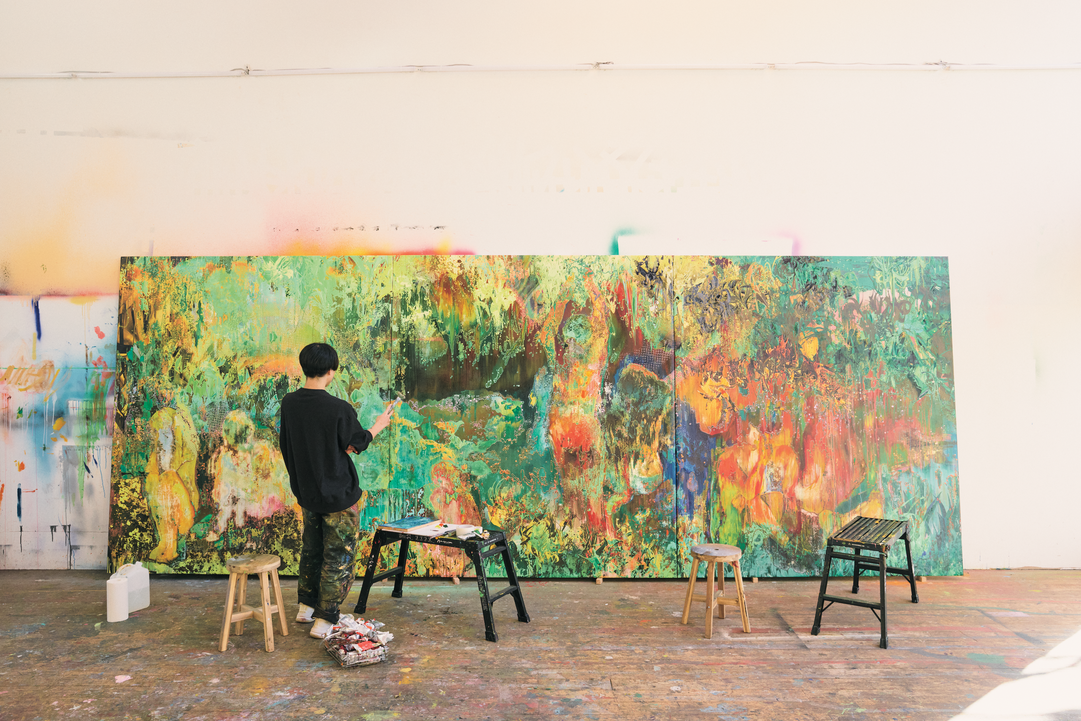While many children today gravitate towards video editing on their smartphones, Rei Nakanishi belongs to a generation shaped by image editing software. That early experience continues to influence his practice today, with much of his work taking the form of two-dimensional pieces. His process begins on Photoshop, where he composes his works digitally before printing them using UV technology. He then adds layer upon layer of paint by hand, blending the digital and the analog in a meticulous back-and-forth.