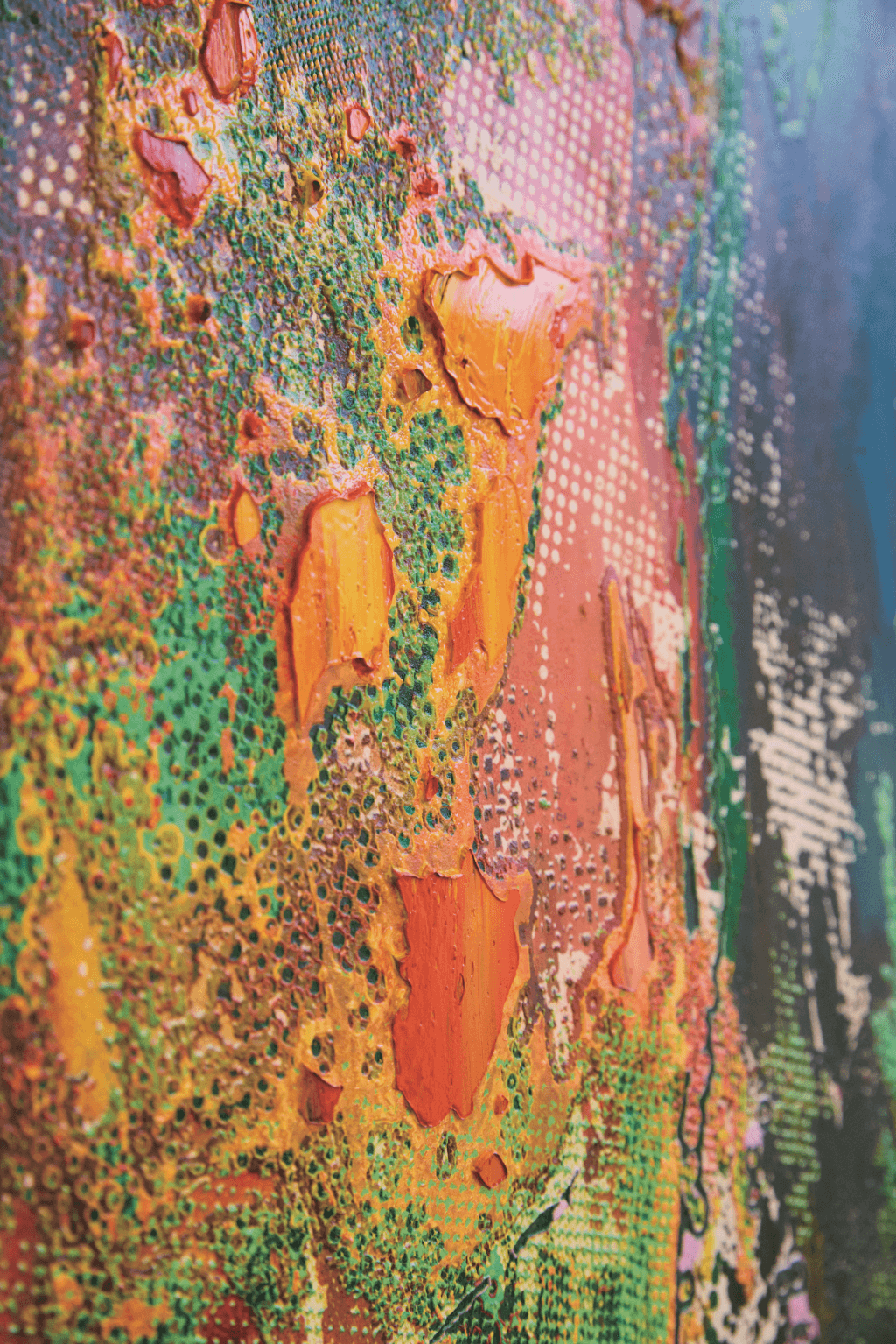 By layering brushwork over the UV-printed base, Rei Nakanishi creates a distinctive texture with uneven relief, one of the hallmarks of his practice.